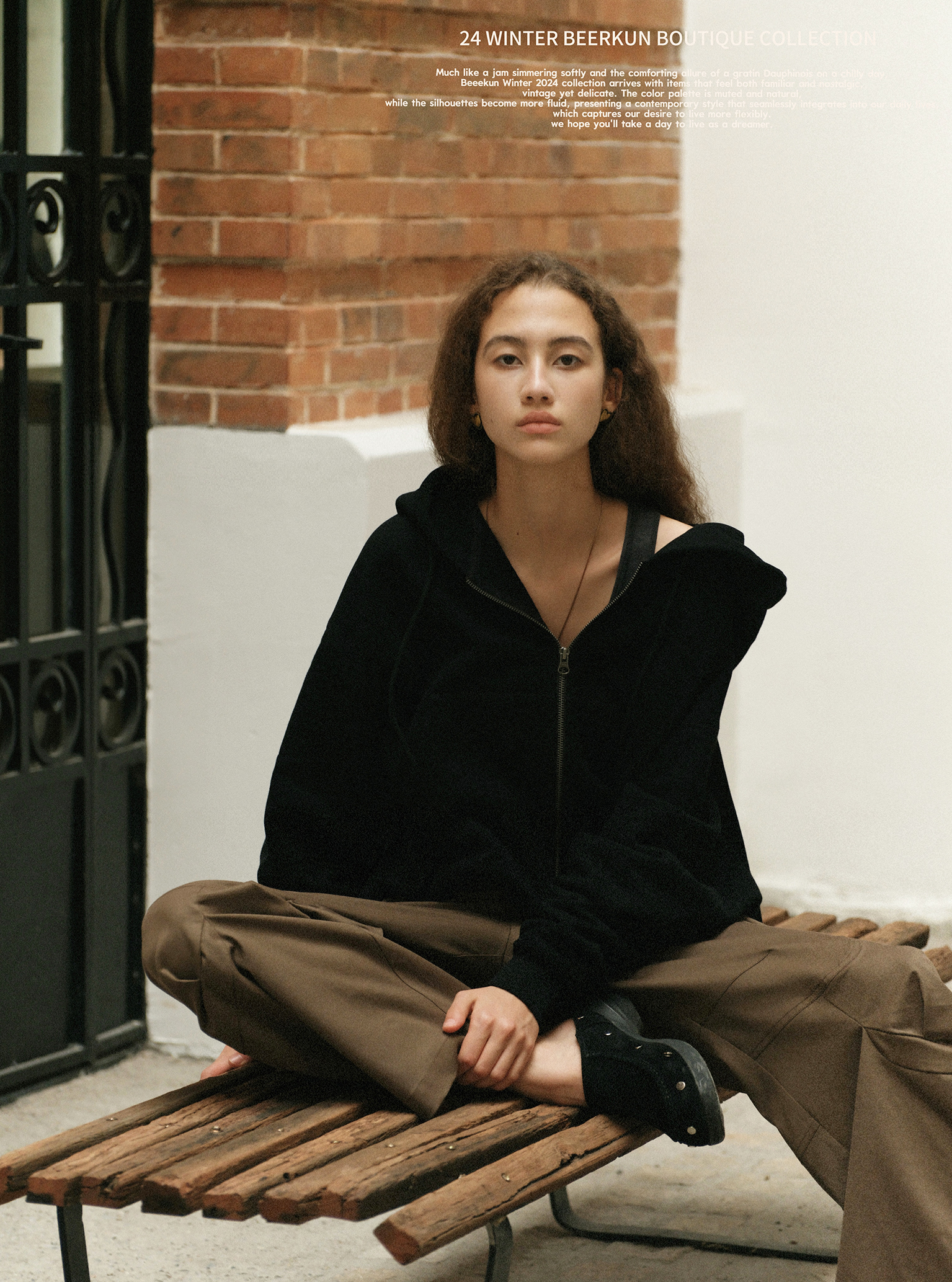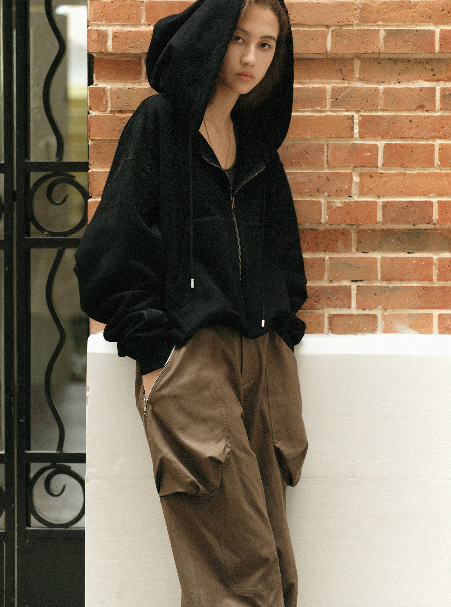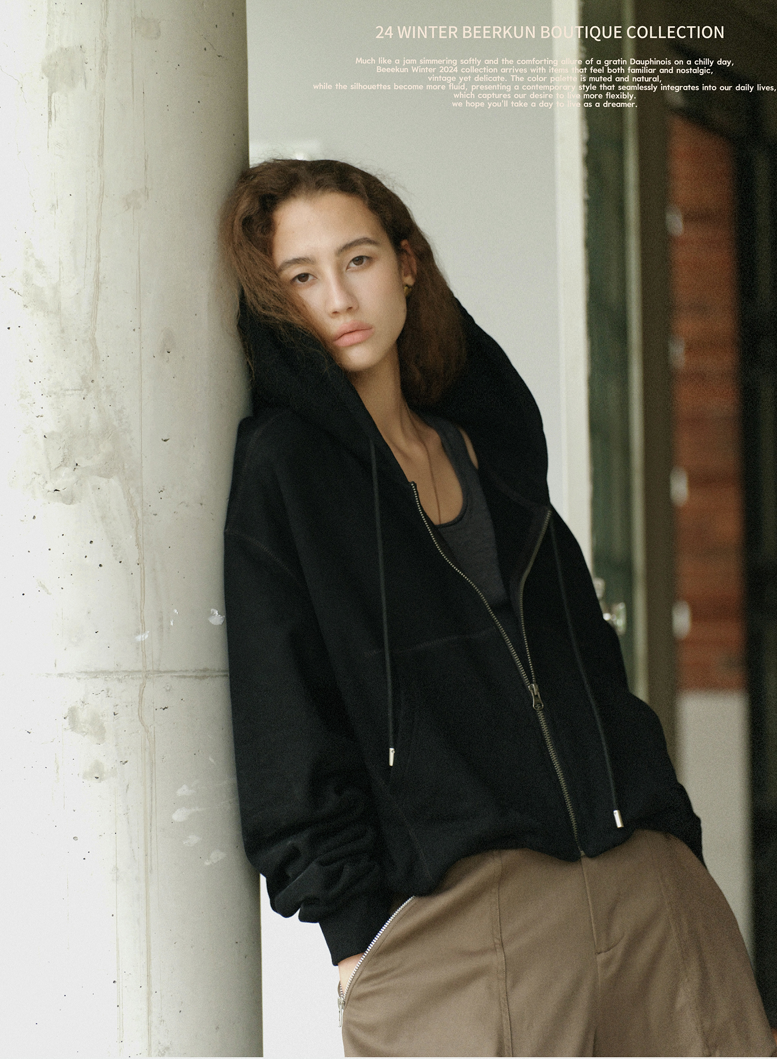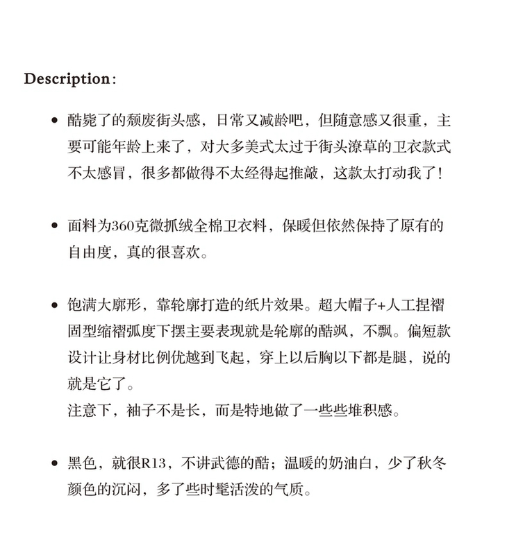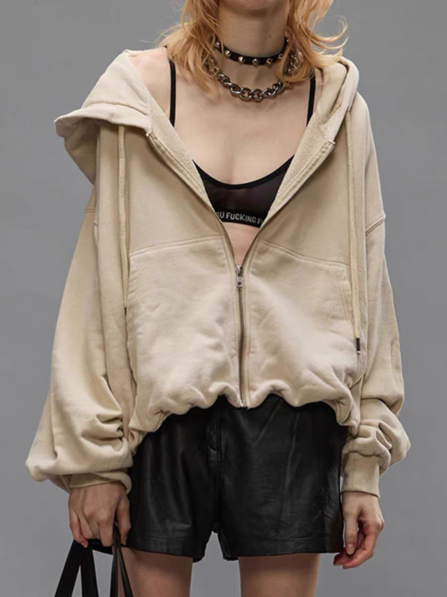 [特价]磨毛水洗轻加绒 重工捏褶戴帽卫衣 100%棉 黑色/奶油色