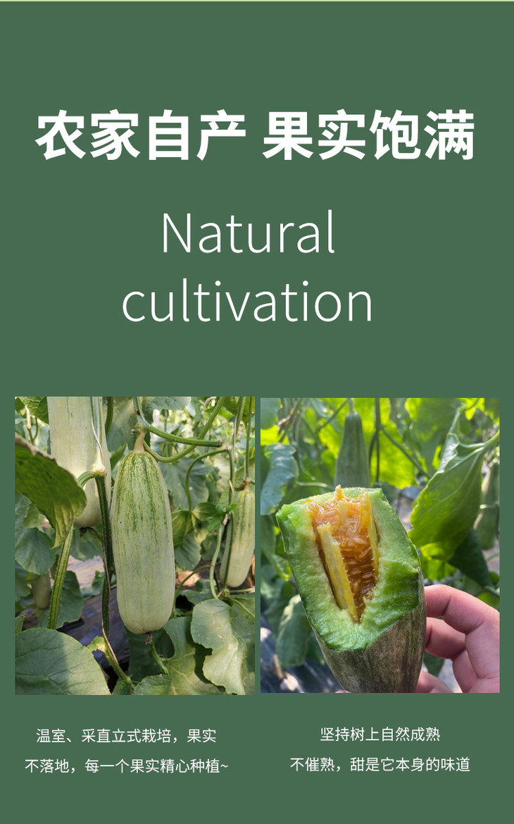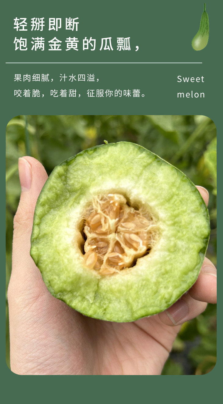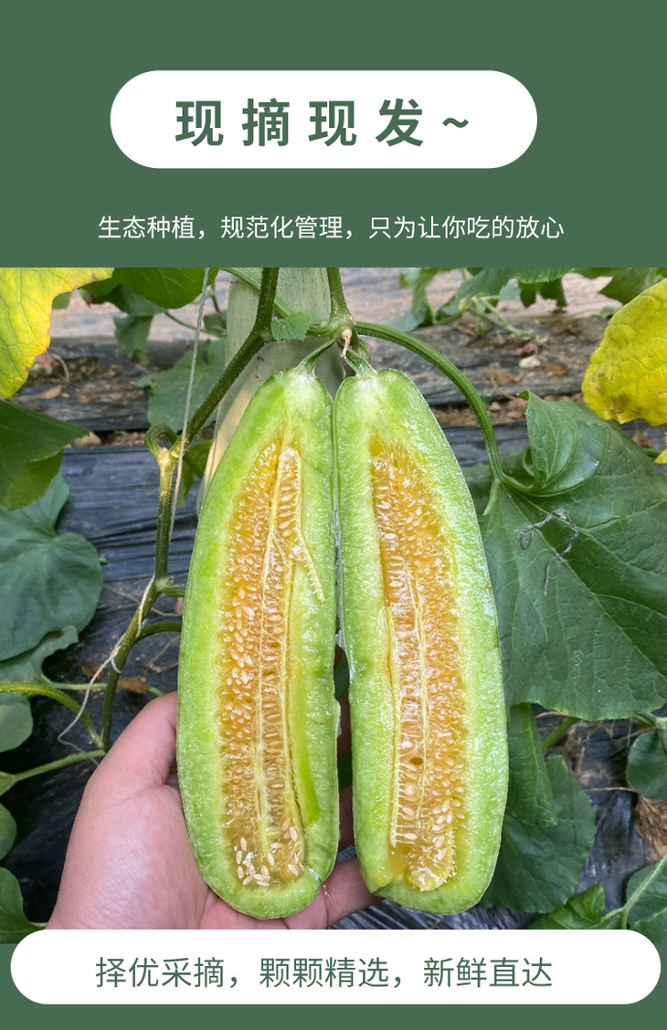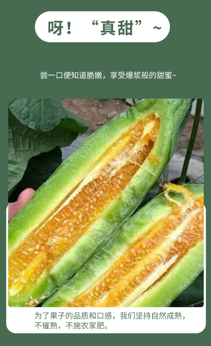 要提醒下,因为采摘下来比较生,所以收到当天直接吃可能会不太甜,但是放几天就会甜了哦!因为中间部分太甜了,有的人会辣喉,就是有时喝蜂蜜也会的那种,可以喝点盐水缓解一下。然后,甜瓜有的人会有过敏反应的,记得把皮上的毛毛洗干净哦!