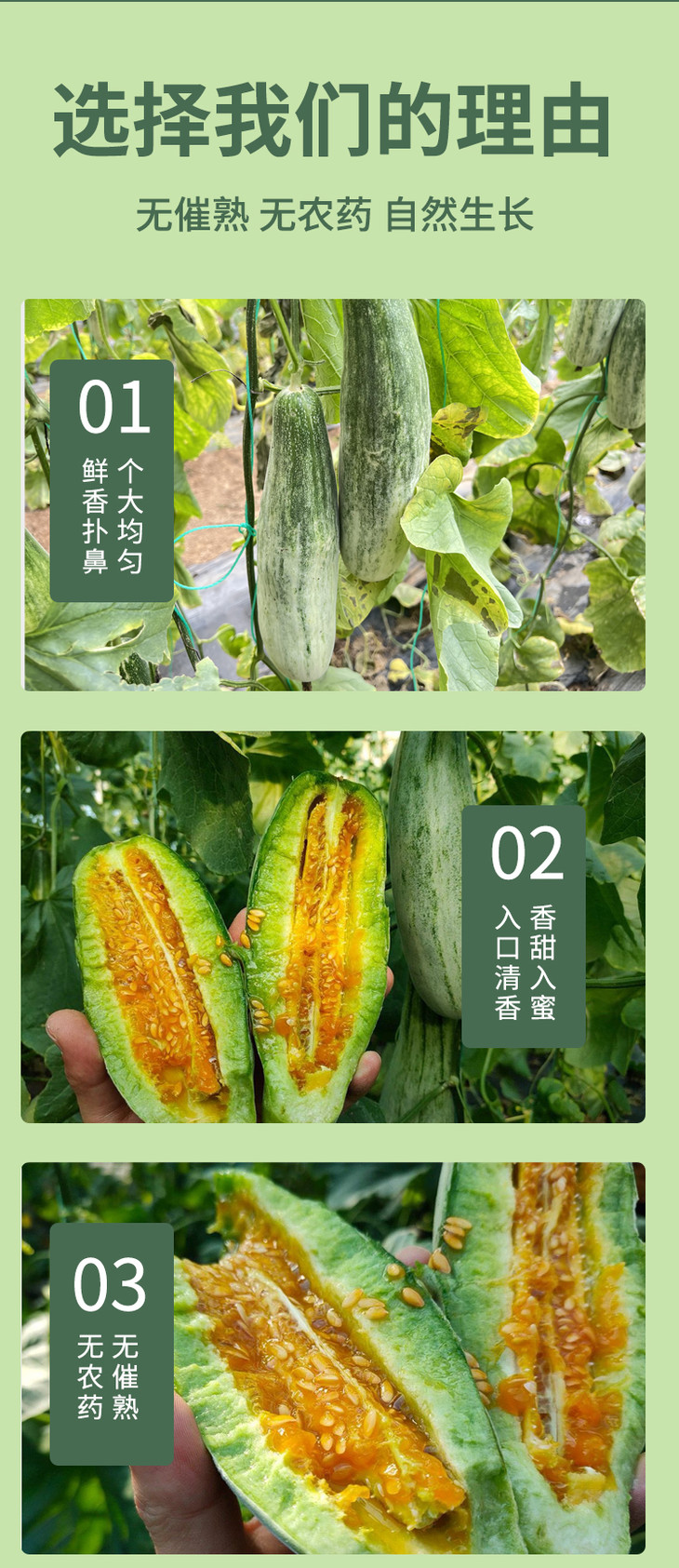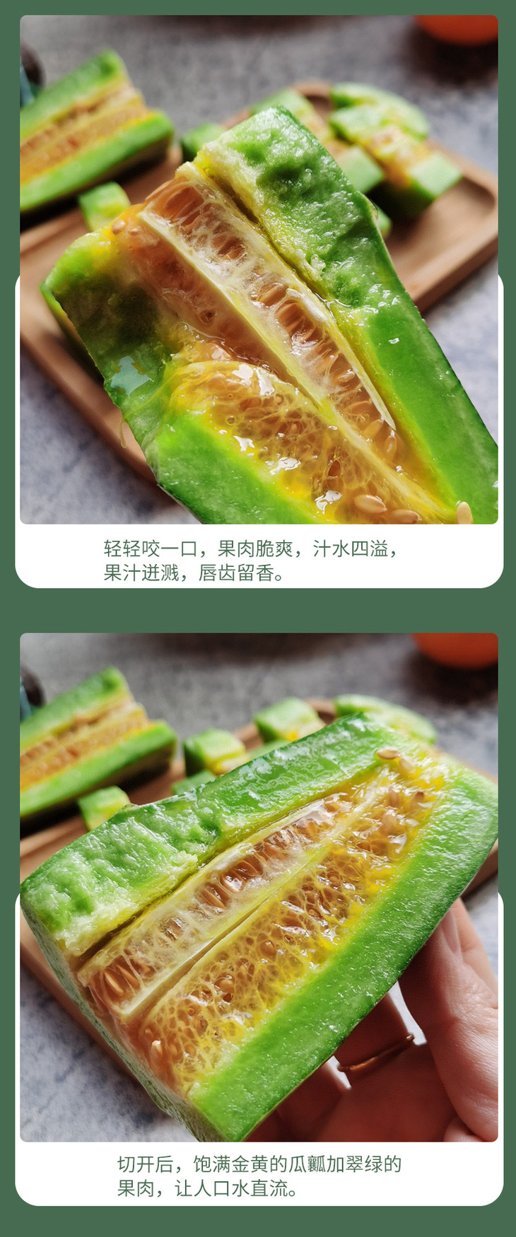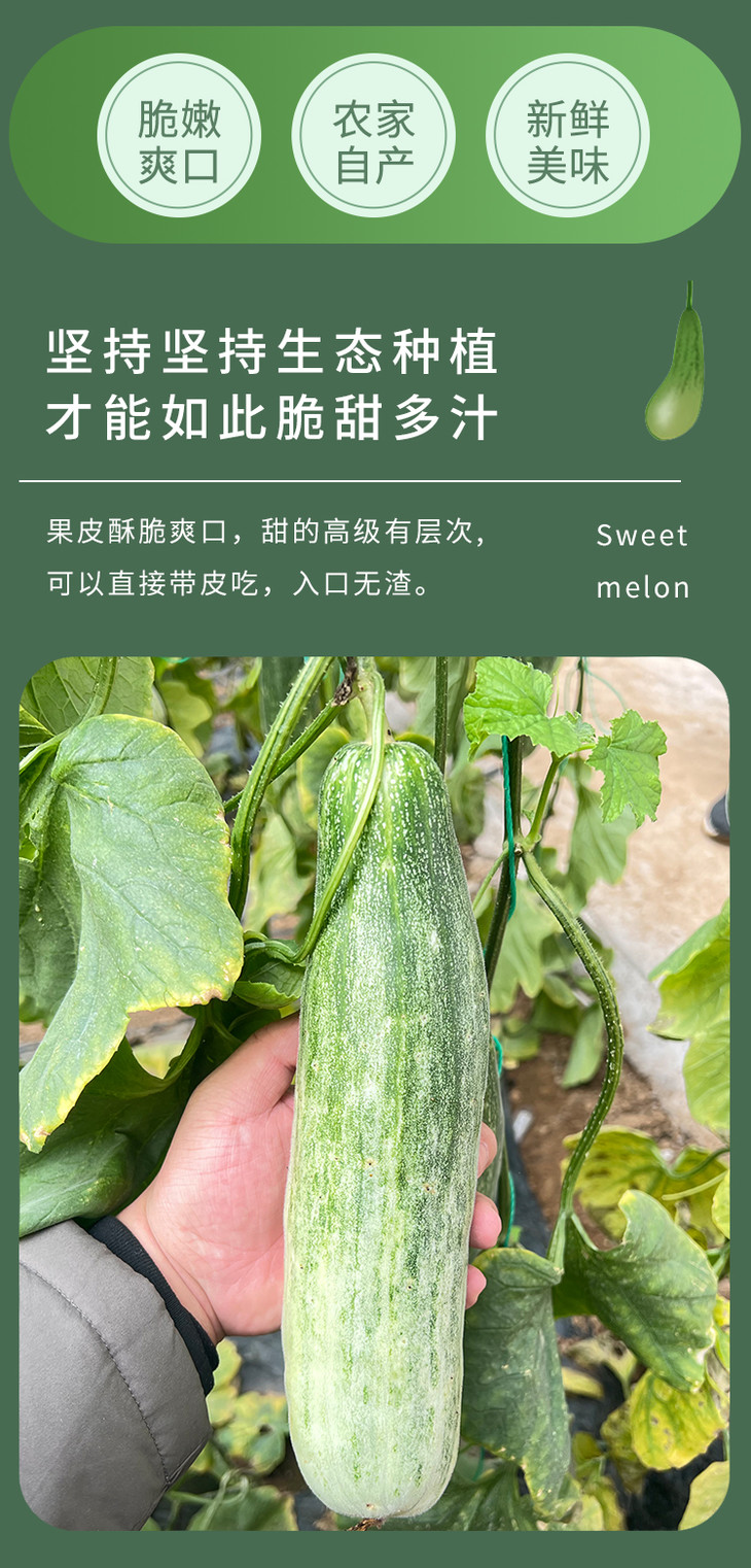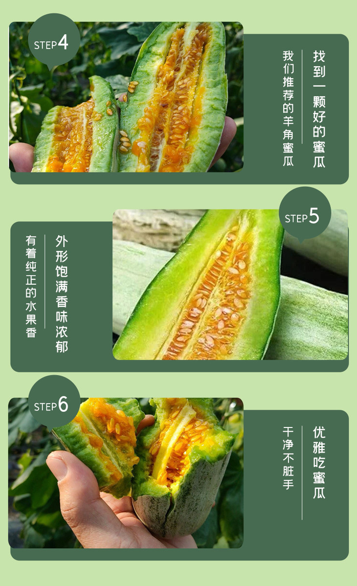 要提醒下,因为采摘下来比较生,所以收到当天直接吃可能会不太甜,但是放几天就会甜了哦!因为中间部分太甜了,有的人会辣喉,就是有时喝蜂蜜也会的那种,可以喝点盐水缓解一下。然后,甜瓜有的人会有过敏反应的,记得把皮上的毛毛洗干净哦!