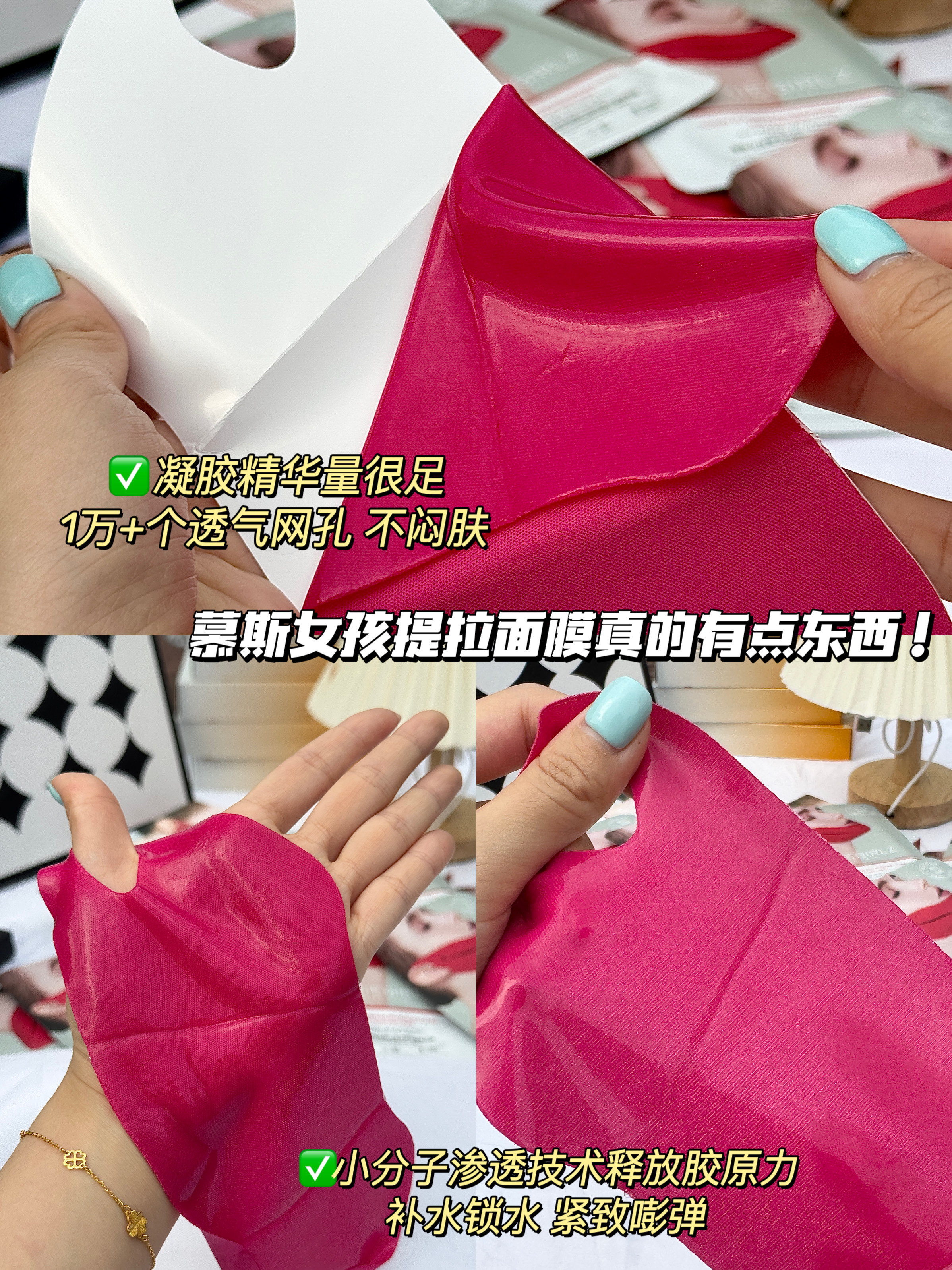 而且使用起来真的超级简单的,根本不用花费浪费时间,里面的膜布富含多种胶原,可以牢牢吸附在脸上并且能够被脸上吸收!!