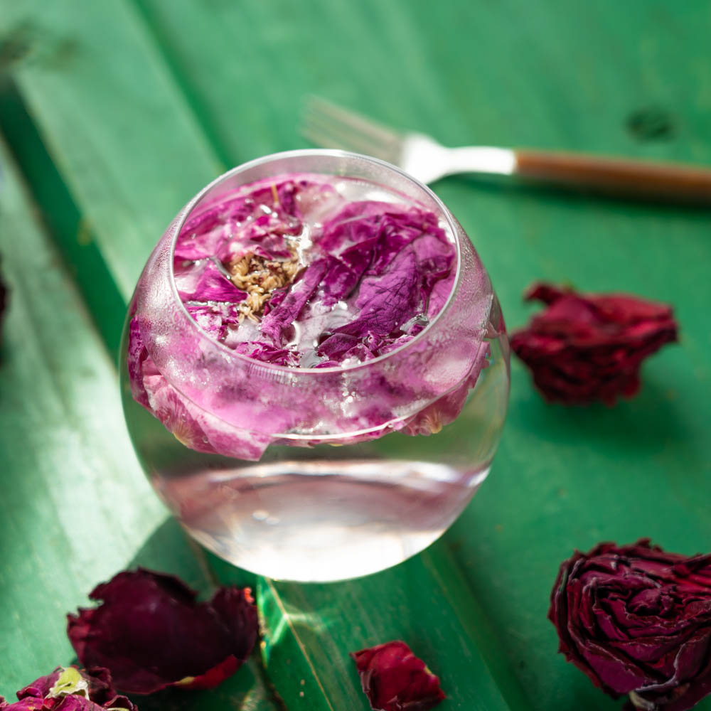 【冲泡方法】刚开始冲泡时水沿杯壁注入杯子,可用筷子或者勺子压一压,使玫瑰花朵充分浸入水中。