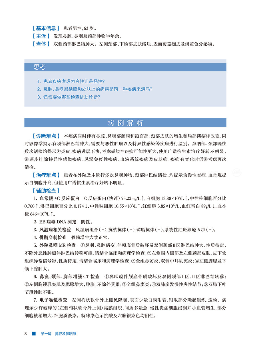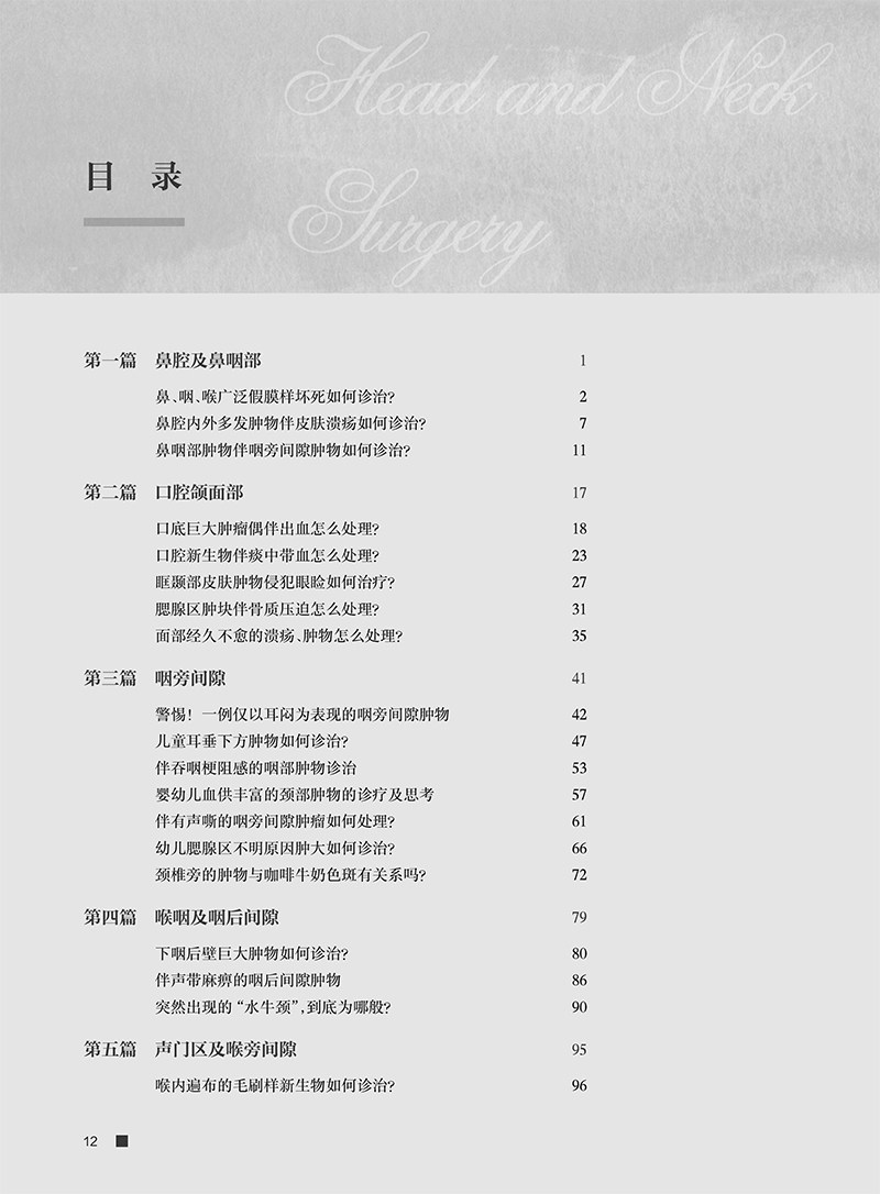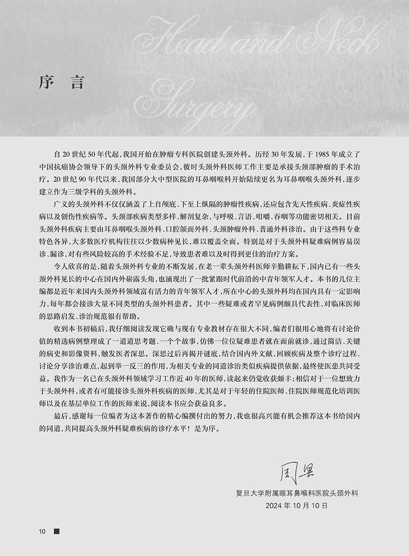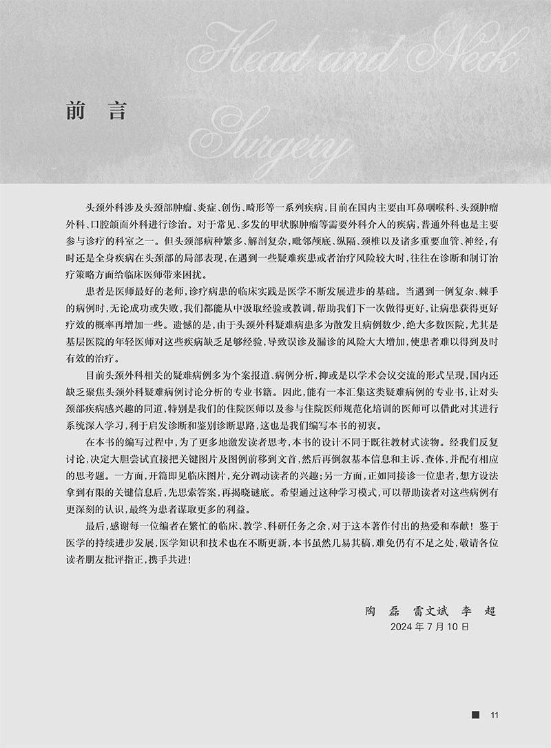 本书精选近3年来颇具讨论价值的20例疑难病例,其均来自复旦大学附属眼耳鼻喉医院头颈外科中心及国内优势头颈外科中心。每一病例按病史简介、思考、病例解析、讨论四个环节编写。编写从患者简要病史出发,引发诊疗难点的3个核心思考问题,病例解析环节围绕3个问题对诊断难点、治疗难点、治疗经过、最后诊断、随访及转归进行介绍,讨论环节结合关键检查结果,进行了详尽的病因回顾、临床表现回顾、术前评估手段回顾、治疗策略回顾。本书旨在通过环环相扣的病例解析,帮助读者以书中病例为依据举一反三地解决临床中的类似问题。