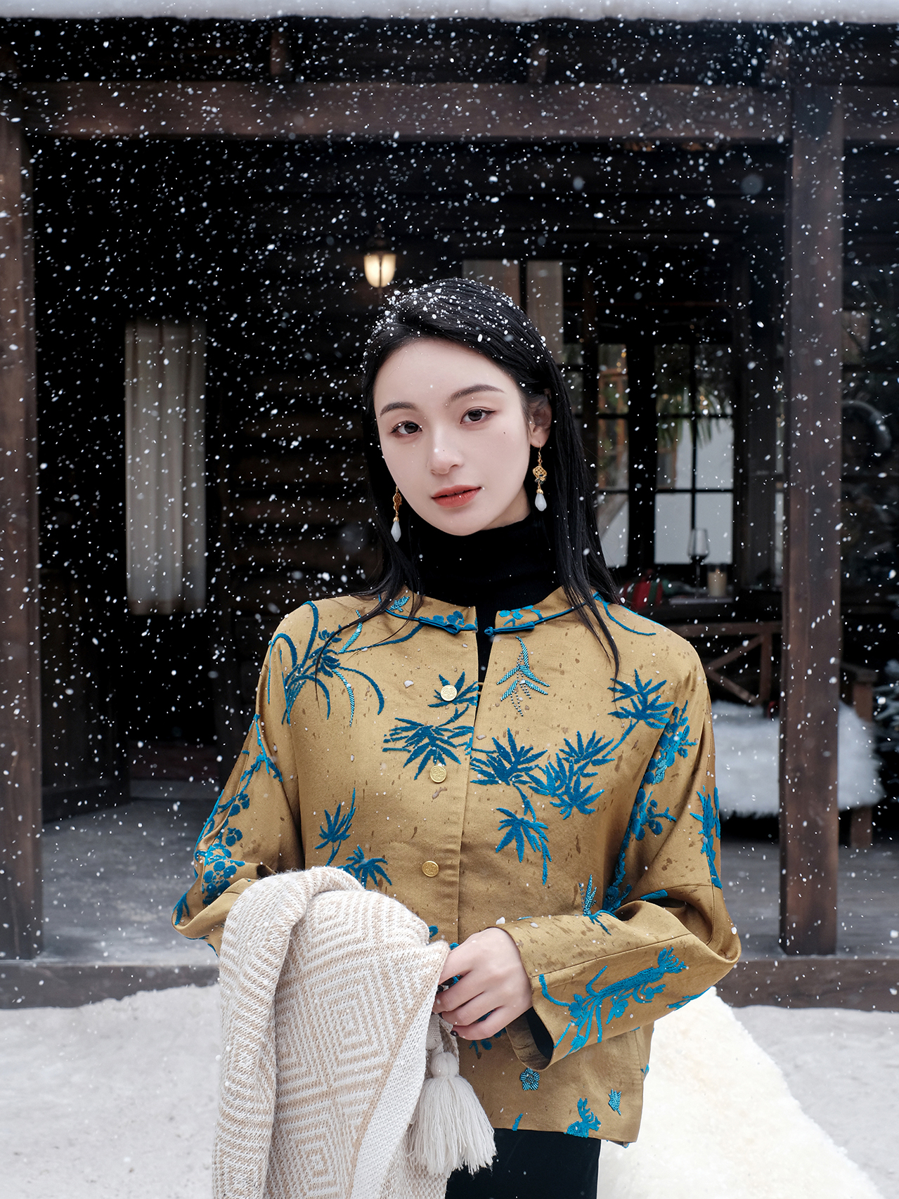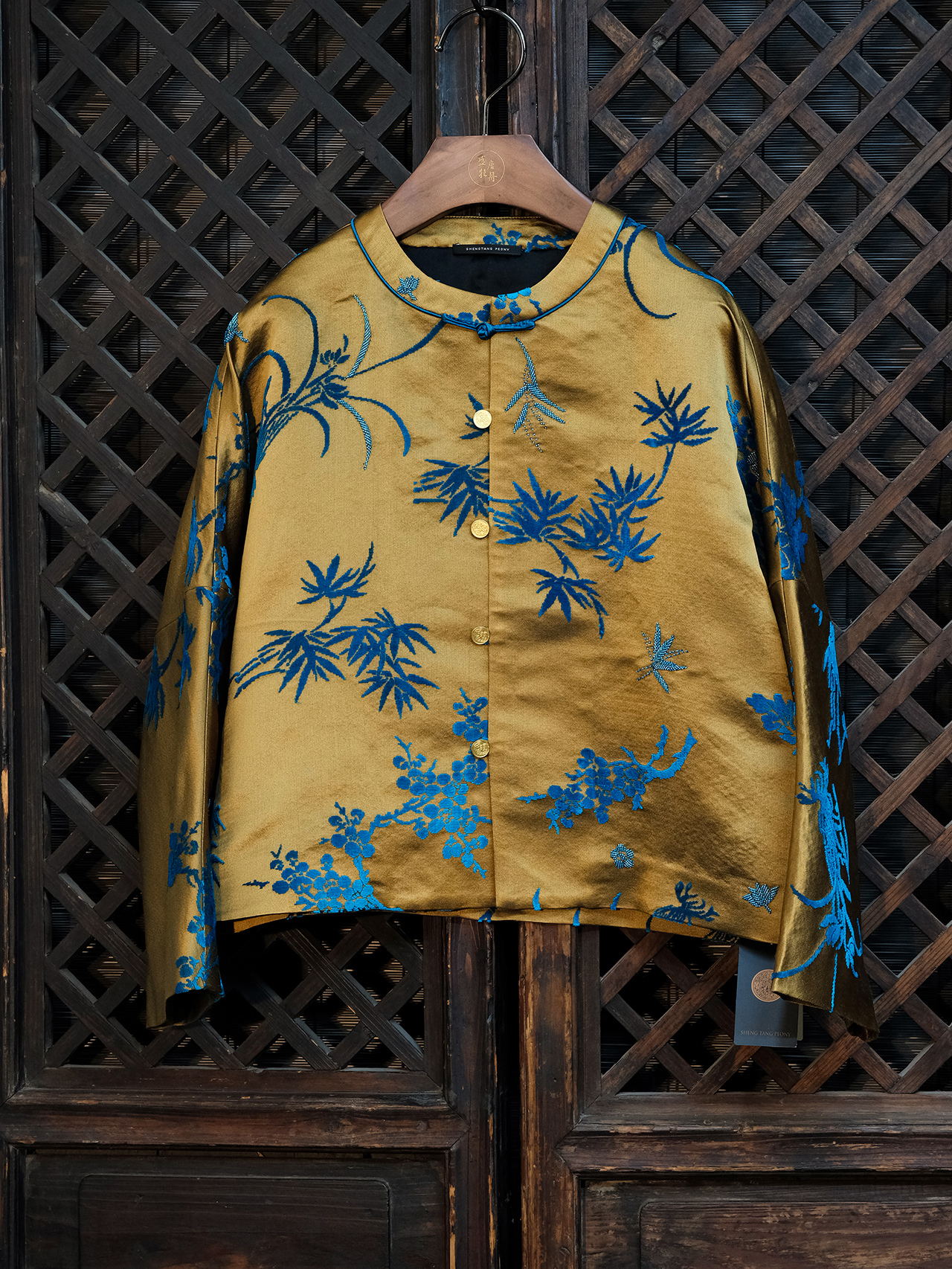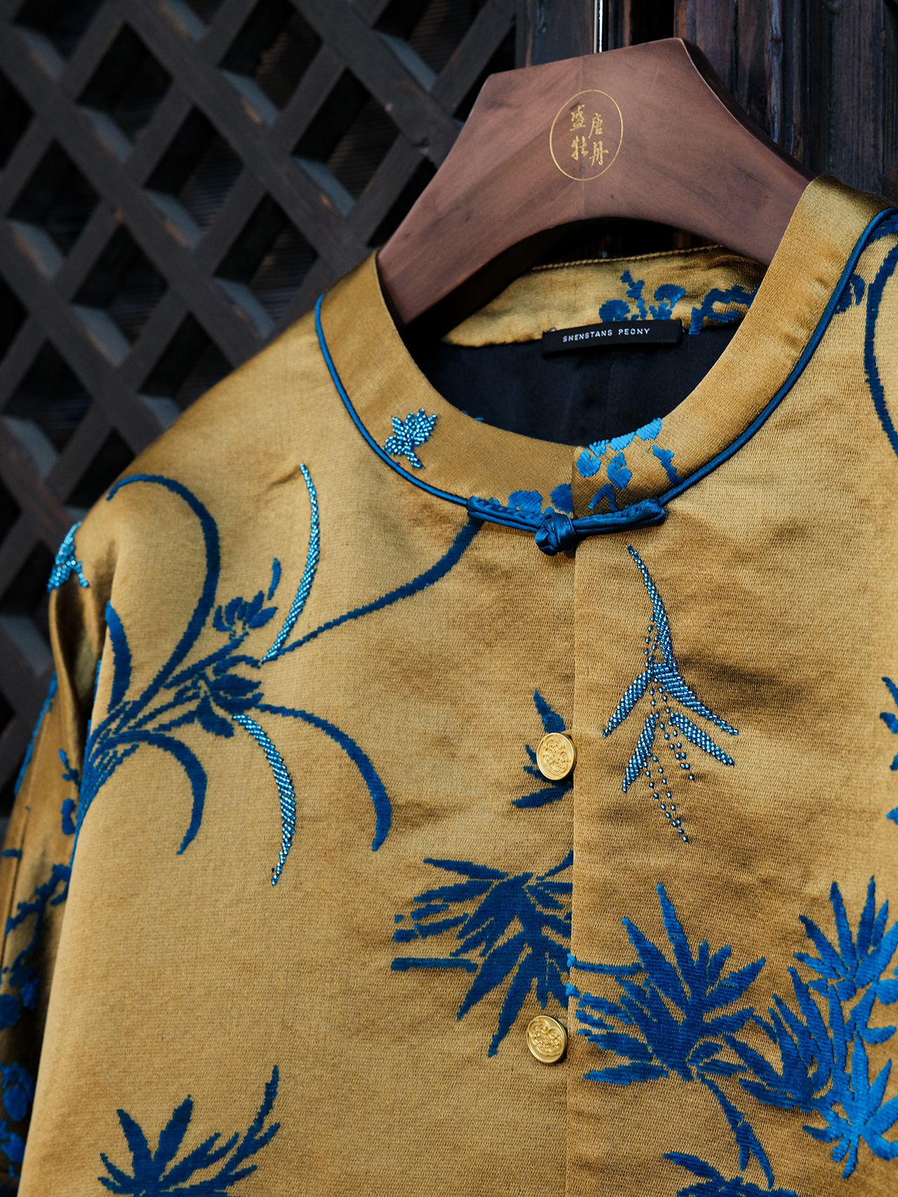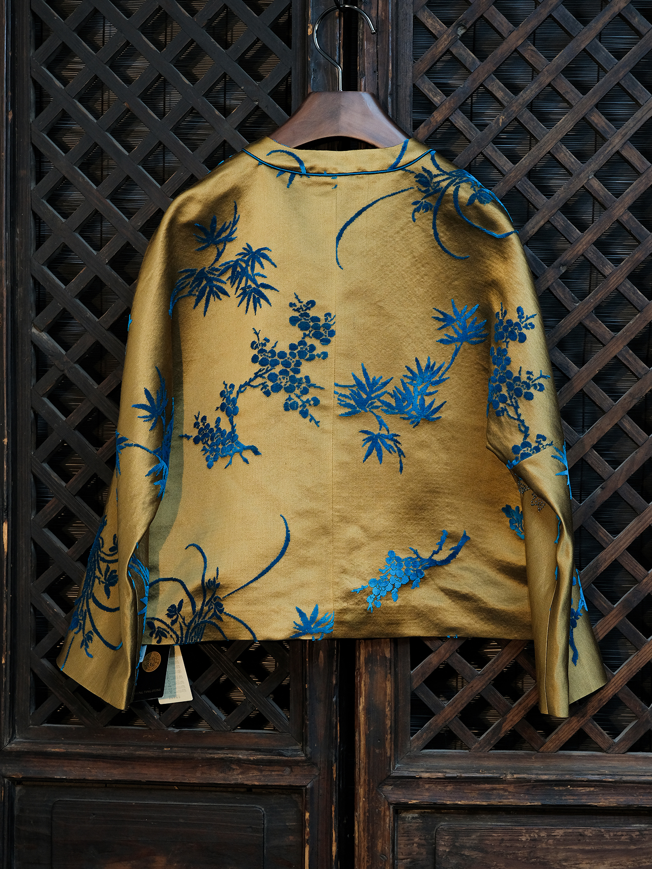 盛唐牡丹| 琥珀黄底色真丝漳绒外套-钉珠款(钉珠花纹随机)