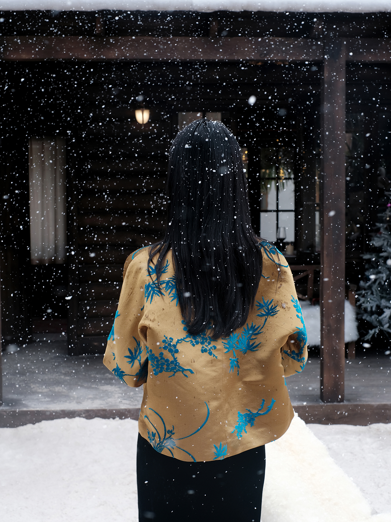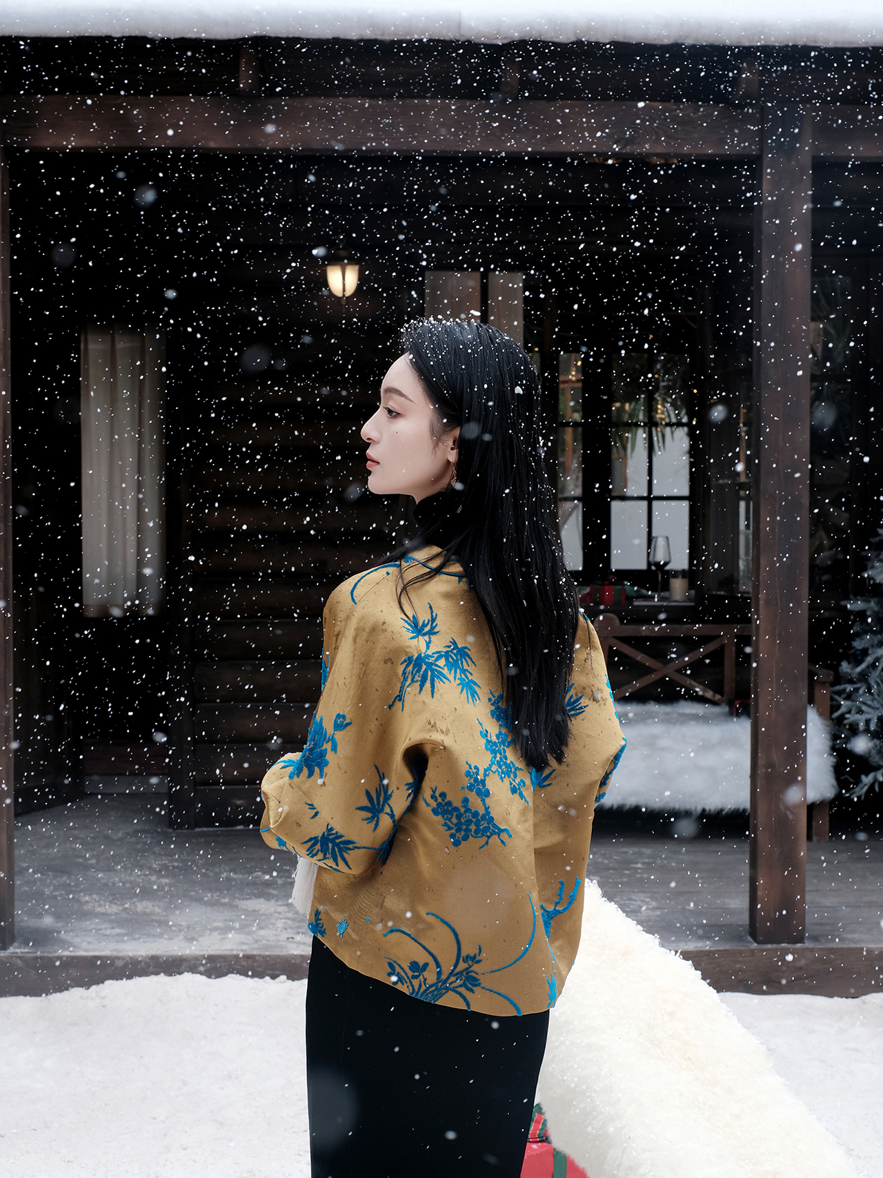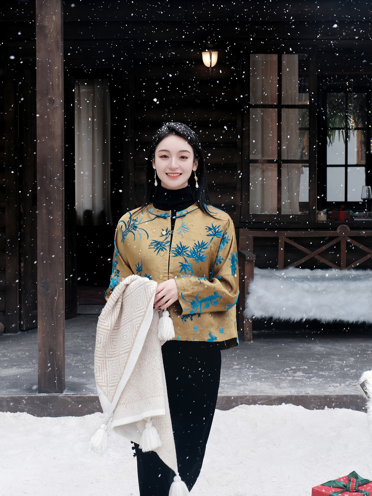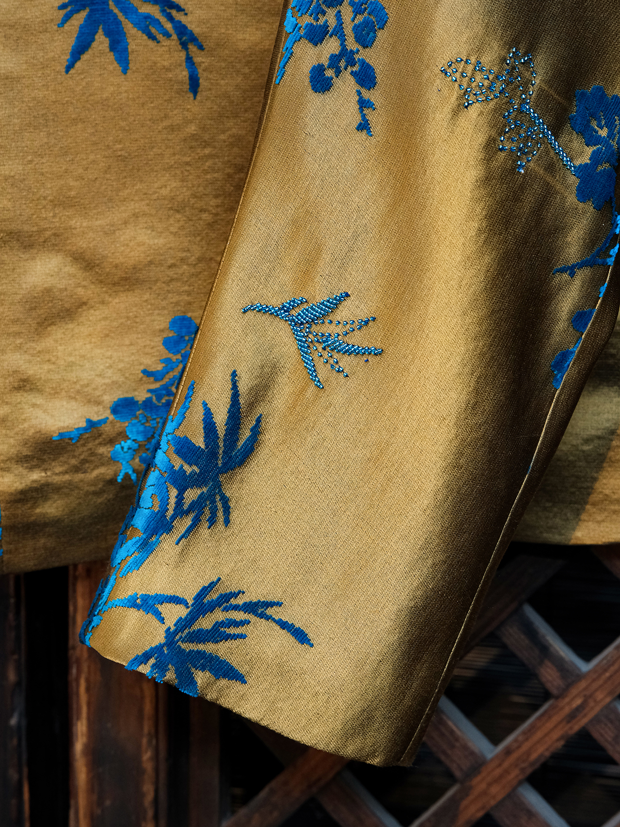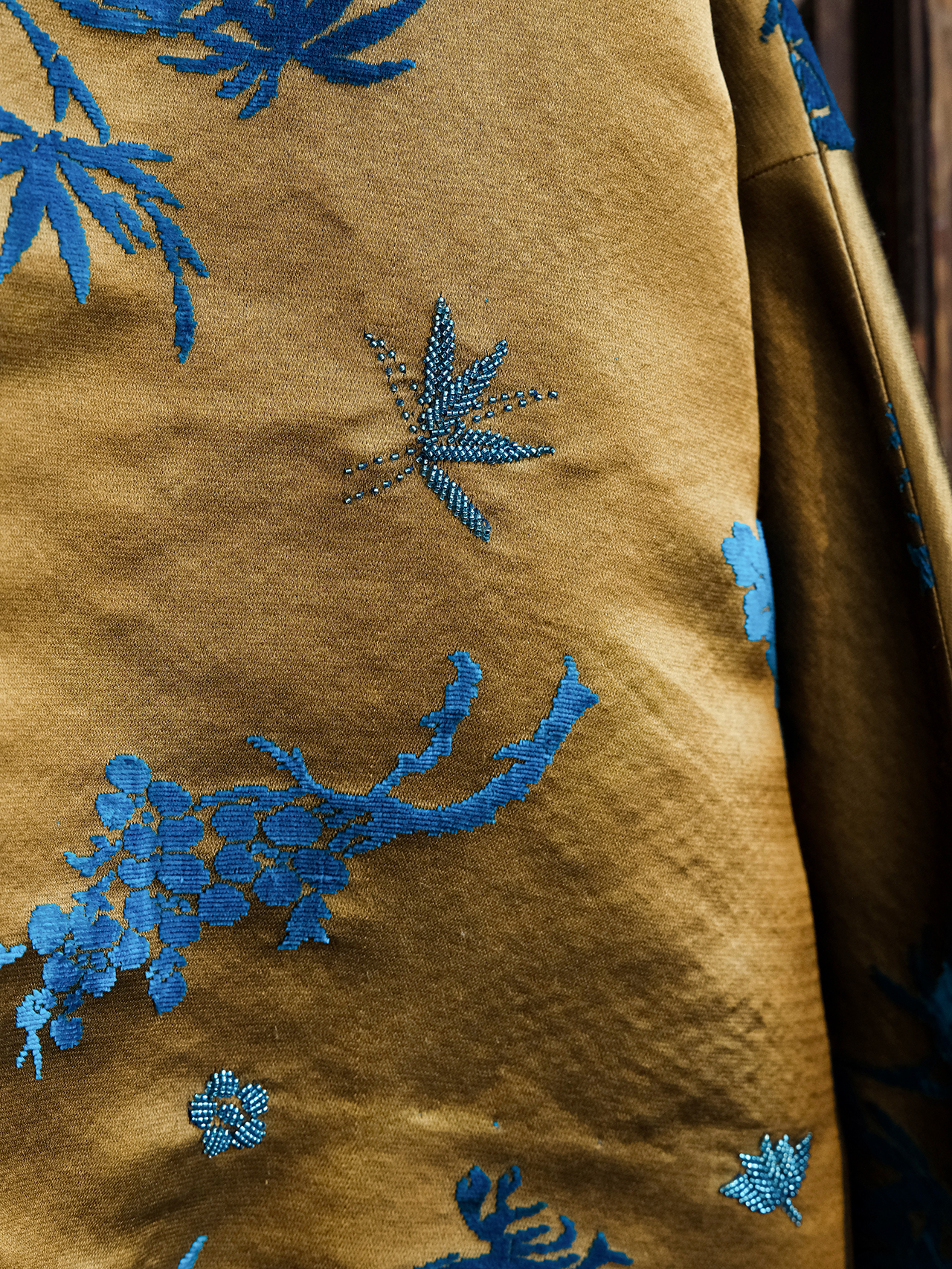 盛唐牡丹| 琥珀黄底色真丝漳绒外套-钉珠款(钉珠花纹随机)