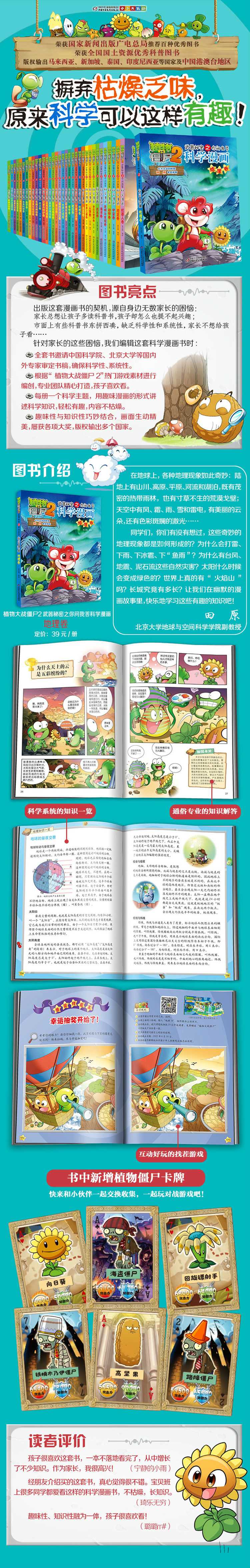 同学们,你们有没有想过,这些奇妙的地理现象都是如何形成的?为什么我们有四季交替?为什么会打雷、下雨、下冰雹、下“鱼雨”?为什么有台风、地震、泥石流这些自然灾害?太阳什么时候会变成绿色的?世界上真的有“火焰山”吗?世界上有会旋转的大楼吗?长城究竟有多长?哪里的湖水是粉红色的?海面下还有巨大的洞穴吗?魔鬼城中真的有鬼哭狼嚎的魔鬼吗?和你们一样,红袋鼠、火帽子、跳跳蛙和“植物大战僵尸”游戏中的主角们也对这些地理现象充满了好奇。他们打闹着、嬉笑着,快乐地学习着。让我们同他们一起,在一个个幽默的漫画故事里,快乐地学习这些有趣的知识吧!
