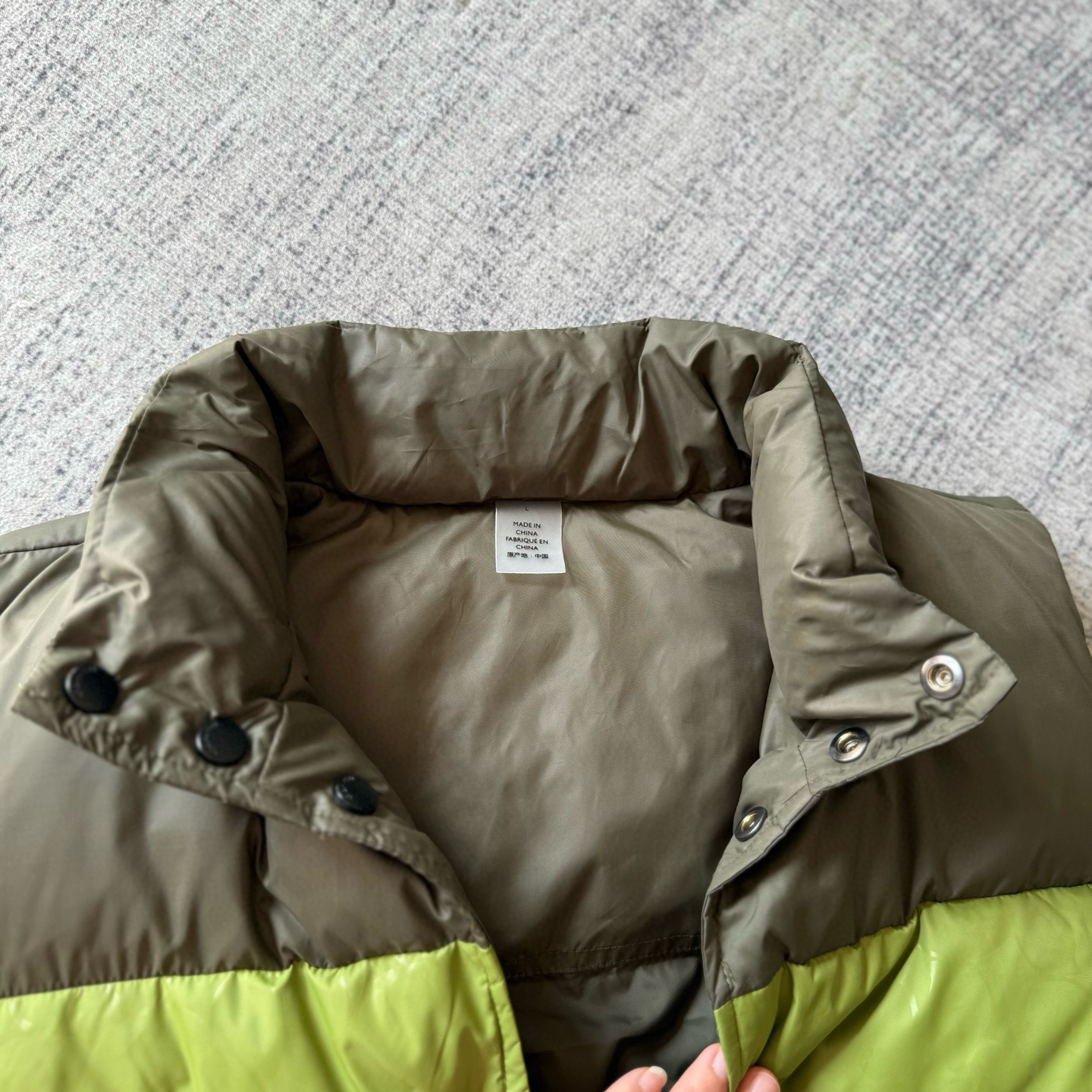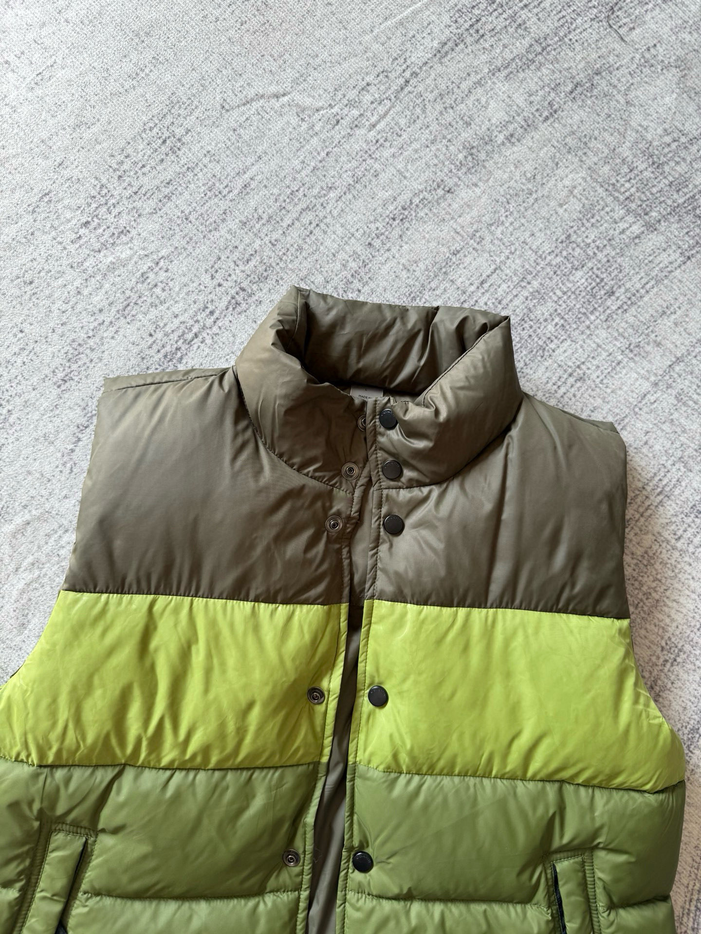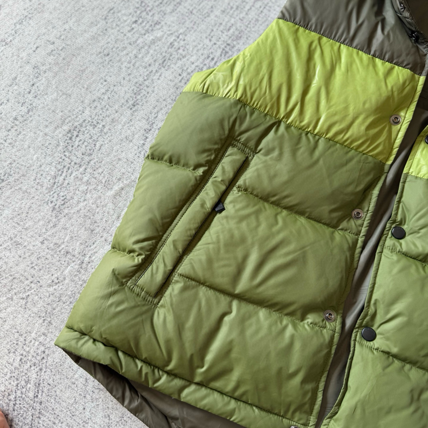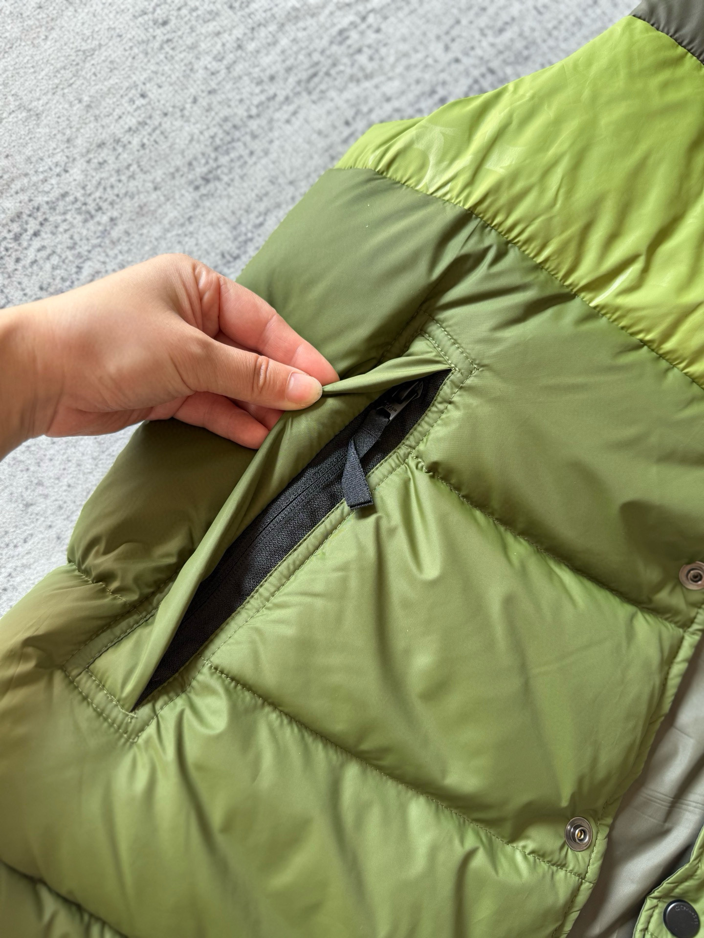 男士双面拼色立领羽绒背心休闲叠穿保暖!面料100 聚酯纤维 里料100 聚酯纤维 填充物 1:90%白鸭绒 10% 白鸭毛 填充物 2:100 聚酯纤维 不包括装饰部分 纽扣开合 拉链袋,立领设计,填充高品质羽绒,保暖力满分!外层防撕裂尼龙,耐用又抗风,秋冬穿超合适器。军绿色+芥末绿撞色,简约又有层次感休闲通勤都能轻松驾驭。正面拉链口袋,收纳方便实用又时髦!高领的版型,不用围围巾也能很好的为脖子保暖。胆布升级,高标准的400弹力胆布,8号金针绗绒,针眼扎下去能快速回弹,牢牢的锁住羽绒,不会出现钻绒跑绒的问题。内里填充90白鸭绒,240克高克重的充绒量。大朵鸭绒蓬松保暖。化身小暖炉守护兄弟们的温暖。进口滴油四合扣,一扣一拉之间清脆好扣,内里纯色面的一面有独特的字母绣花,穿起来更实穿。