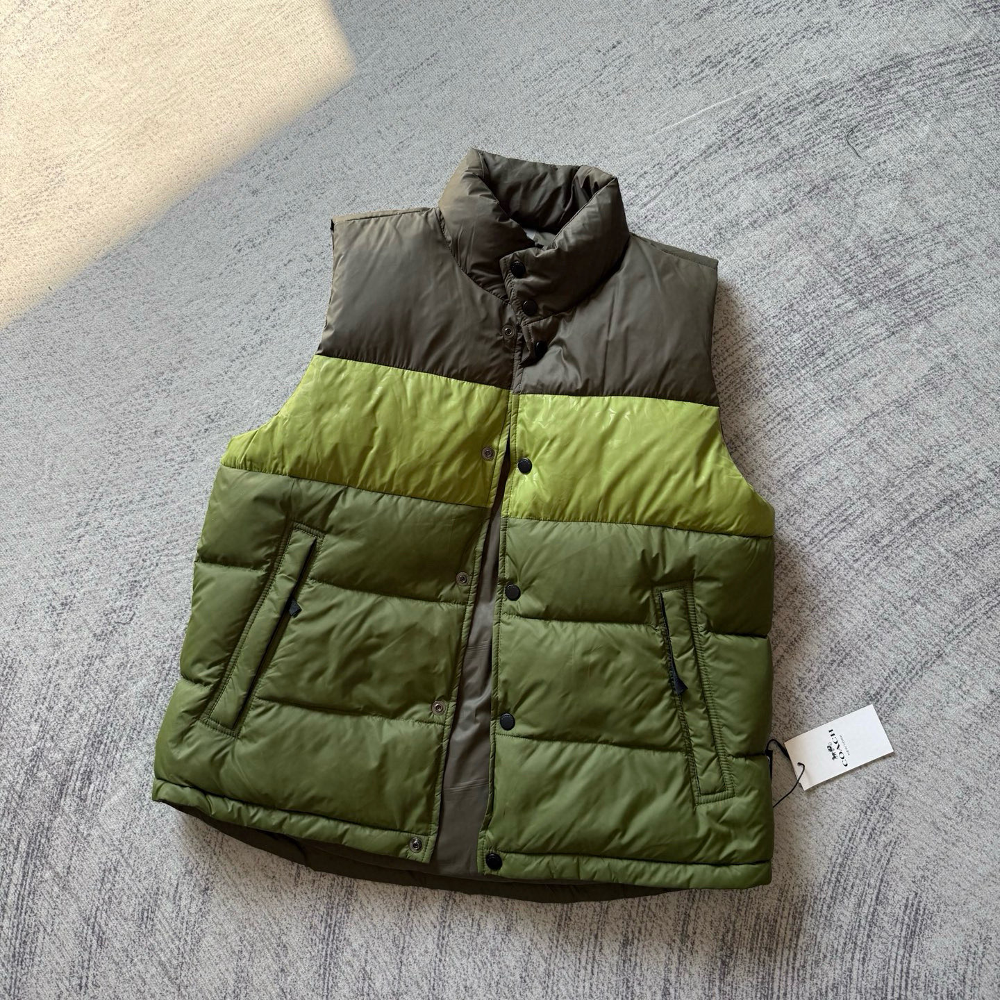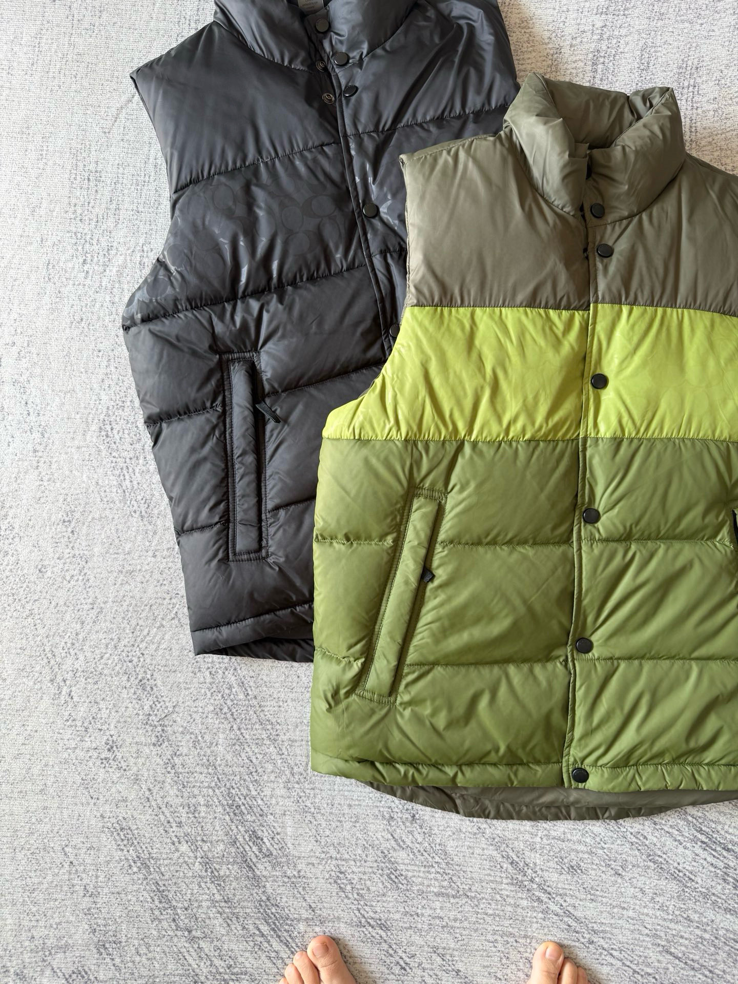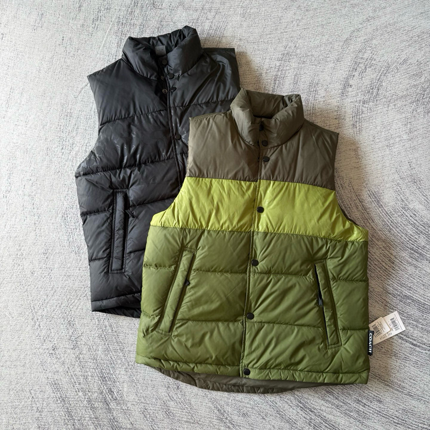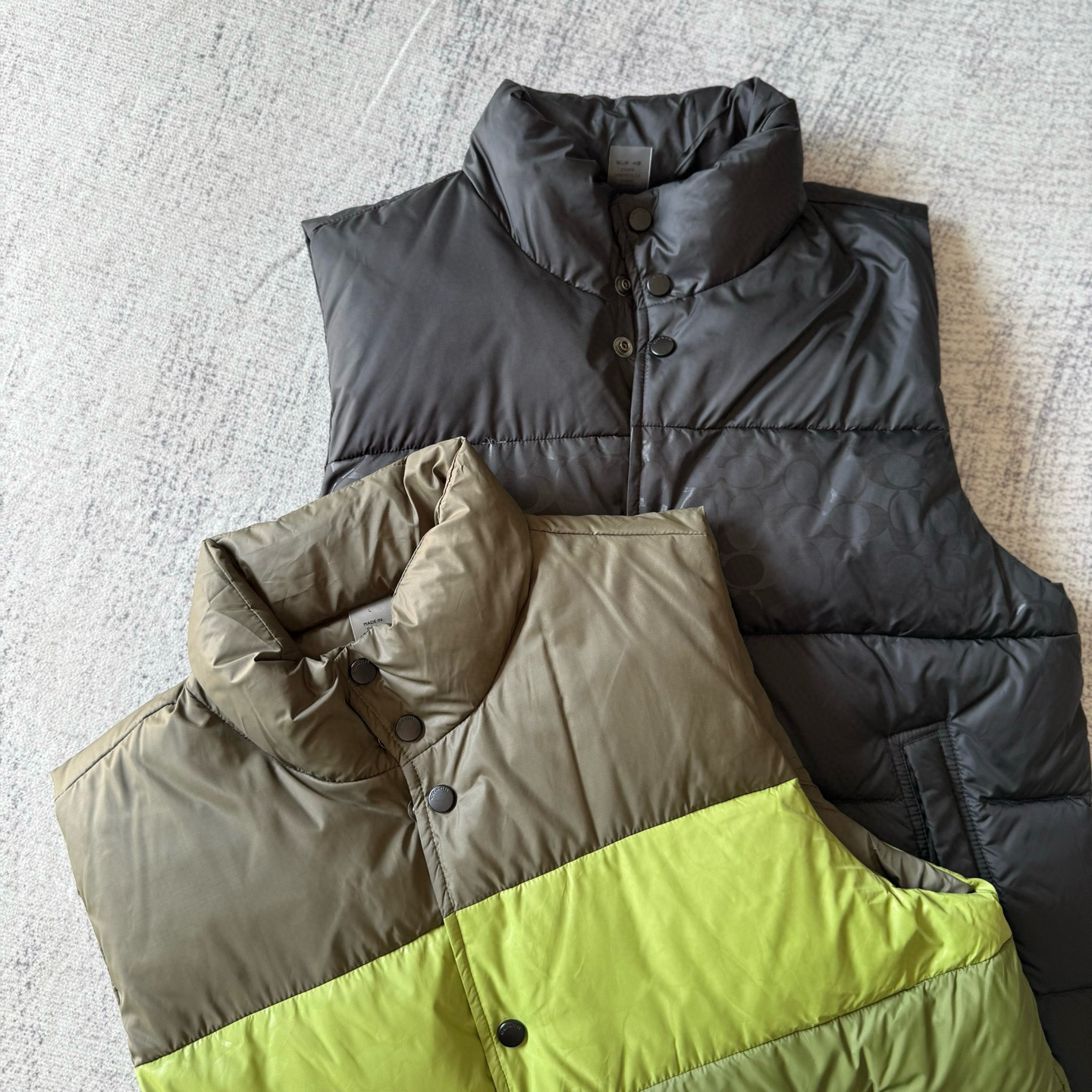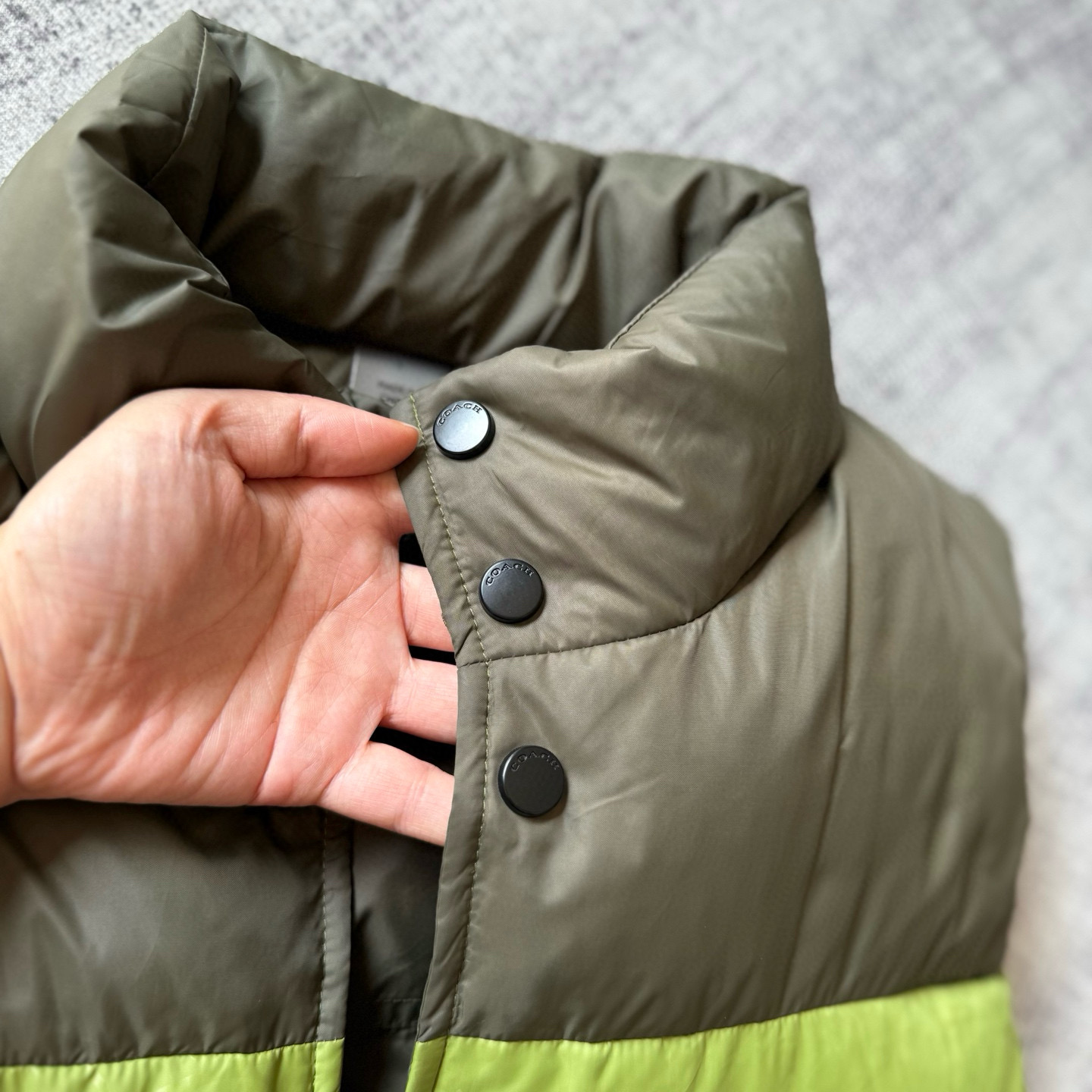 男士双面拼色立领羽绒背心休闲叠穿保暖!面料100 聚酯纤维 里料100 聚酯纤维 填充物 1:90%白鸭绒 10% 白鸭毛 填充物 2:100 聚酯纤维 不包括装饰部分 纽扣开合 拉链袋,立领设计,填充高品质羽绒,保暖力满分!外层防撕裂尼龙,耐用又抗风,秋冬穿超合适器。军绿色+芥末绿撞色,简约又有层次感休闲通勤都能轻松驾驭。正面拉链口袋,收纳方便实用又时髦!高领的版型,不用围围巾也能很好的为脖子保暖。胆布升级,高标准的400弹力胆布,8号金针绗绒,针眼扎下去能快速回弹,牢牢的锁住羽绒,不会出现钻绒跑绒的问题。内里填充90白鸭绒,240克高克重的充绒量。大朵鸭绒蓬松保暖。化身小暖炉守护兄弟们的温暖。进口滴油四合扣,一扣一拉之间清脆好扣,内里纯色面的一面有独特的字母绣花,穿起来更实穿。