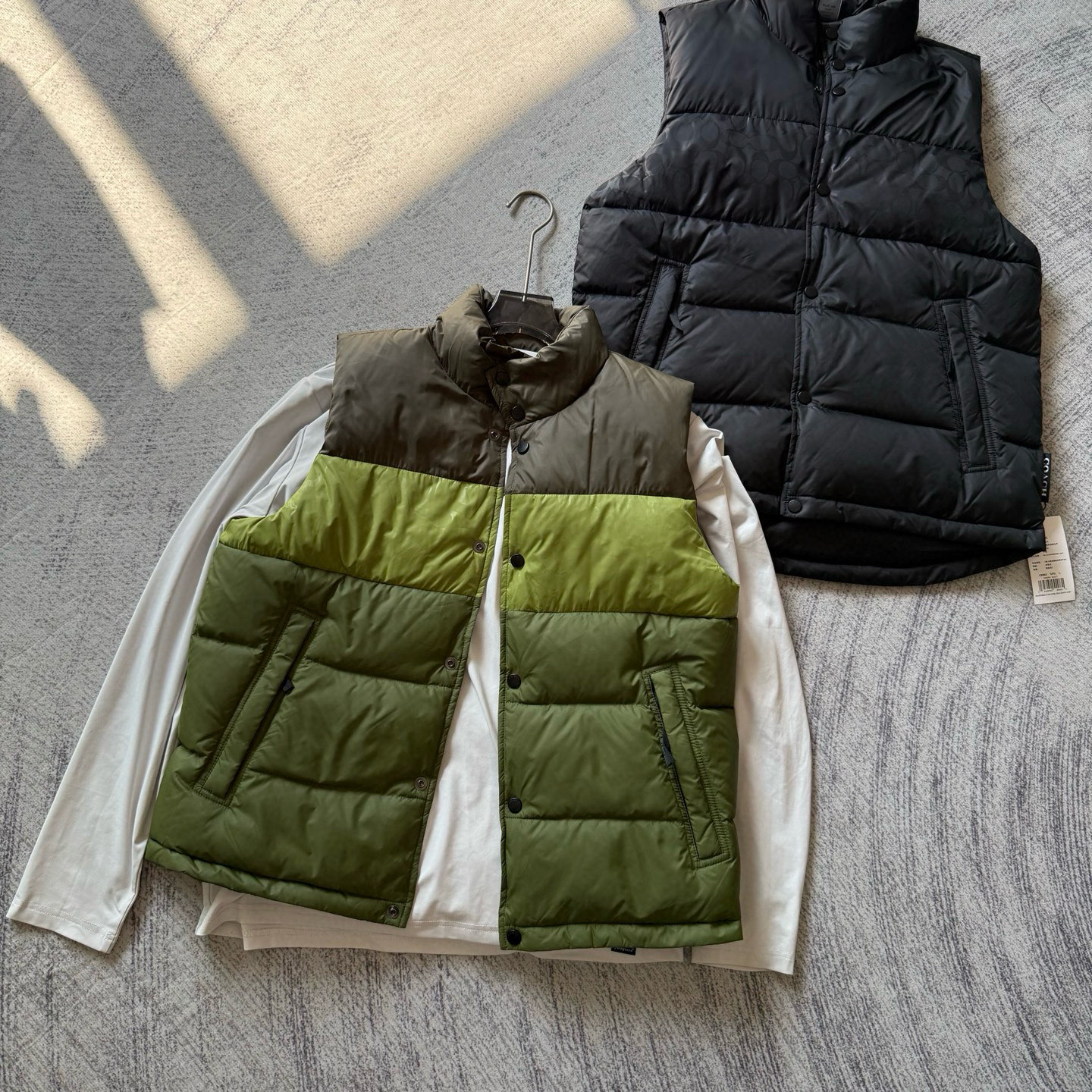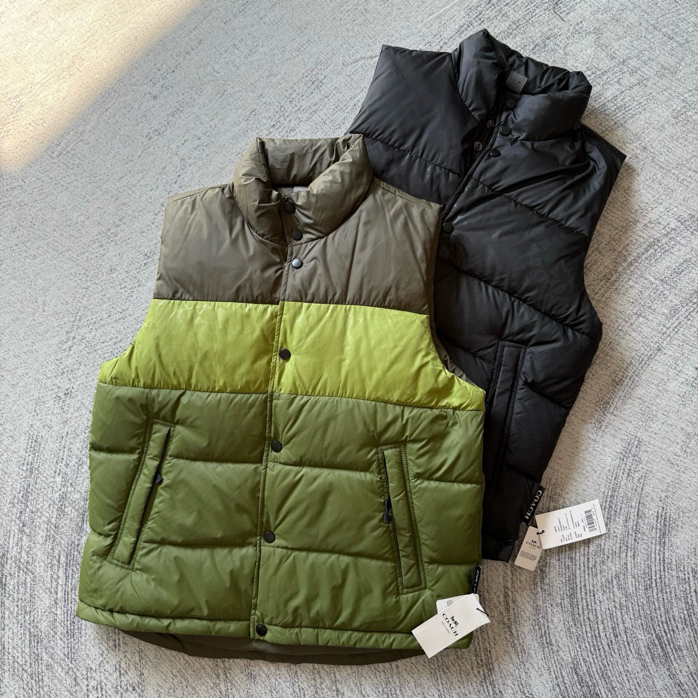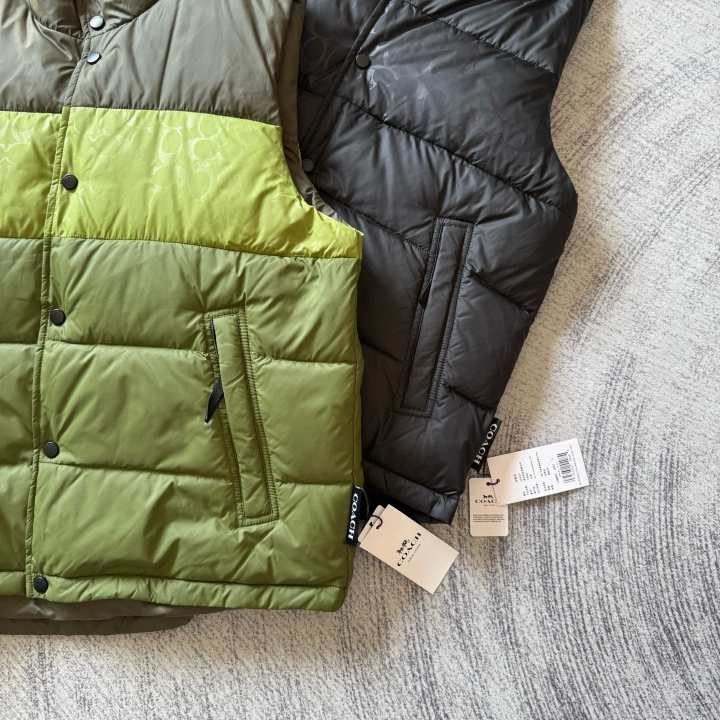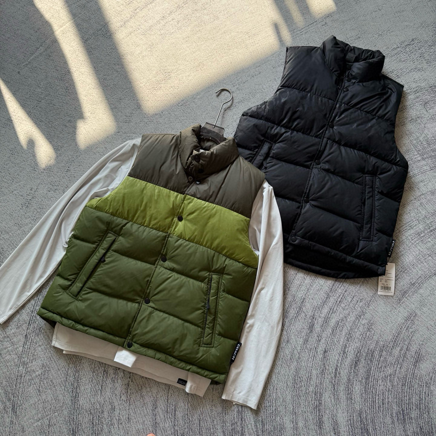 男士双面拼色立领羽绒背心休闲叠穿保暖!面料100 聚酯纤维 里料100 聚酯纤维 填充物 1:90%白鸭绒 10% 白鸭毛 填充物 2:100 聚酯纤维 不包括装饰部分 纽扣开合 拉链袋,立领设计,填充高品质羽绒,保暖力满分!外层防撕裂尼龙,耐用又抗风,秋冬穿超合适器。军绿色+芥末绿撞色,简约又有层次感休闲通勤都能轻松驾驭。正面拉链口袋,收纳方便实用又时髦!高领的版型,不用围围巾也能很好的为脖子保暖。胆布升级,高标准的400弹力胆布,8号金针绗绒,针眼扎下去能快速回弹,牢牢的锁住羽绒,不会出现钻绒跑绒的问题。内里填充90白鸭绒,240克高克重的充绒量。大朵鸭绒蓬松保暖。化身小暖炉守护兄弟们的温暖。进口滴油四合扣,一扣一拉之间清脆好扣,内里纯色面的一面有独特的字母绣花,穿起来更实穿。