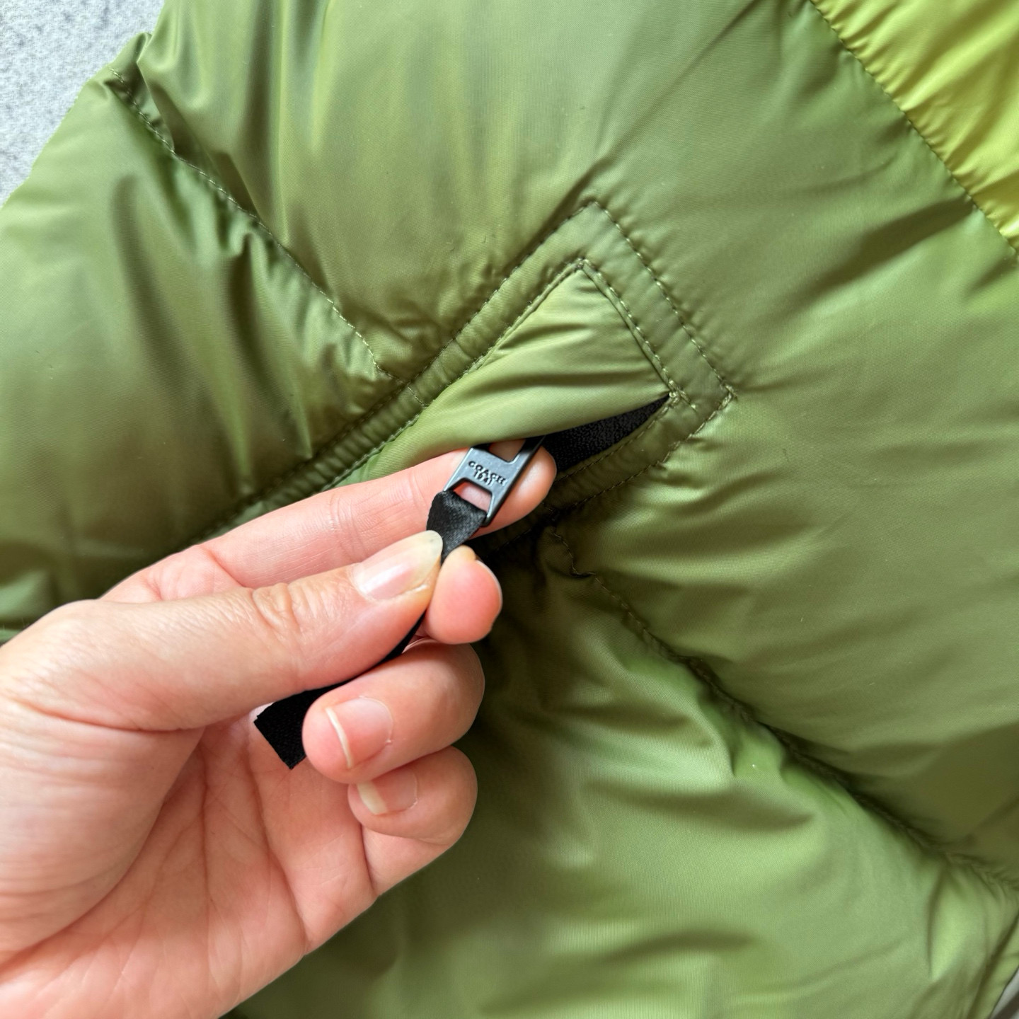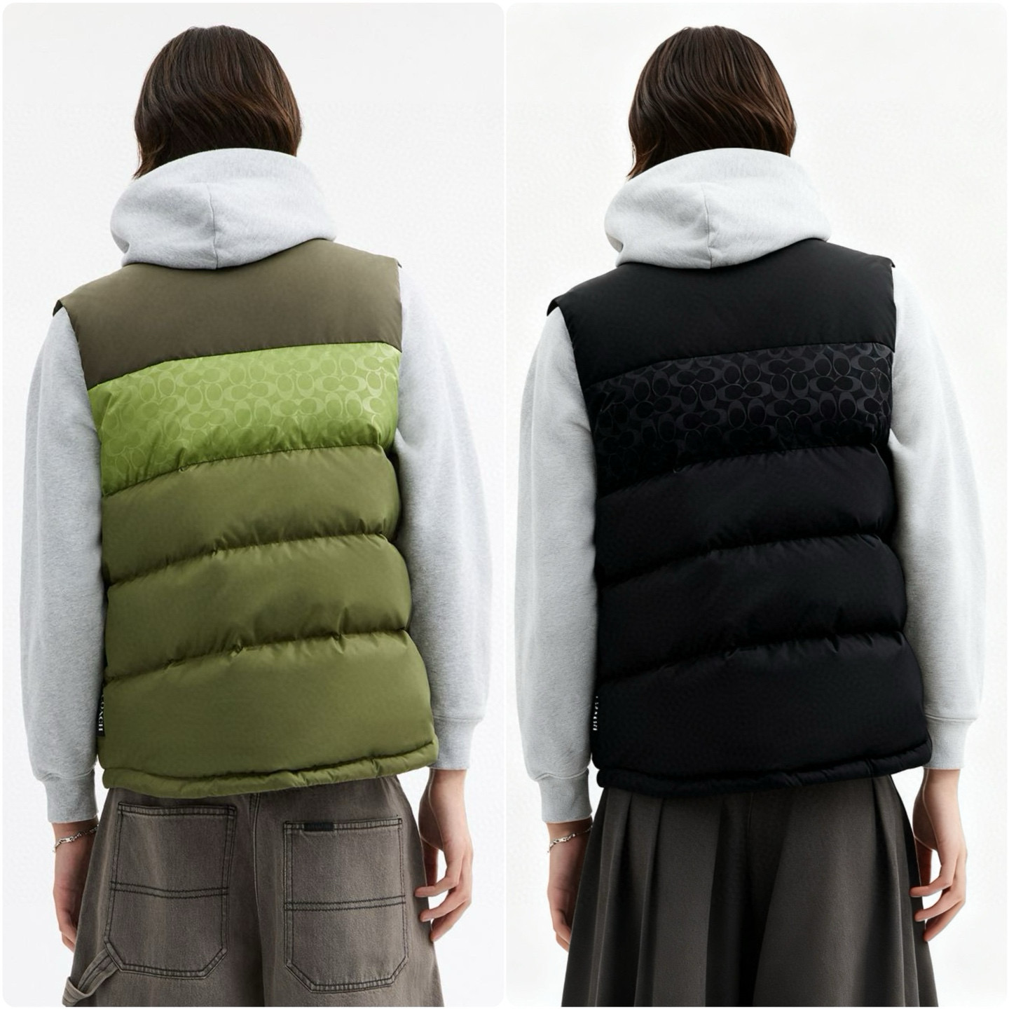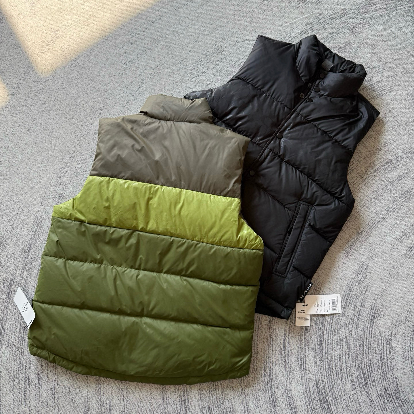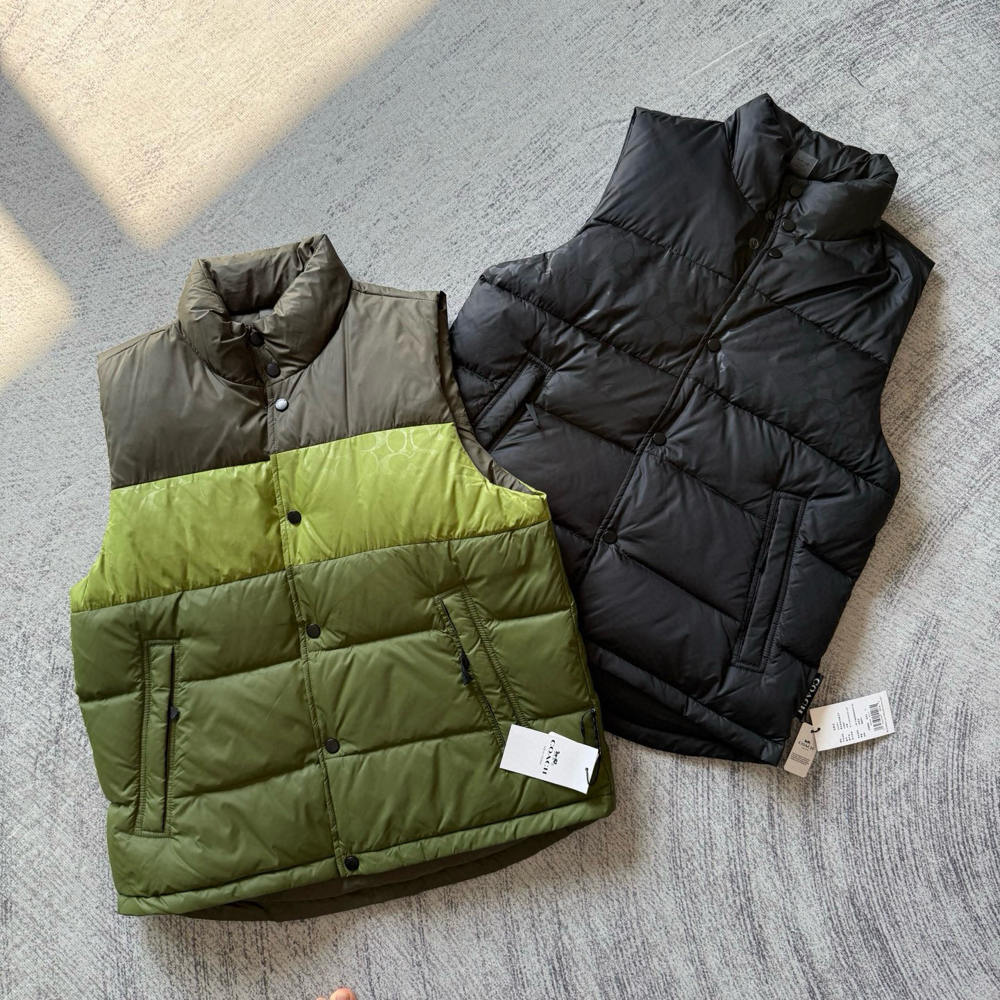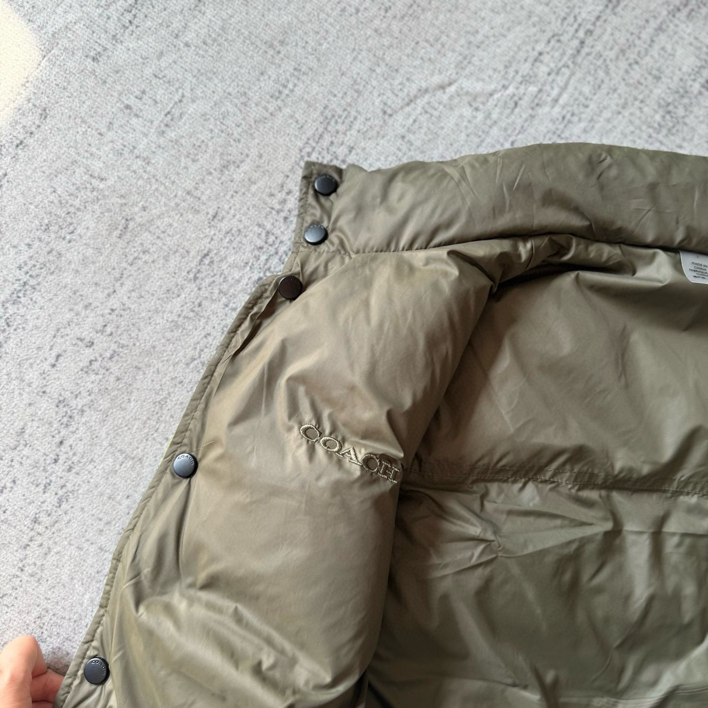 男士双面拼色立领羽绒背心休闲叠穿保暖!面料100 聚酯纤维 里料100 聚酯纤维 填充物 1:90%白鸭绒 10% 白鸭毛 填充物 2:100 聚酯纤维 不包括装饰部分 纽扣开合 拉链袋,立领设计,填充高品质羽绒,保暖力满分!外层防撕裂尼龙,耐用又抗风,秋冬穿超合适器。军绿色+芥末绿撞色,简约又有层次感休闲通勤都能轻松驾驭。正面拉链口袋,收纳方便实用又时髦!高领的版型,不用围围巾也能很好的为脖子保暖。胆布升级,高标准的400弹力胆布,8号金针绗绒,针眼扎下去能快速回弹,牢牢的锁住羽绒,不会出现钻绒跑绒的问题。内里填充90白鸭绒,240克高克重的充绒量。大朵鸭绒蓬松保暖。化身小暖炉守护兄弟们的温暖。进口滴油四合扣,一扣一拉之间清脆好扣,内里纯色面的一面有独特的字母绣花,穿起来更实穿。