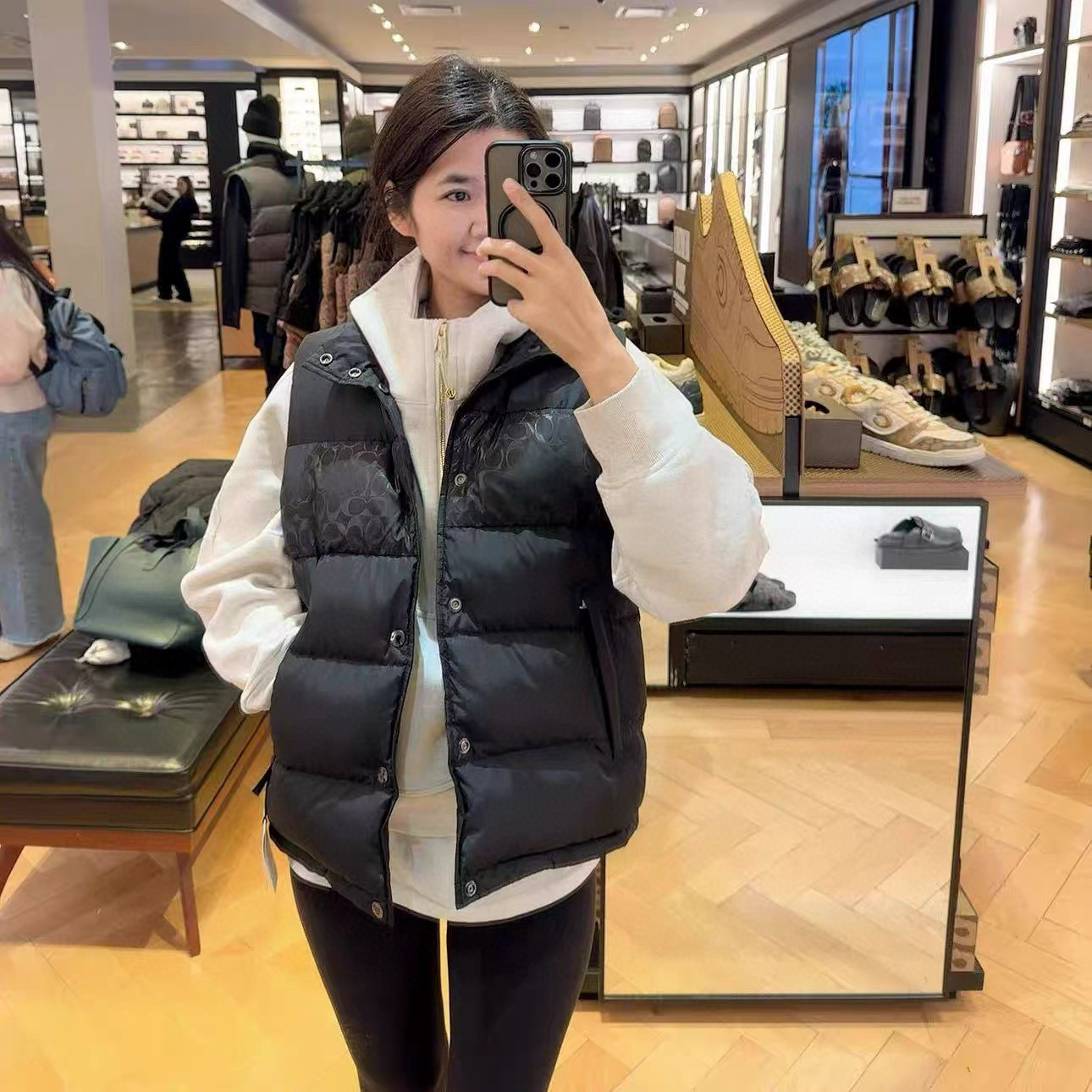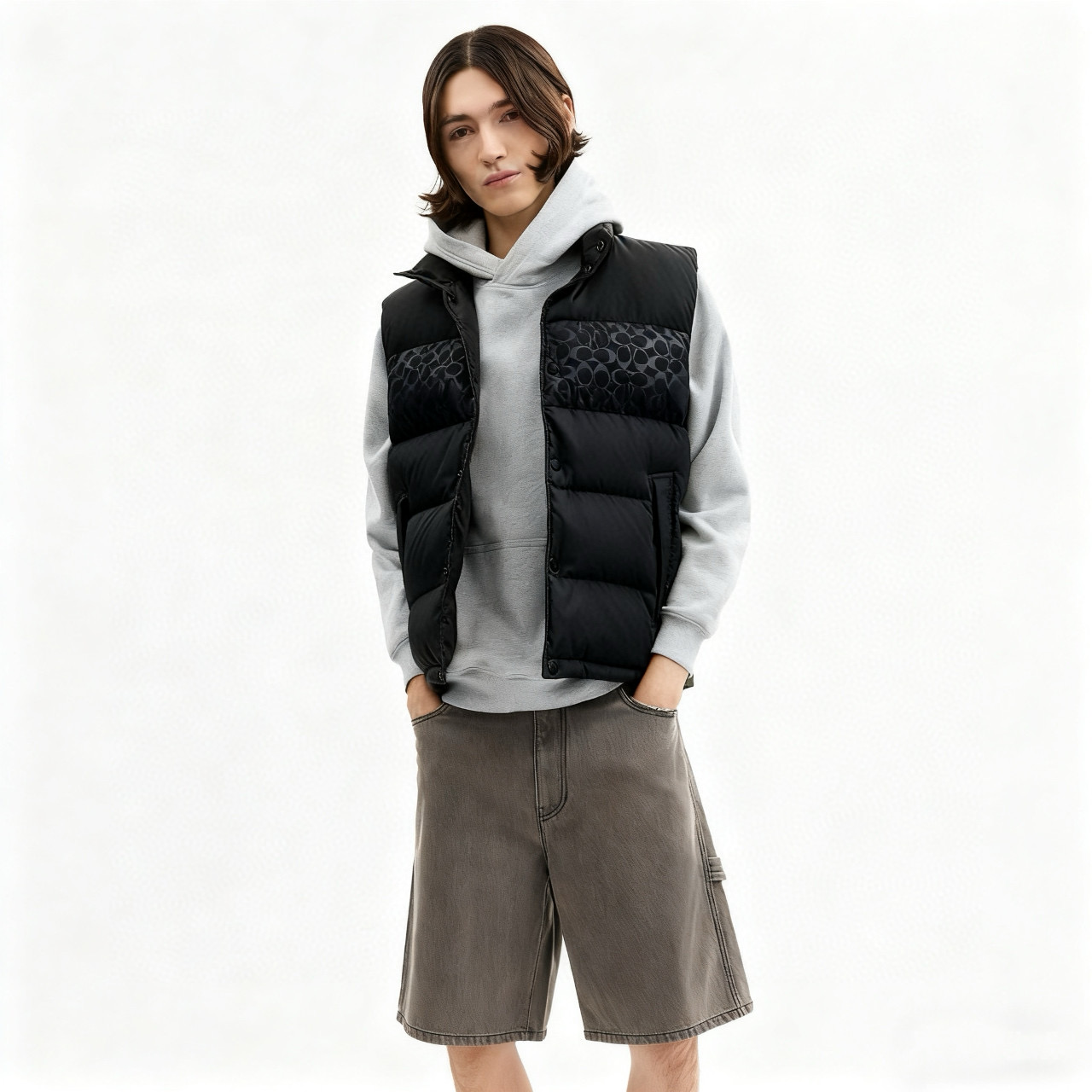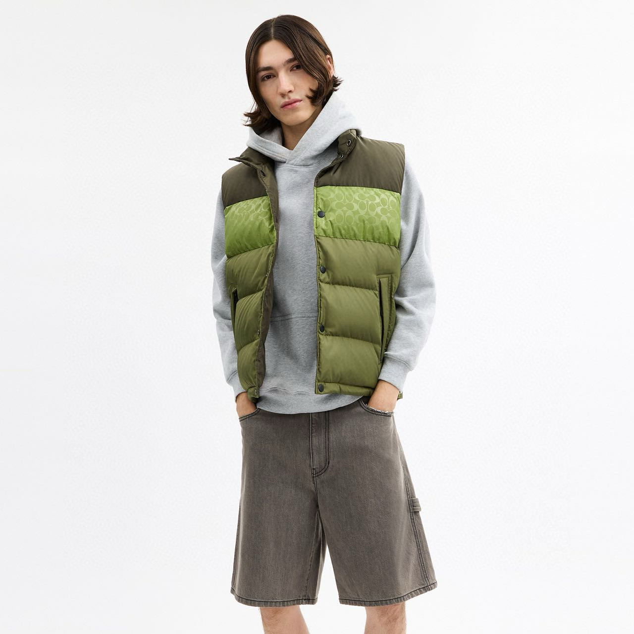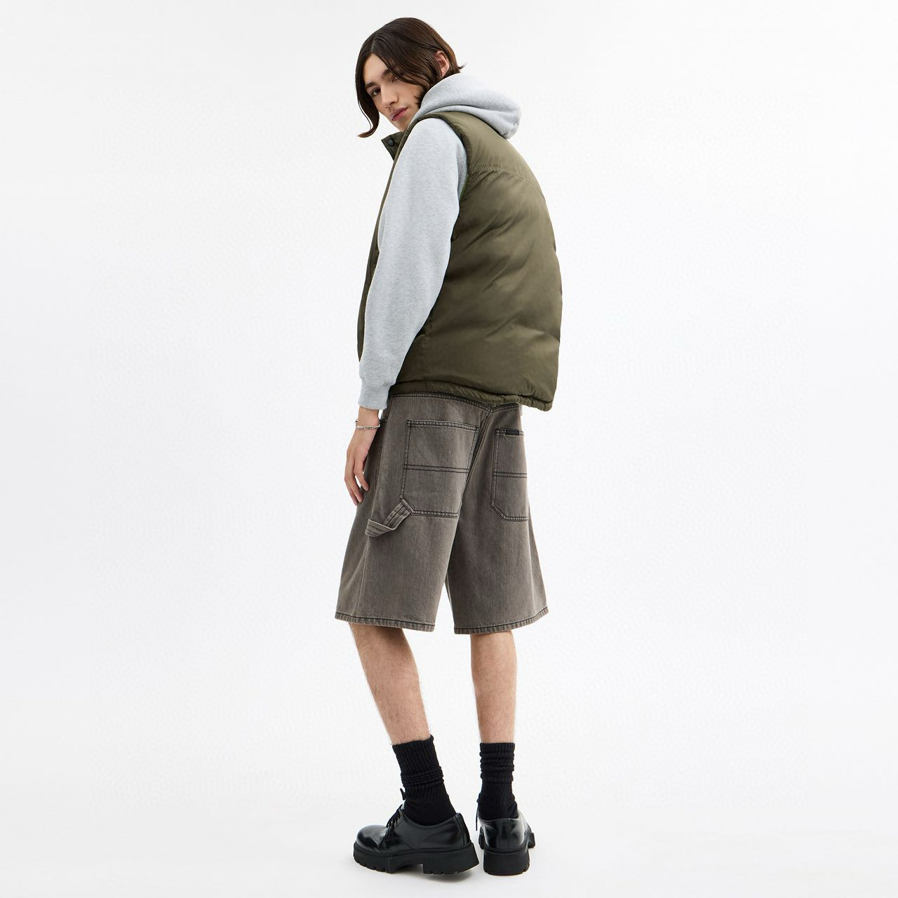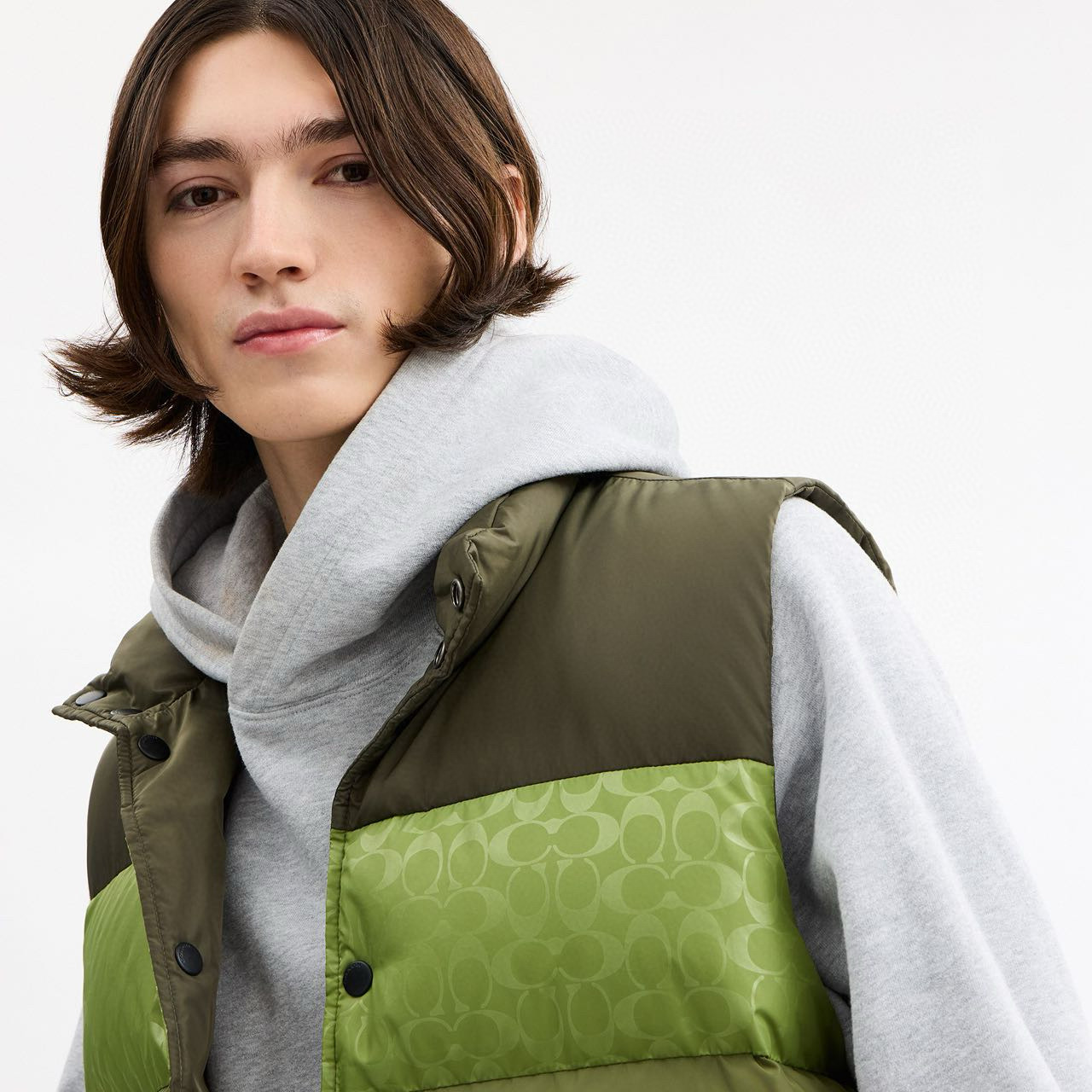 男士双面拼色立领羽绒背心休闲叠穿保暖!面料100 聚酯纤维 里料100 聚酯纤维 填充物 1:90%白鸭绒 10% 白鸭毛 填充物 2:100 聚酯纤维 不包括装饰部分 纽扣开合 拉链袋,立领设计,填充高品质羽绒,保暖力满分!外层防撕裂尼龙,耐用又抗风,秋冬穿超合适器。军绿色+芥末绿撞色,简约又有层次感休闲通勤都能轻松驾驭。正面拉链口袋,收纳方便实用又时髦!高领的版型,不用围围巾也能很好的为脖子保暖。胆布升级,高标准的400弹力胆布,8号金针绗绒,针眼扎下去能快速回弹,牢牢的锁住羽绒,不会出现钻绒跑绒的问题。内里填充90白鸭绒,240克高克重的充绒量。大朵鸭绒蓬松保暖。化身小暖炉守护兄弟们的温暖。进口滴油四合扣,一扣一拉之间清脆好扣,内里纯色面的一面有独特的字母绣花,穿起来更实穿。