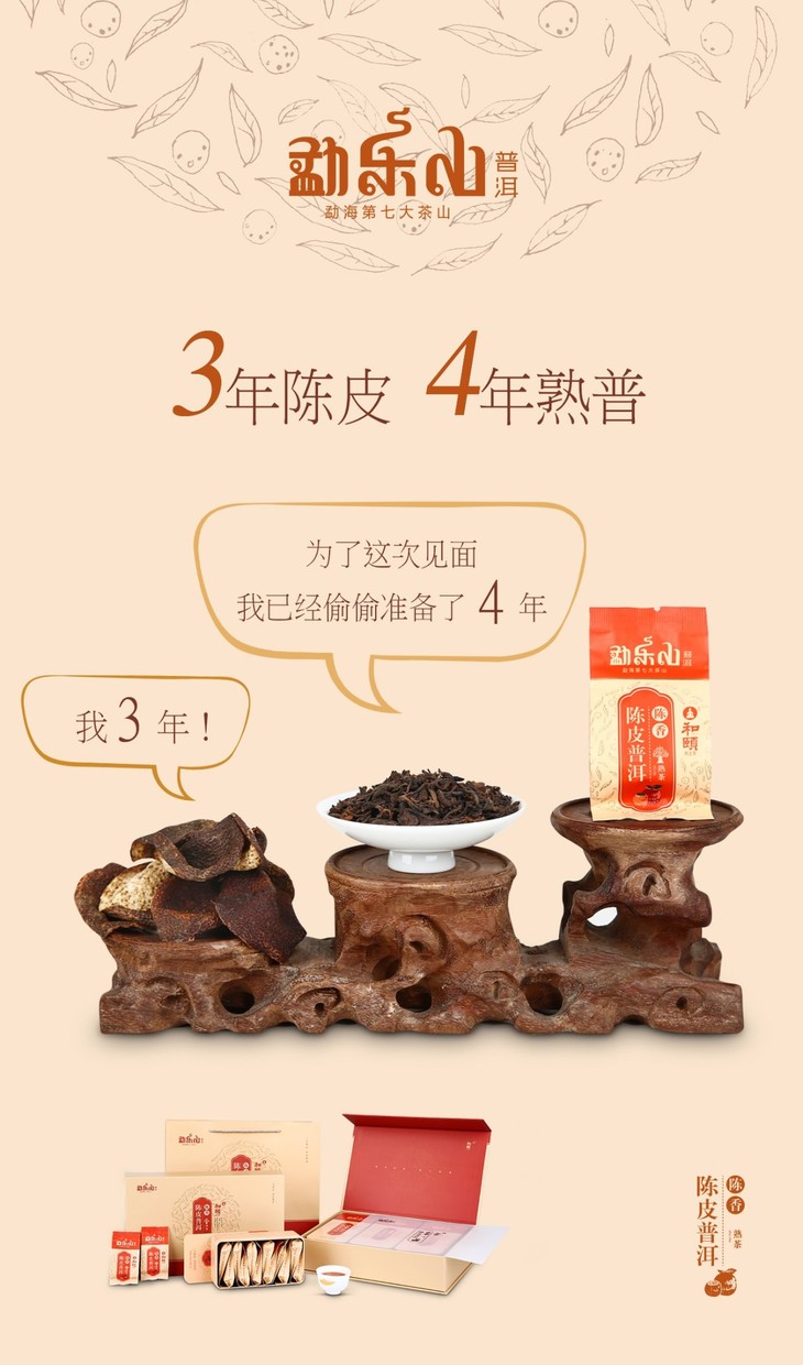 为了这次见面,陈香陈皮普洱已经偷偷准备了4年。每一包陈皮普洱,是将陈放了3年的陈皮,切丝、晒干,与陈化了4年的普洱熟茶,精心配制而成。