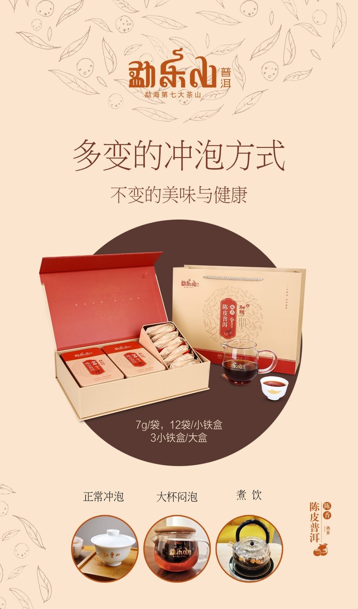 勐乐山的陈香陈皮普洱,把美味、健康、便捷串联起来。宜自饮:7克一小袋,能放在小挎包、衣裤袋中随身携带,随时可享健康美味。宜送礼:暖色调铁盒设计,精美又时尚,一袋3盒,送礼倍感大方。