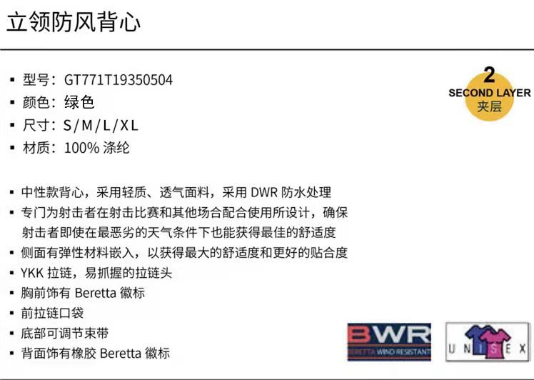 意大利BERETTA立领防风背心-绿色