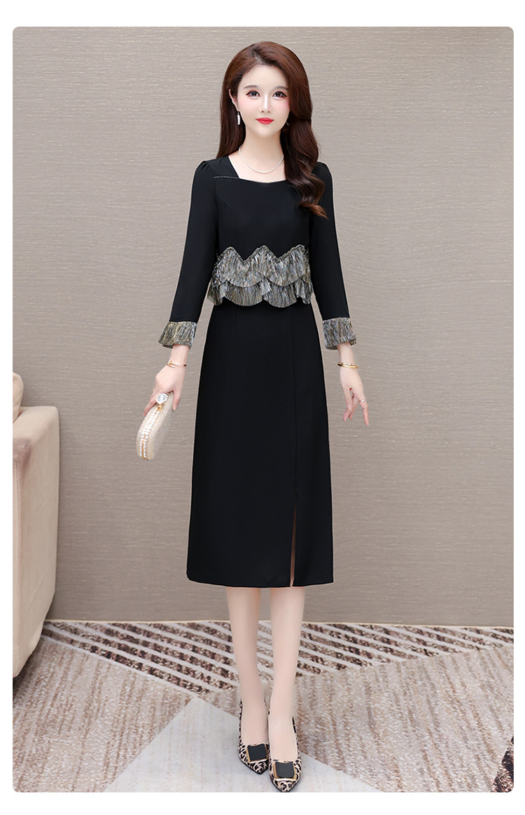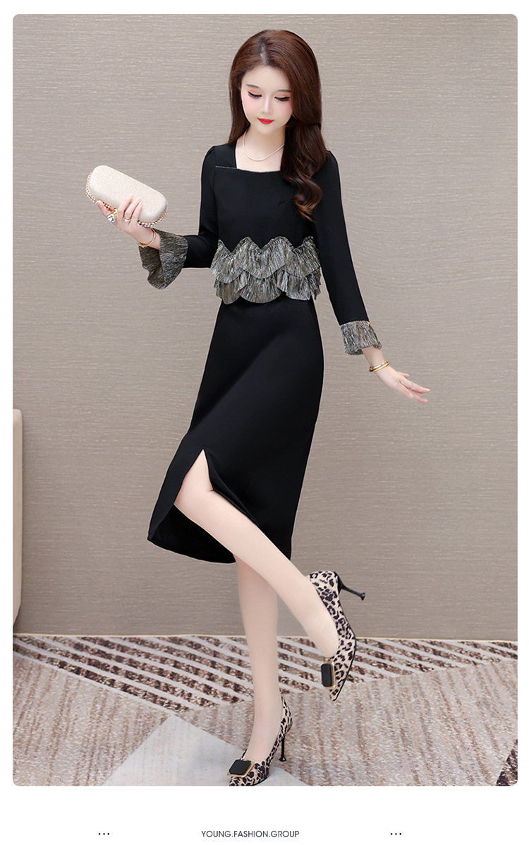 QYM F188-Y时髦连衣裙荷叶边拼结假两件包臀裙开衩裙 商品图1