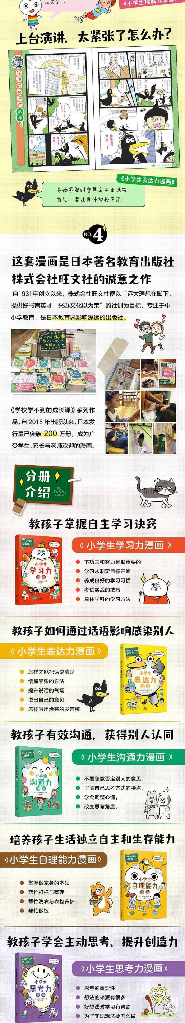 《学校学不到的成长课:共情力篇》共含5册,分别为:《小学生沟通力漫画》《小学生自理能力漫画》《小学生表达力漫画》《小学生自信力漫画》《小学生理解力漫画》。每册内容以有趣可爱的人物+幽默搞笑故事引出主题,以提出问题——分析问题——给出解决方法的内容展开,循序渐进,孩子在生活中遇到的问题都能从中找到答案。确保孩子不仅享受轻松阅读,更能get成才密码。