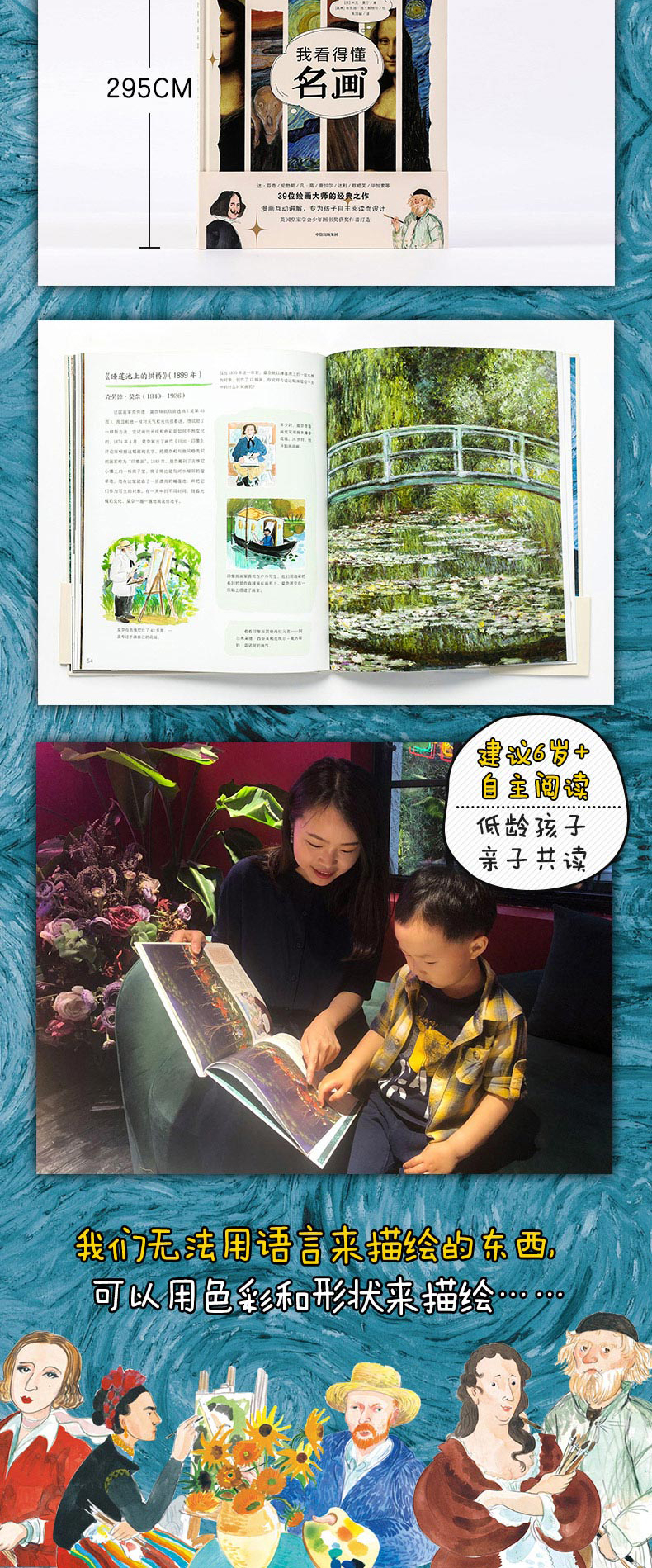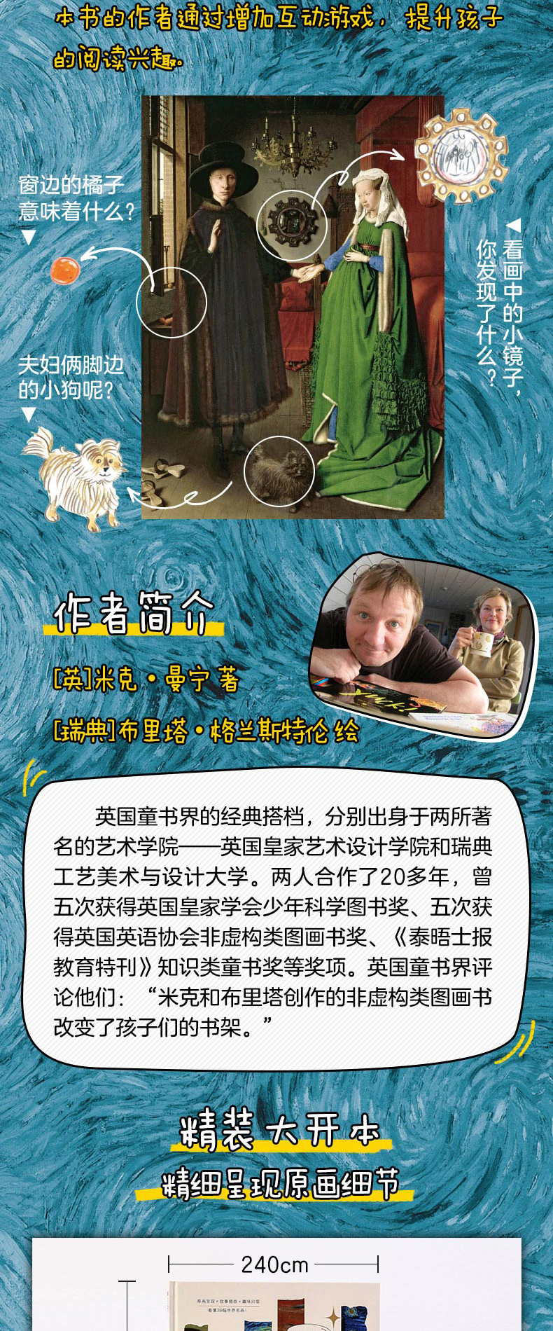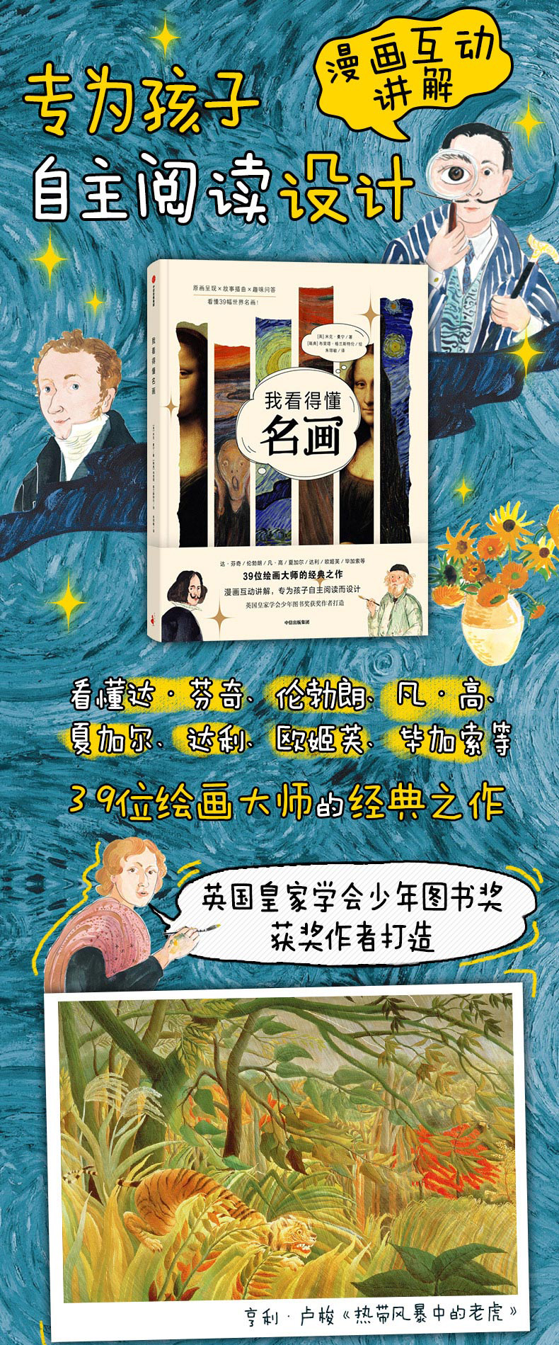 ★围绕名画“讲故事”:揭示画家的经历、生活的时代与他作品之间的联系,便于孩子理解。将艺术家的个性和经历融于对画作的讲解中,既有助于孩子看画,还会让他们有其他的收获——画家俏皮的一面,会让他们哈哈大笑;画家背后的人生故事,会使他们受到鼓舞;在一位位画家身上体现的,艺术与生活之间的相互影响,会真正启发孩子对艺术的兴趣。
