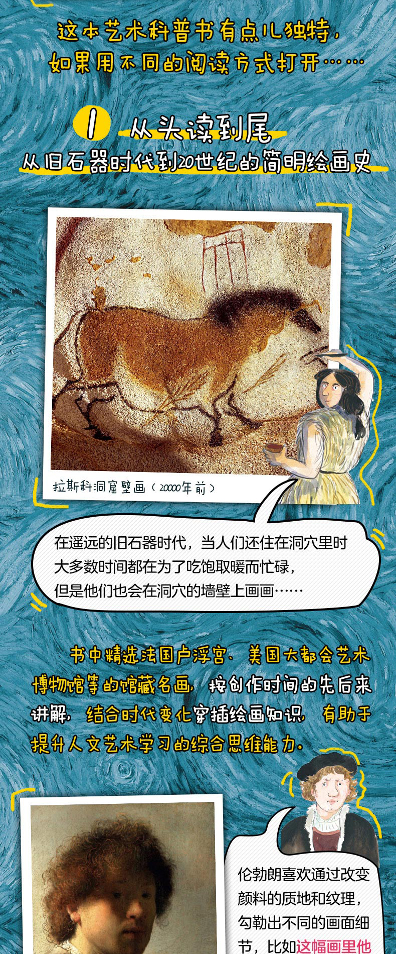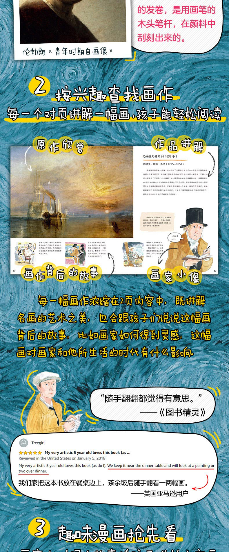 “原画呈现”+“漫画导读”+“趣味问答”,带孩子轻松看懂达•芬奇、伦勃朗、凡•高、夏加尔、达利、欧姬芙、毕加索等39位绘画大师的经典之作!