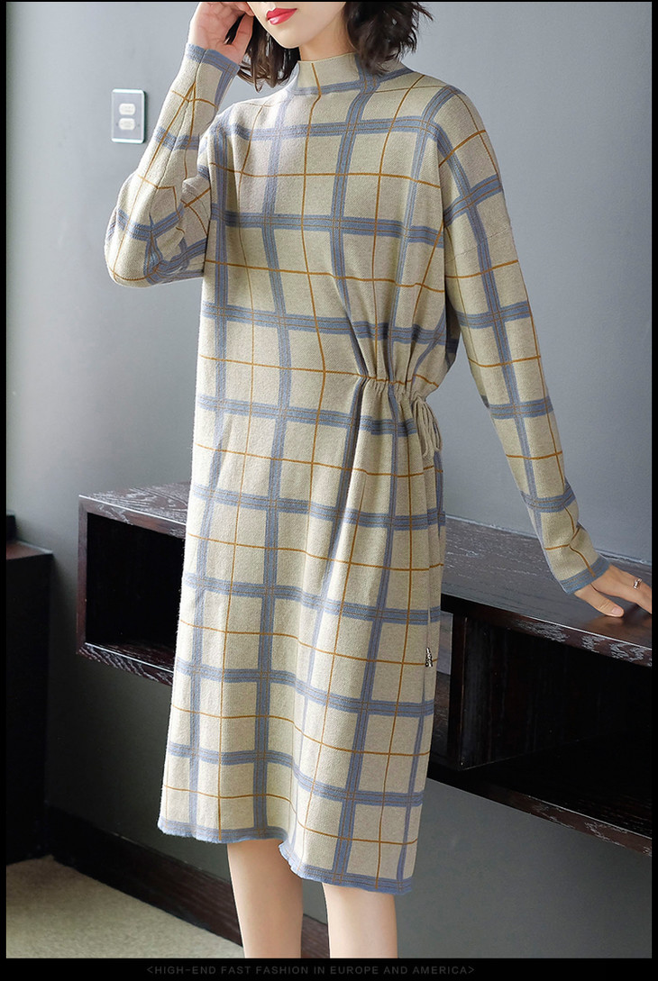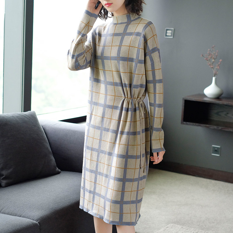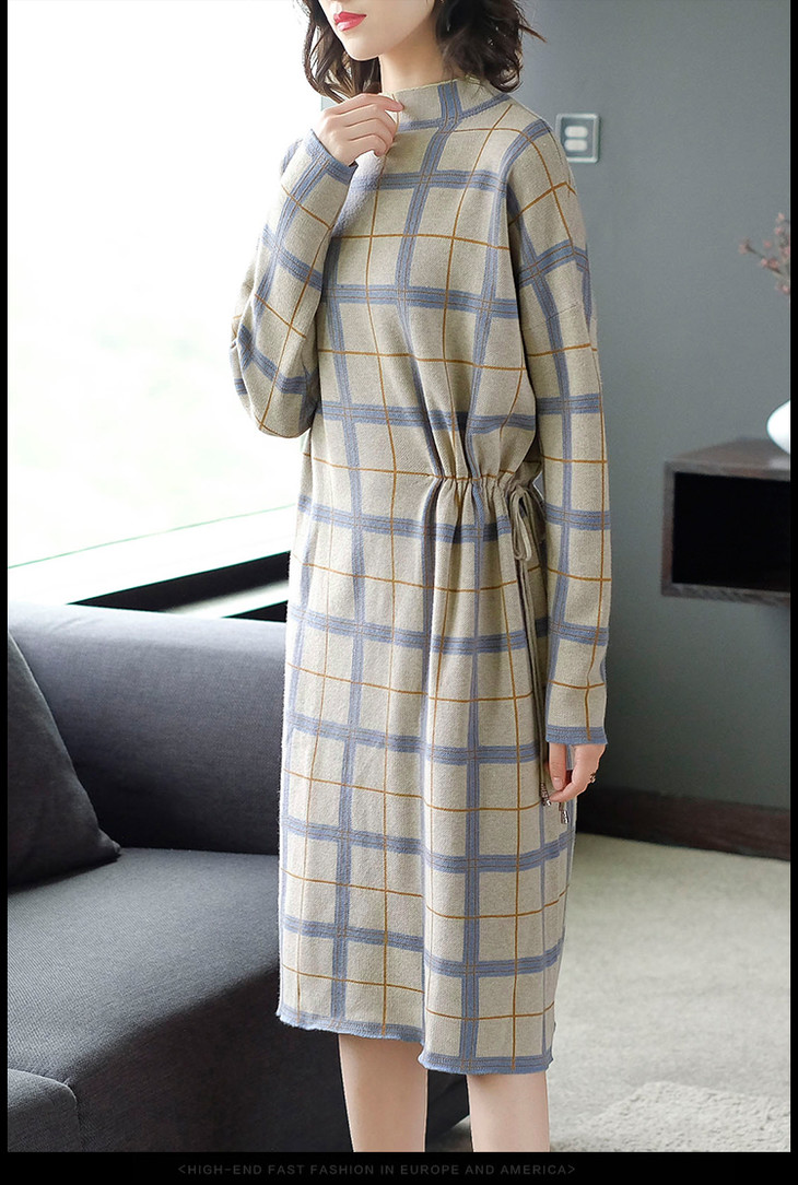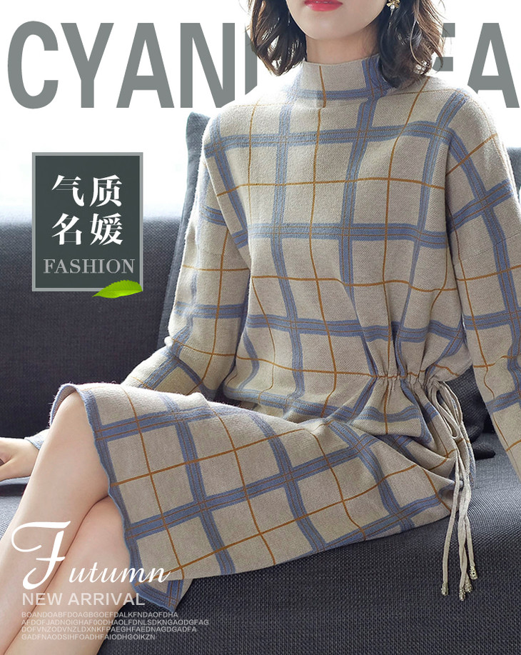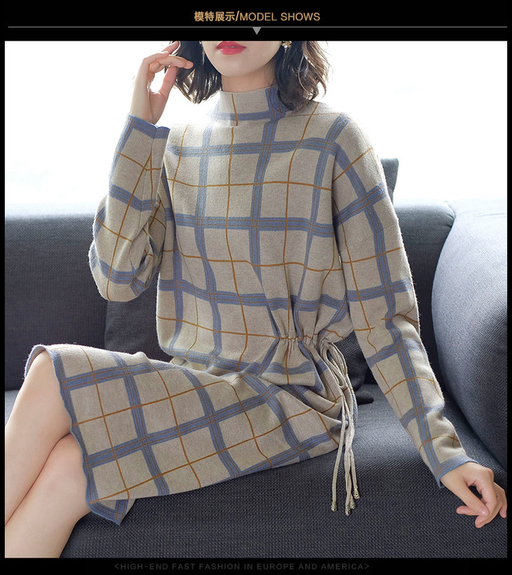 FBA5118立领长袖格子连衣裙秋装女2018宽松中长款针织早秋裙子