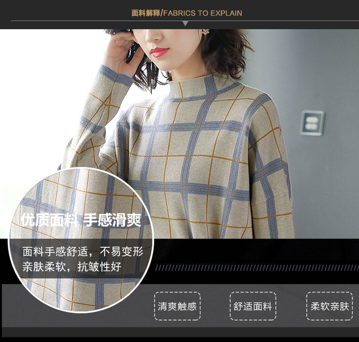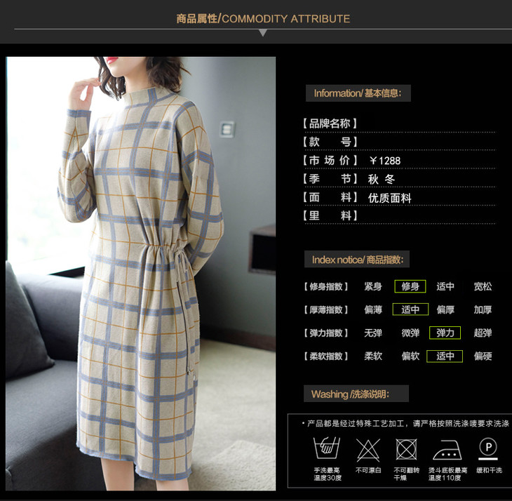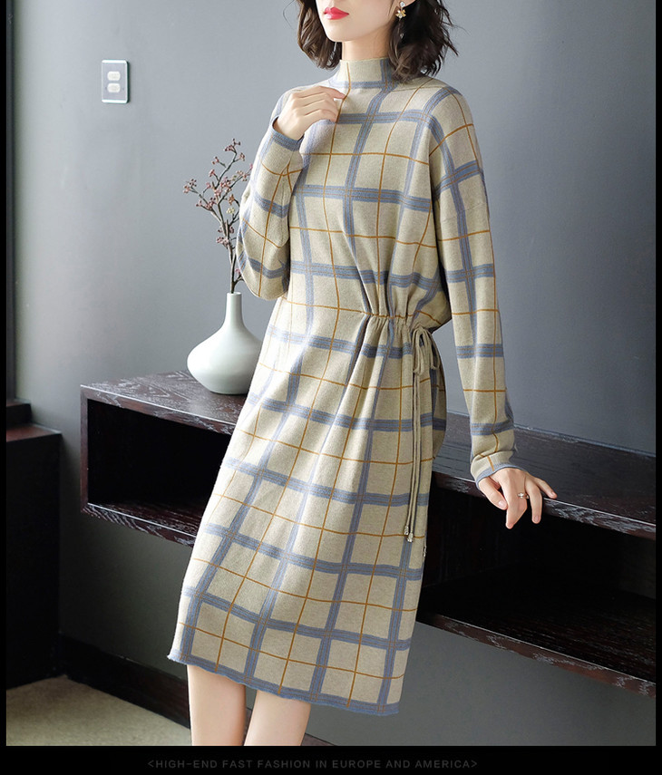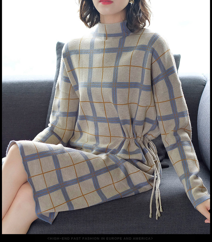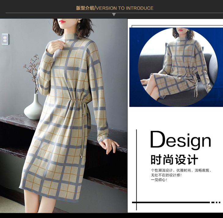 FBA5118立领长袖格子连衣裙秋装女2018宽松中长款针织早秋裙子