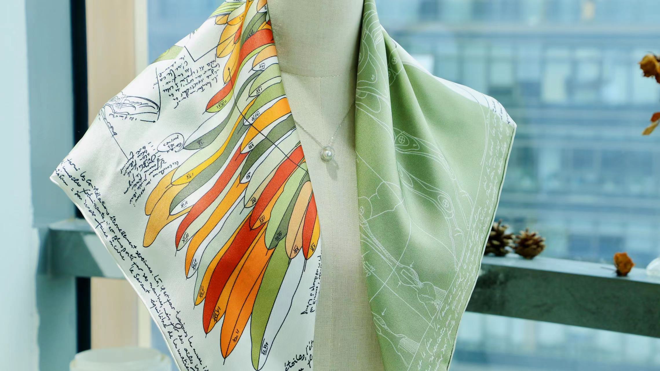 【甄珠贝·时尚高级感系列】 70*70cm斜纹绸【飞马】丝巾和【银杏叶】丝巾扣