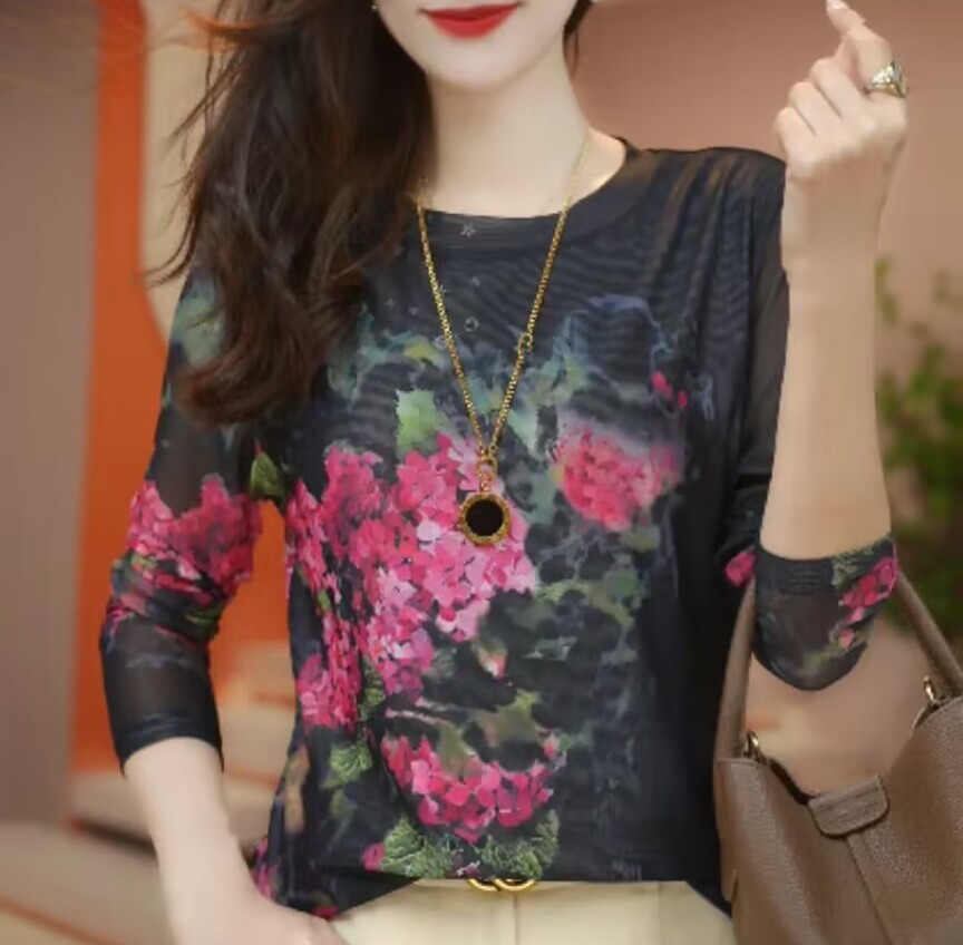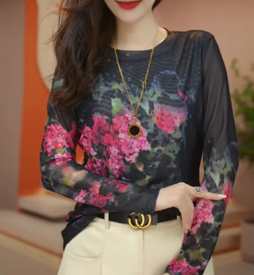 雀说圆领网纱打底小衫长袖女印花高级感春季新款洋气上衣时尚t恤ALSMZ34378
