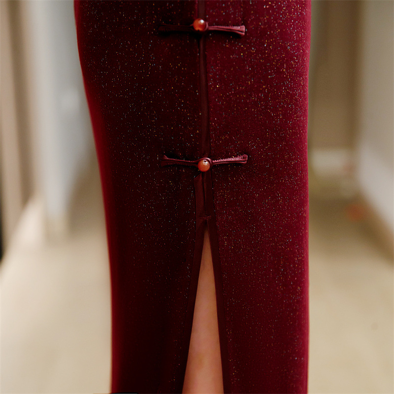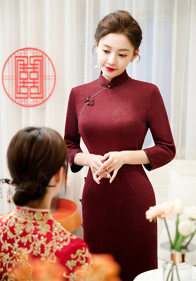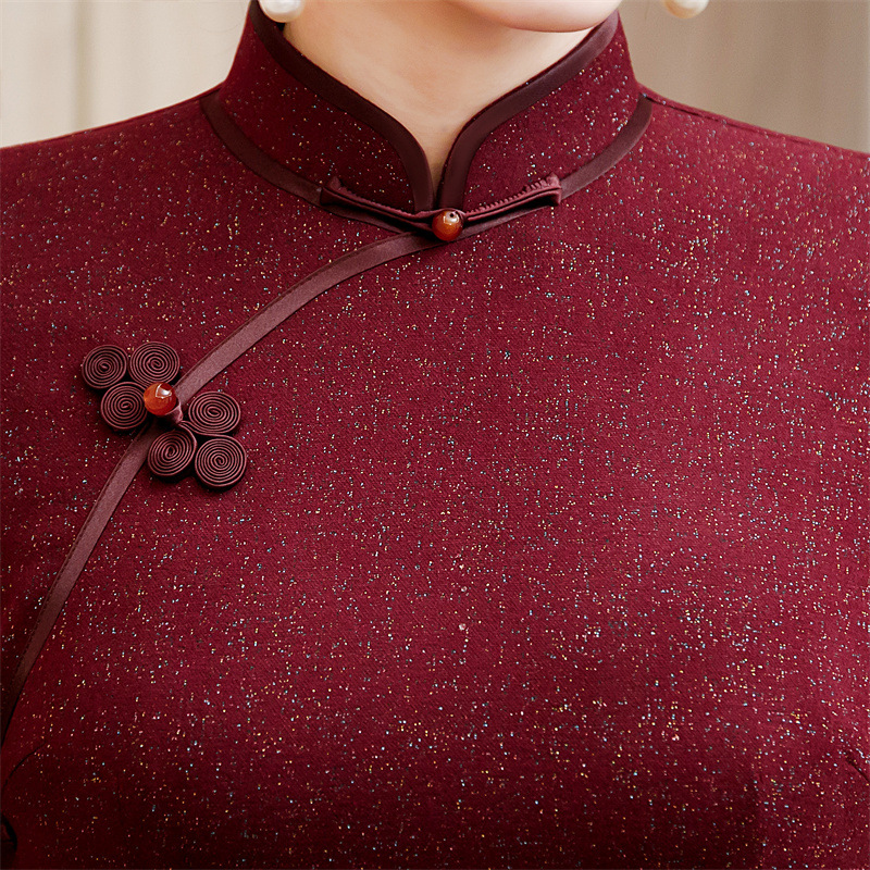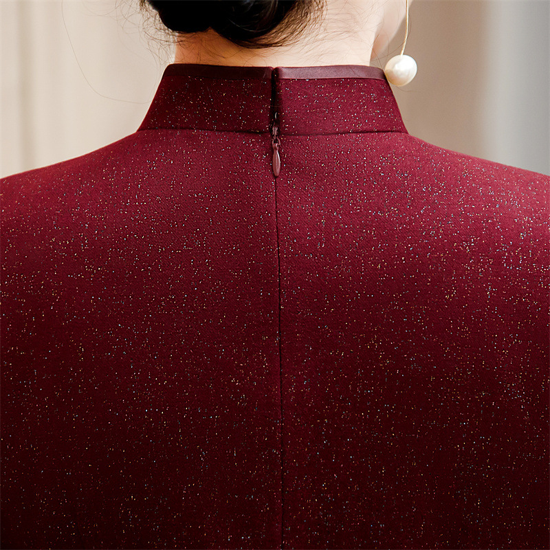 红色澳毛长款七分袖旗袍,复古民族风喜妈妈婚宴旗袍裙GX-609579