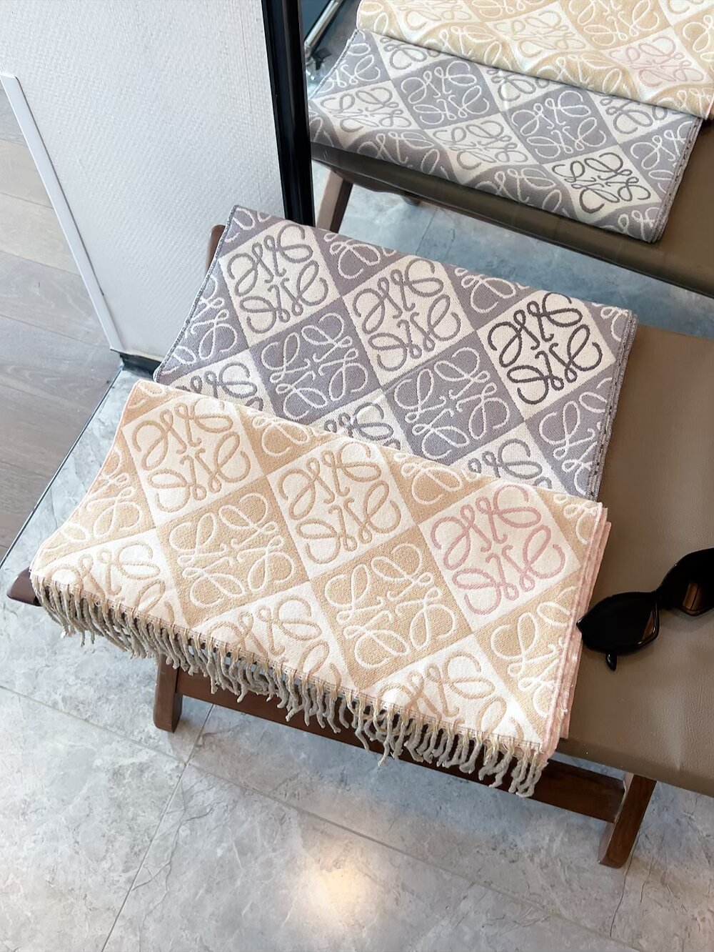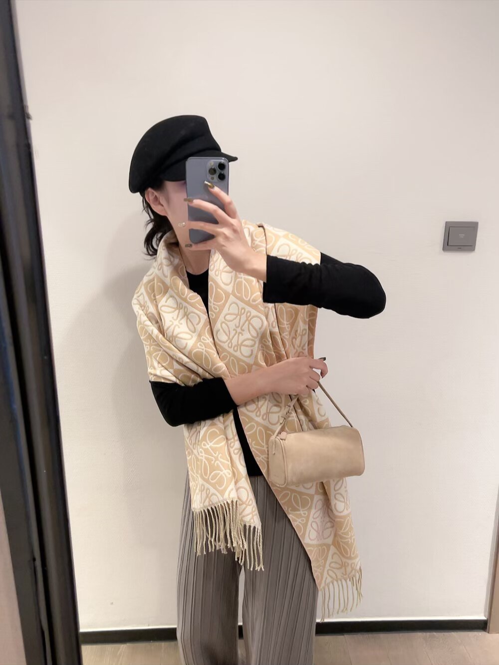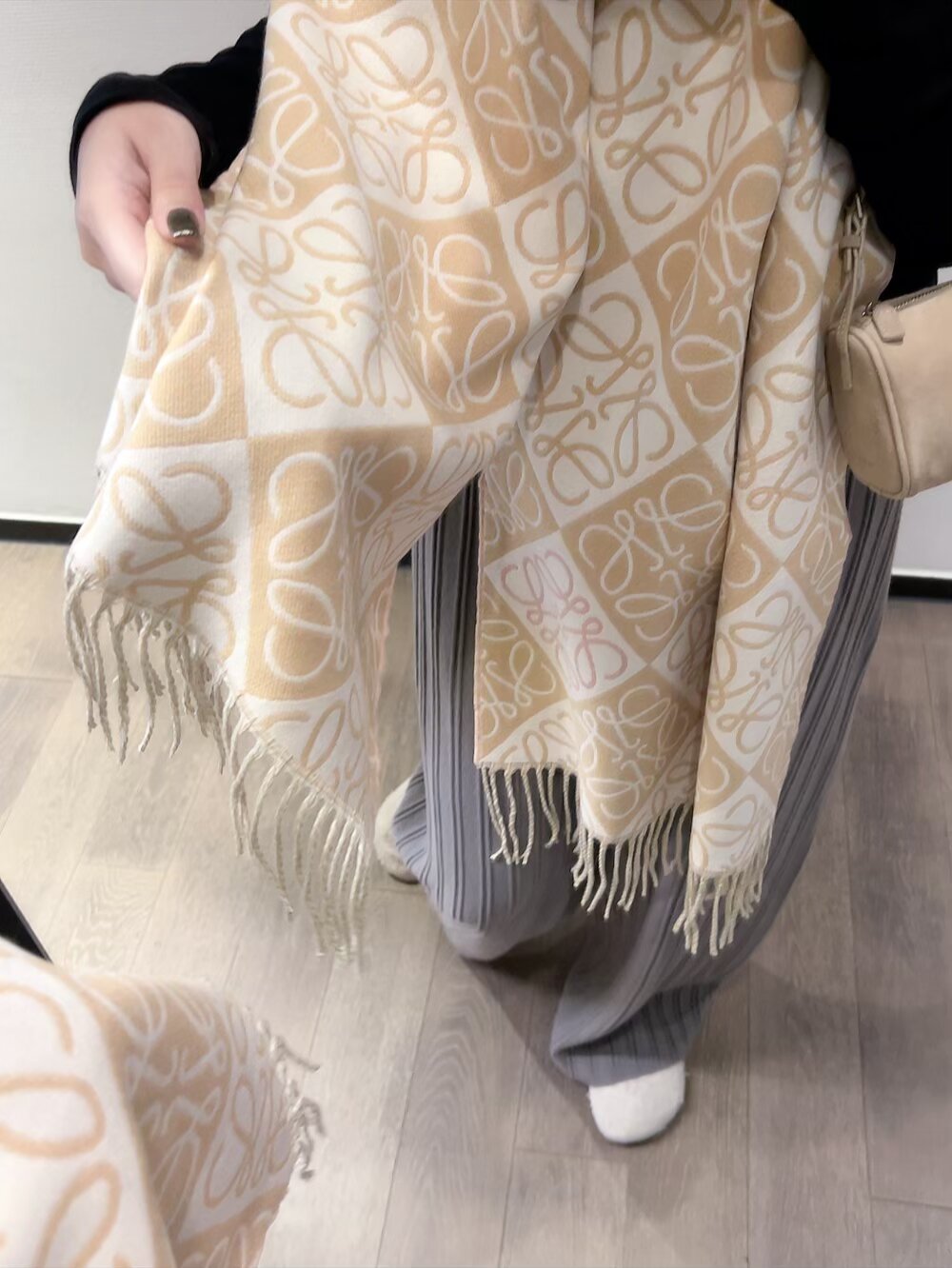 罗意威新款,Khaki Green双色羊毛提花毛毯披肩,饰有重复 Anagram 图案,对比色 LOEWE L 图案和流苏边缘。妥妥的25年C位围巾🧣超级难遇的Loewe 围巾,大logo,而且特别大,当毯子也没问题,可以当披肩,可以当围巾,超级舒服,温柔高贵,太适合秋冬了。材质:纯羊毛,规格:180✖️45cm➕流苏尺寸2x10cm,