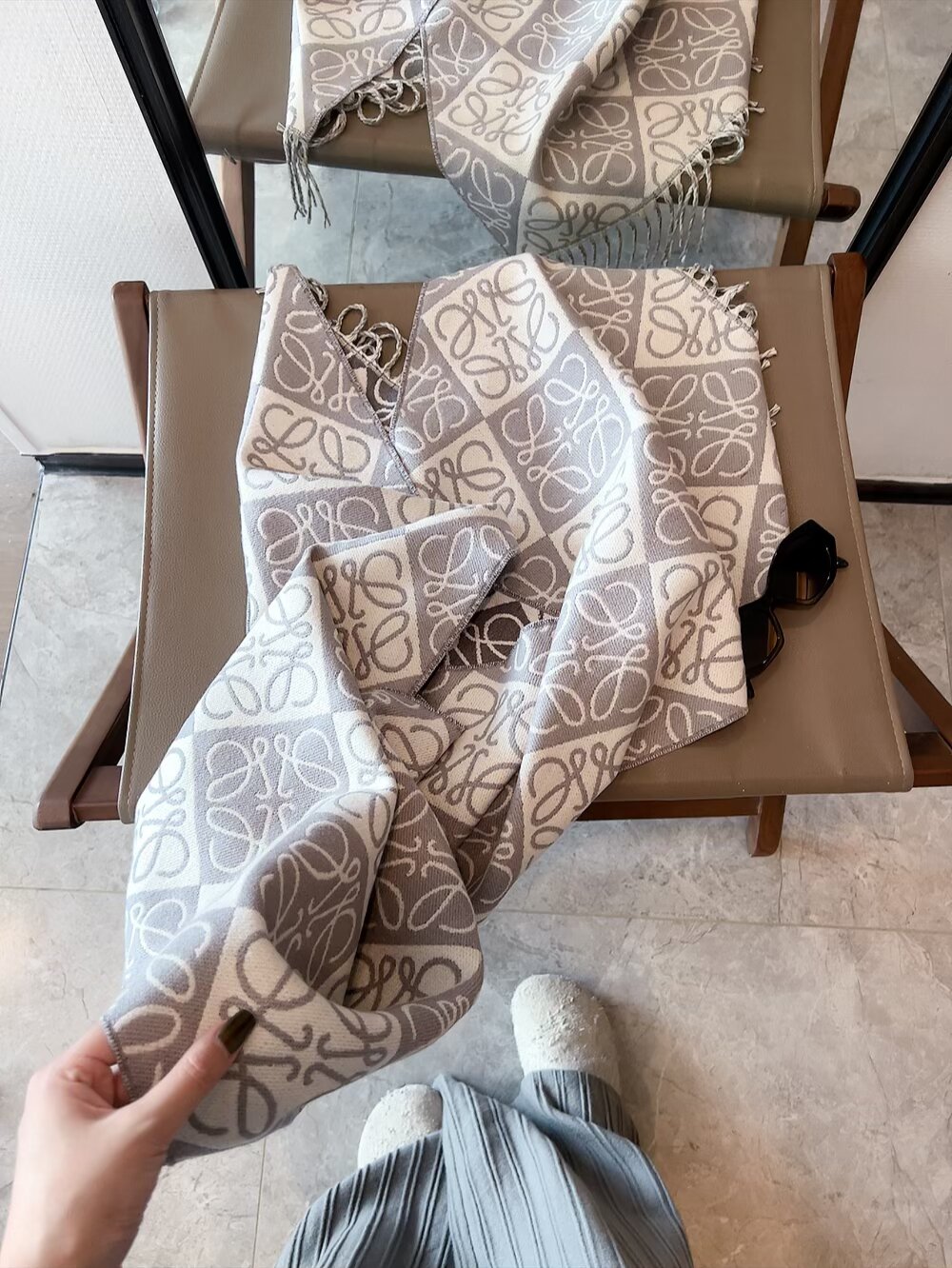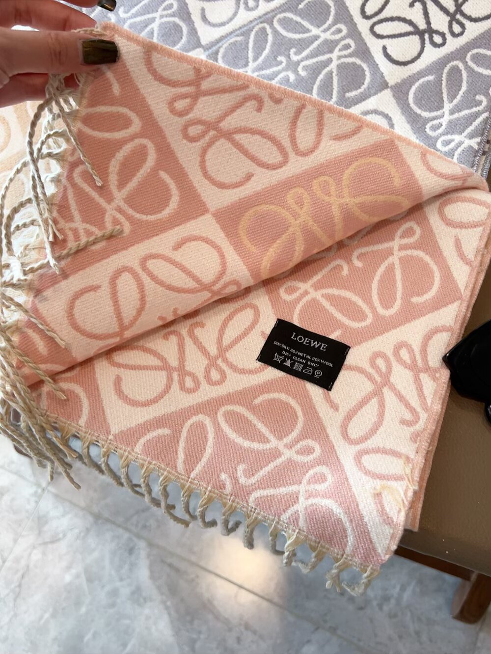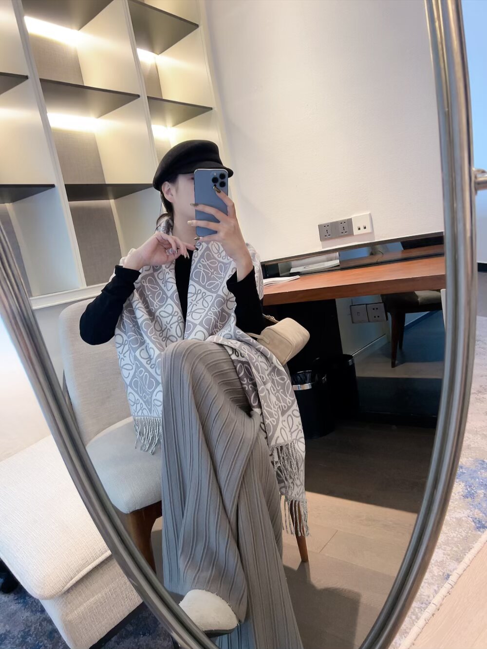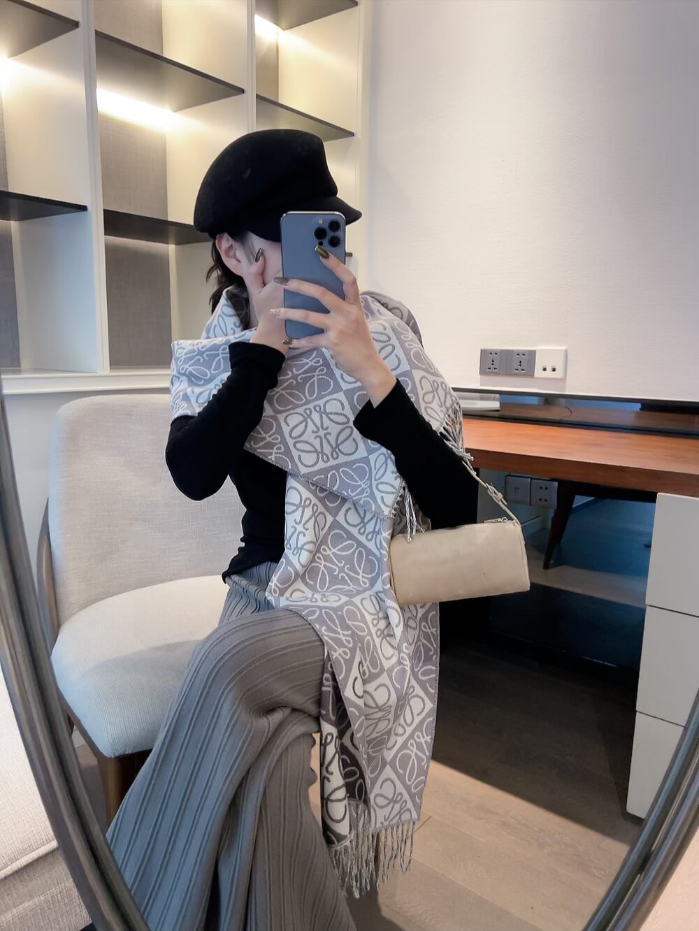 罗意威新款,Khaki Green双色羊毛提花毛毯披肩,饰有重复 Anagram 图案,对比色 LOEWE L 图案和流苏边缘。妥妥的25年C位围巾🧣超级难遇的Loewe 围巾,大logo,而且特别大,当毯子也没问题,可以当披肩,可以当围巾,超级舒服,温柔高贵,太适合秋冬了。材质:纯羊毛,规格:180✖️45cm➕流苏尺寸2x10cm,