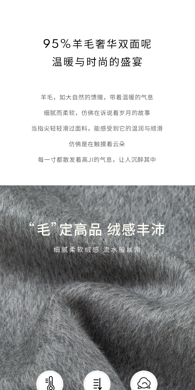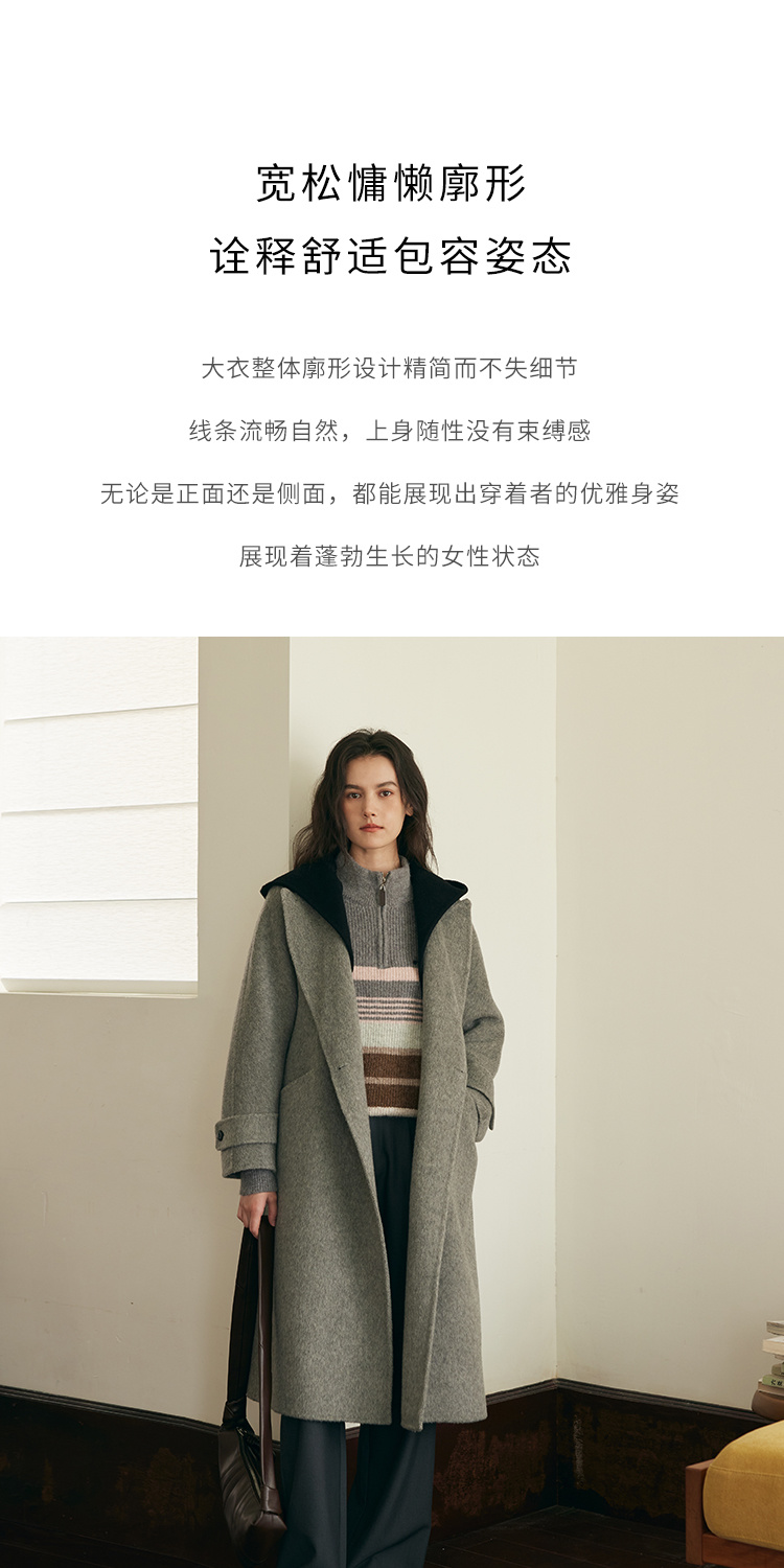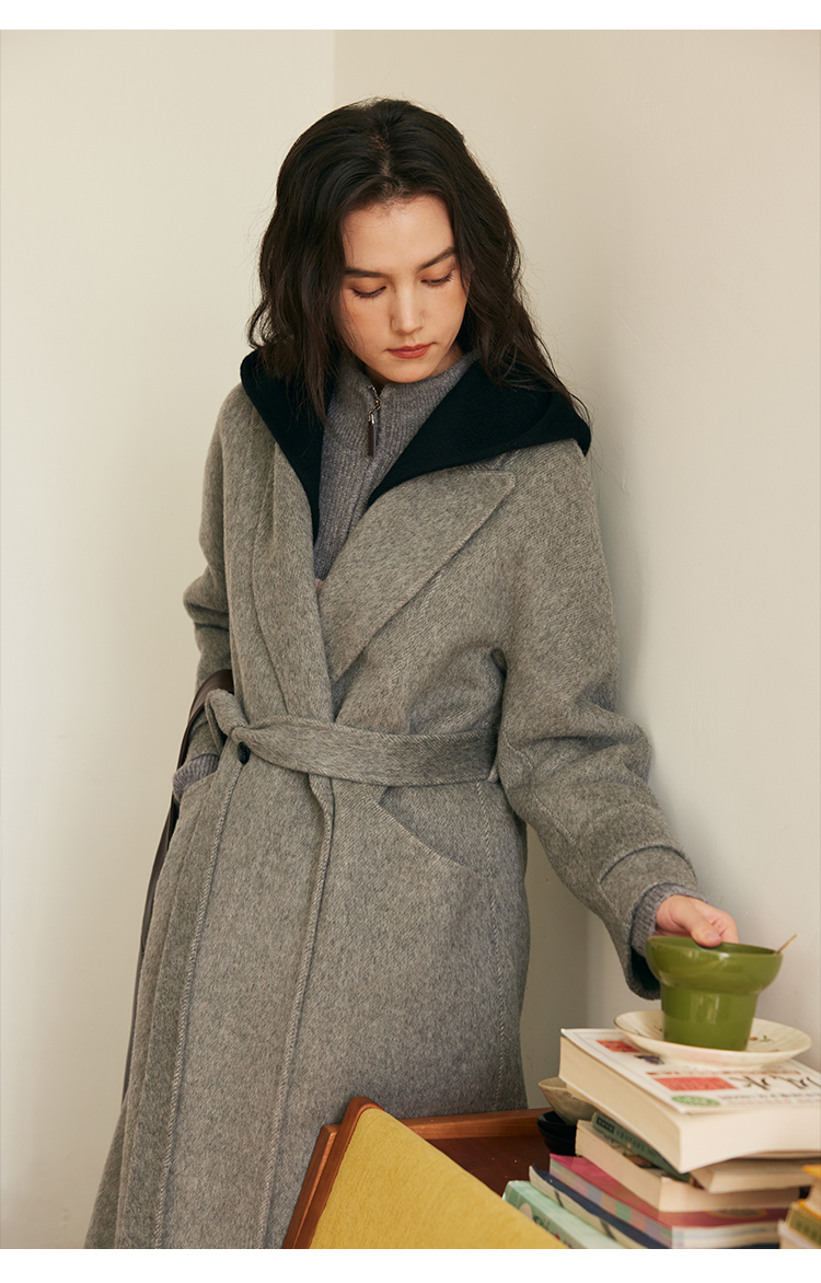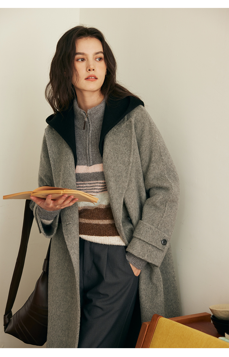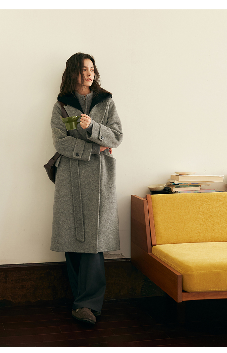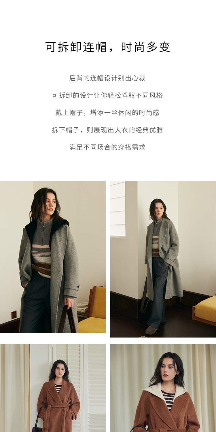 HeyDress双面羊毛大衣女秋冬复古连帽可拆卸加厚气质灰色毛呢外套