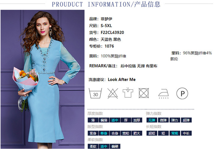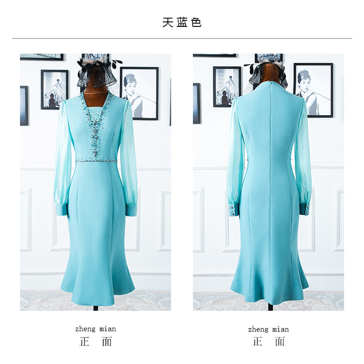 FMY43920新款法式时尚优雅气质收腰V领长袖钉珠鱼尾裙
