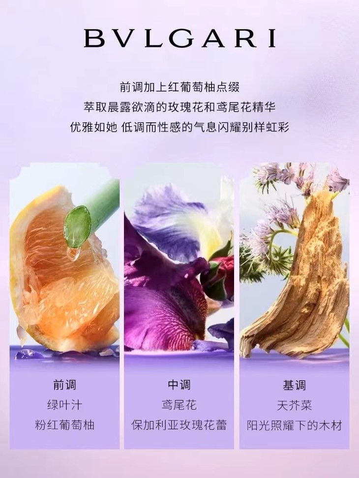 👑宝格丽紫水晶淡香水—30ml/50ml 新版 💜瓶身延续晶彩系列独特而经典的设计【交接圆形设计】 💐特殊的【木质花香调】,比较浓郁绵长的花香在里头 🌹保加利亚玫瑰丝绒般的雅致,鸢尾花的神秘,传递低调奢华的诱人气息 👍紫水晶是万年必推的香水,淑女感纯纯,不失甜美的东方古典香气🌬 🌟从紫水晶的珍贵光芒中汲取灵感,给人一种高贵的诱惑 😳适合优雅个性且纯粹的年轻女性,初恋气质满满,斩男必备哦!