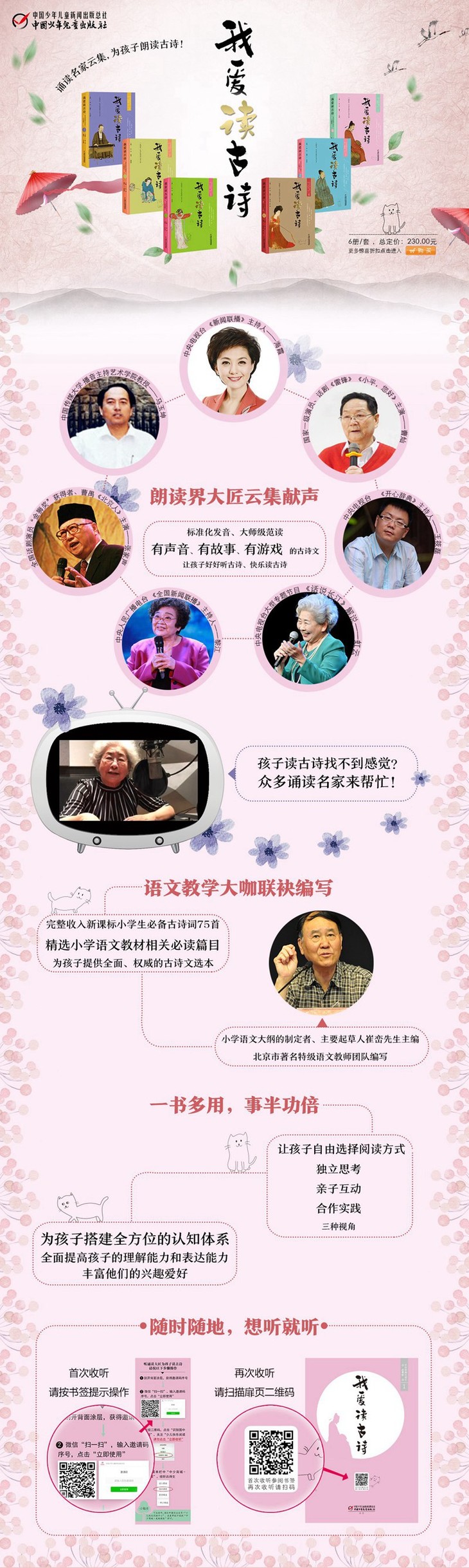 《我爱读古诗》(全6册)是为小学生量身打造的国学启蒙读本,旨在引导小读者学习和欣赏古典诗文,帮助他们进一步加深对古诗文的认识和理解,提高他们自主学习和鉴赏国学经典文本的能力,从而促使他们建立起对中国传统文化的浓厚兴趣,懂得发现美、感受美、传播美。