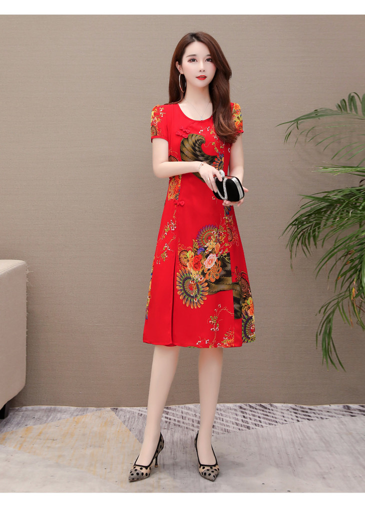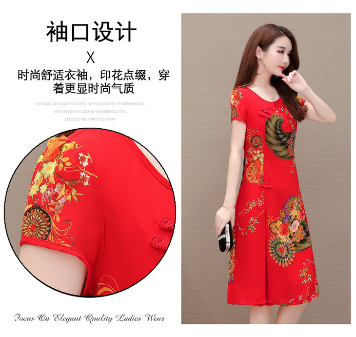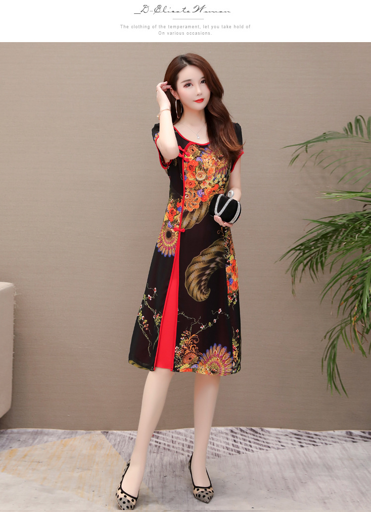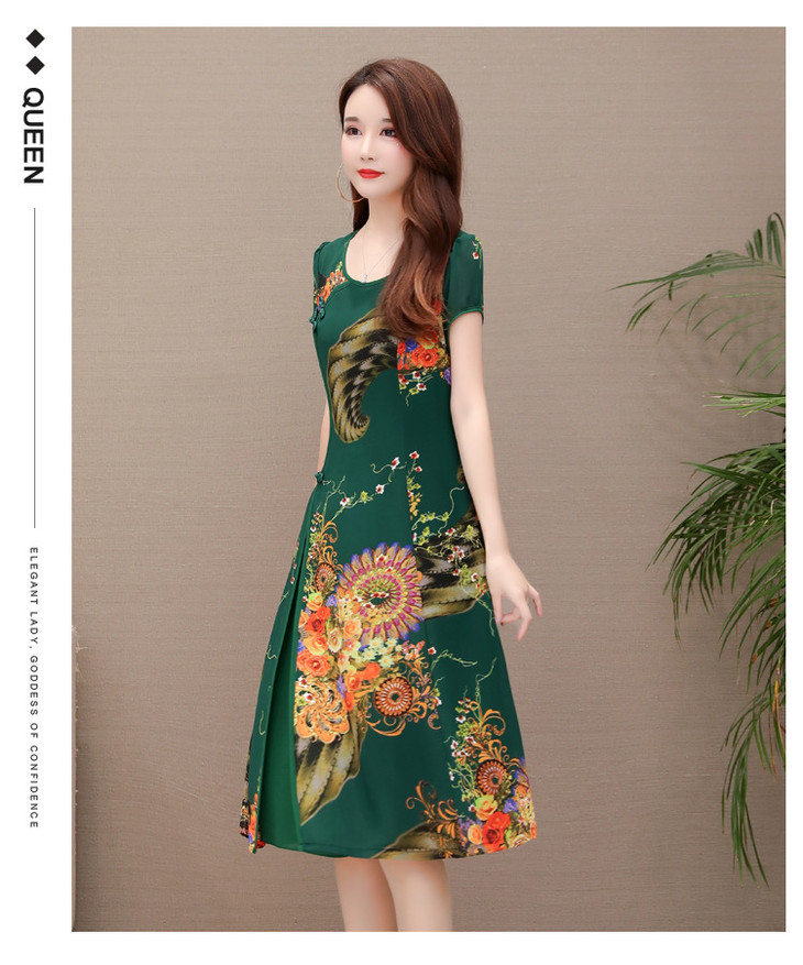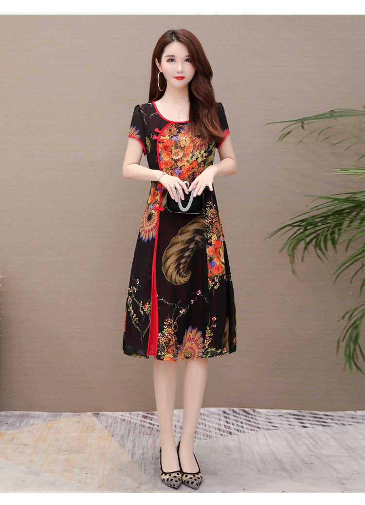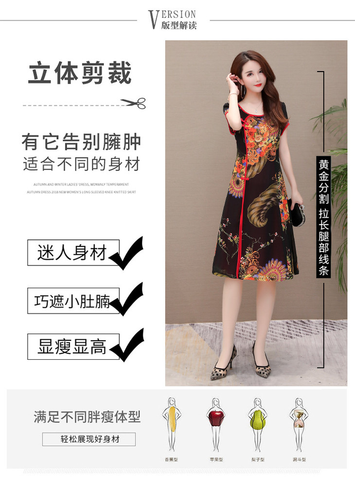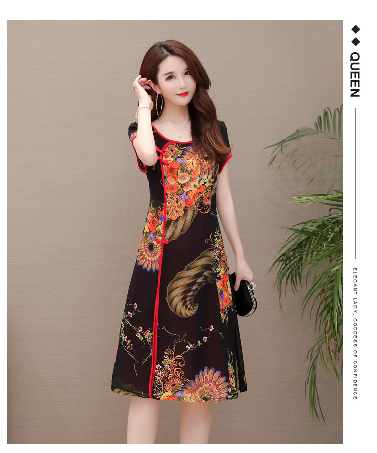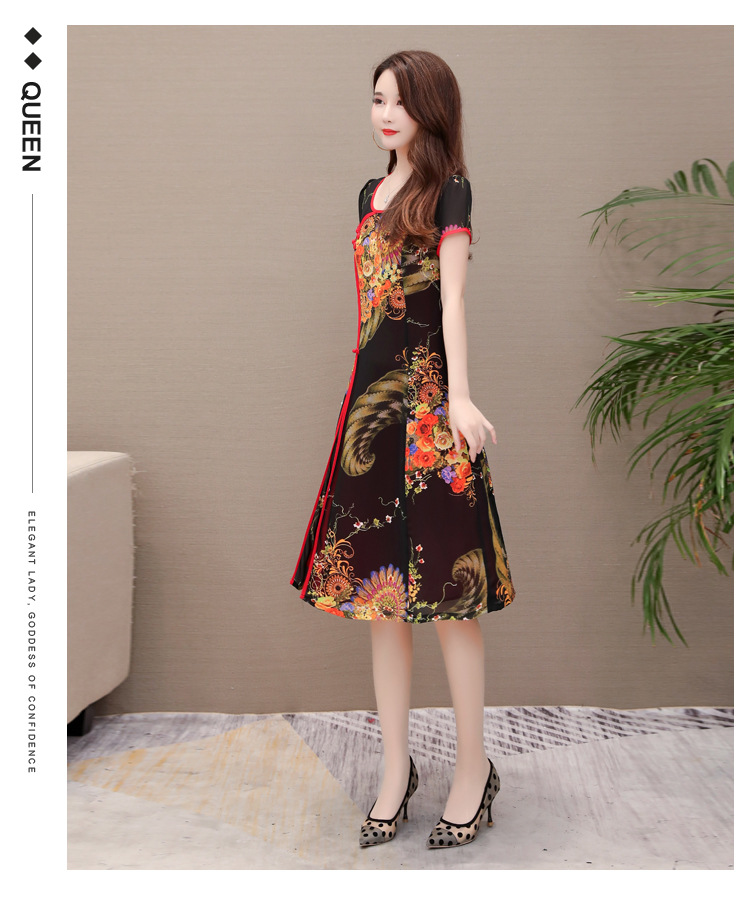 YPY 14916 阔太太连衣裙印花中长款中老年遮肚子改良民族风旗袍式