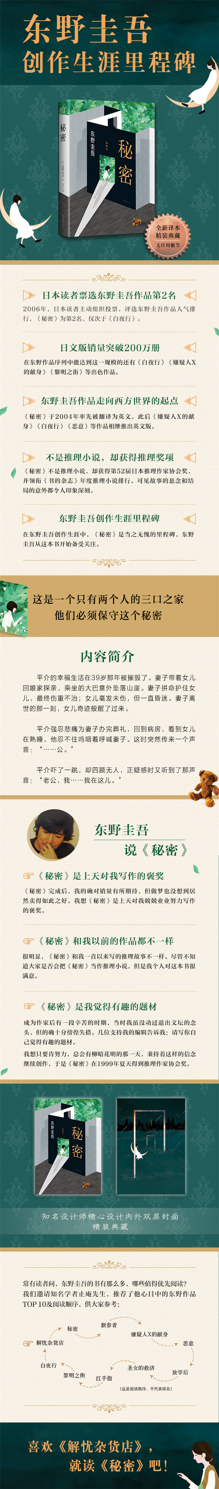 在东野圭吾创作生涯中,《秘密》是当之无愧的里程碑,东野圭吾从这本书开始备受关注。