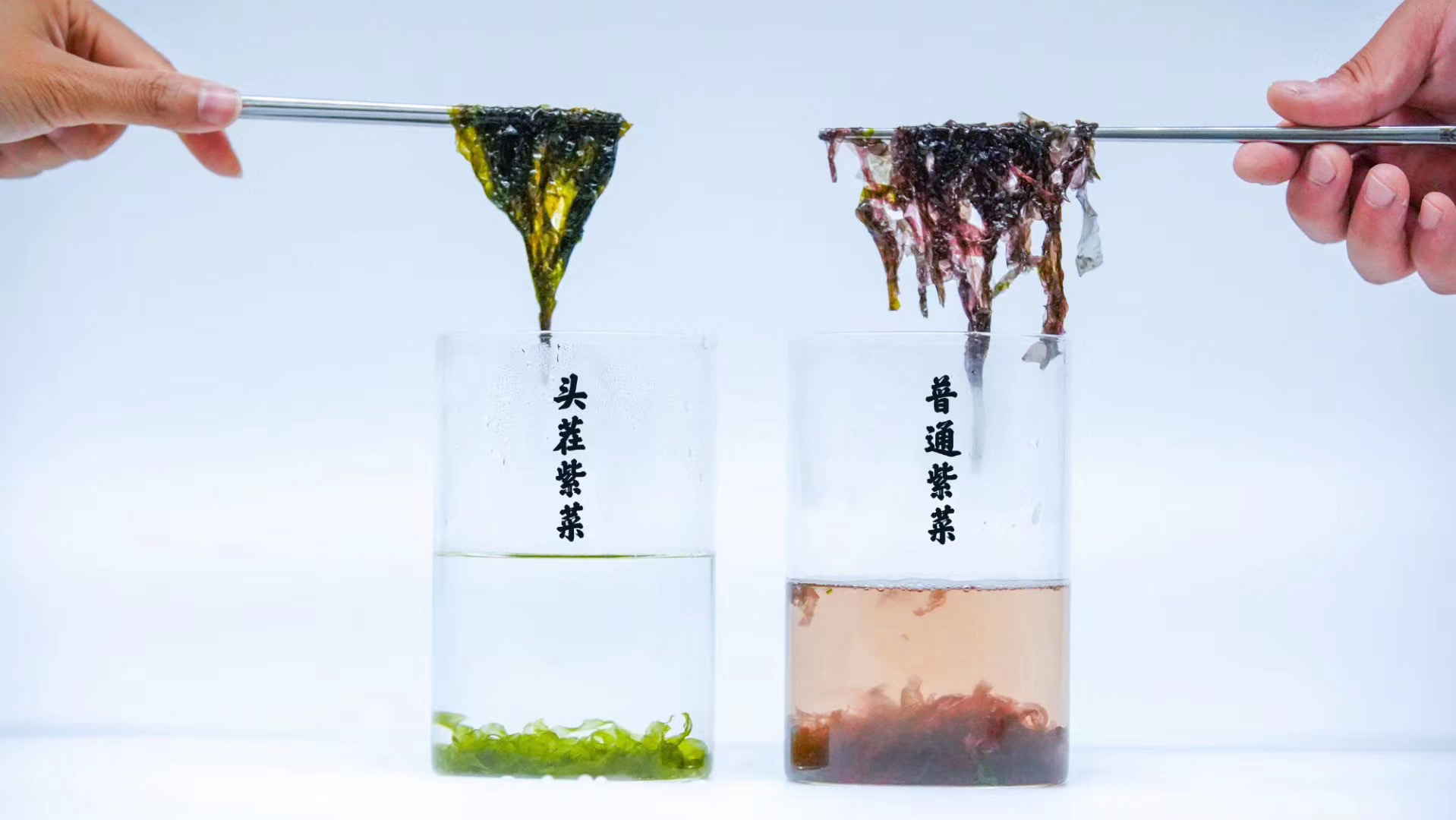 冷水泡发后,紫菜里的藻红素蛋白会溶解在水中,因此会呈现紫色。而用开水煮,紫菜妈妈的头茬紫菜是绿色的。