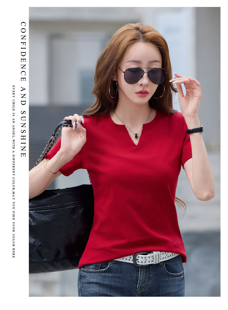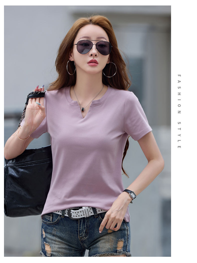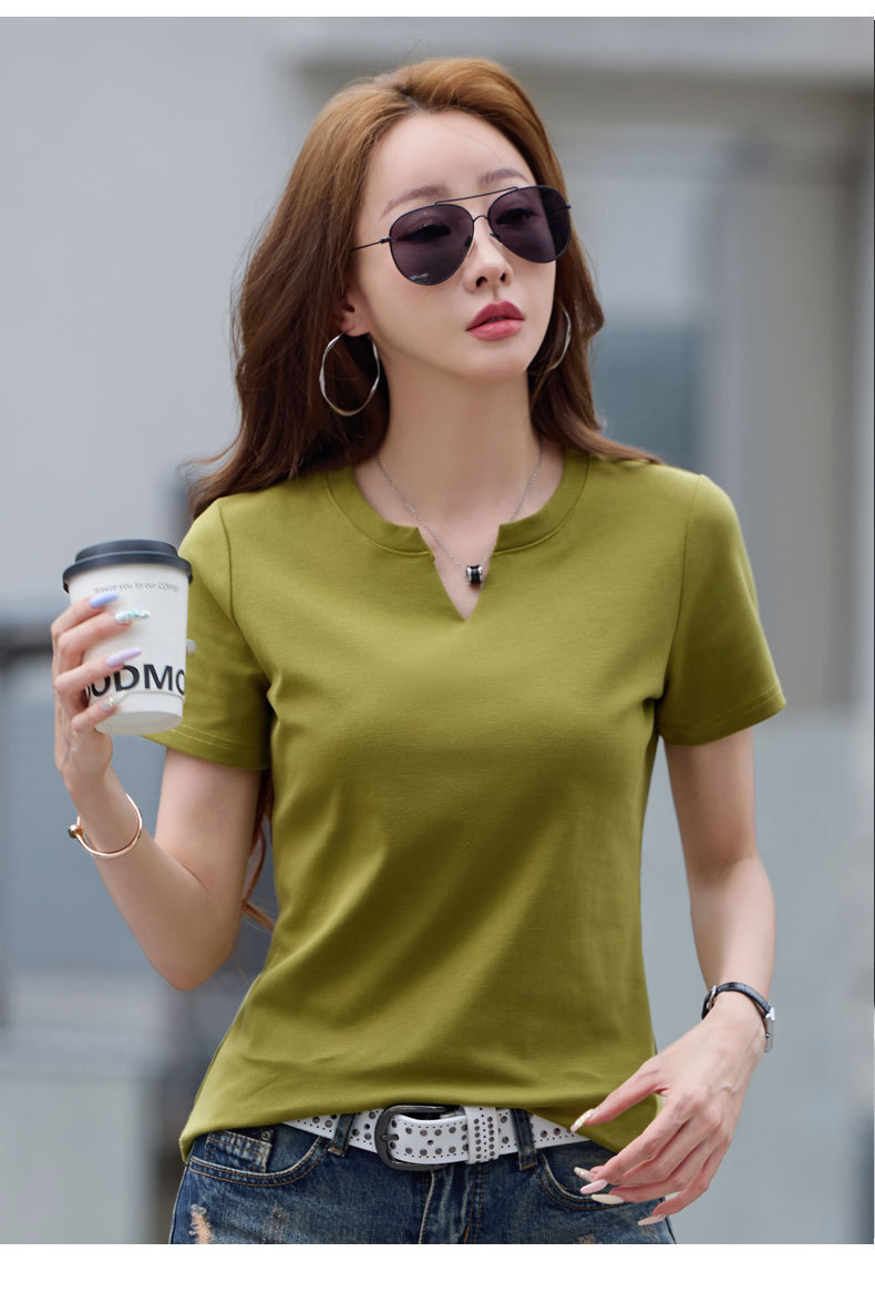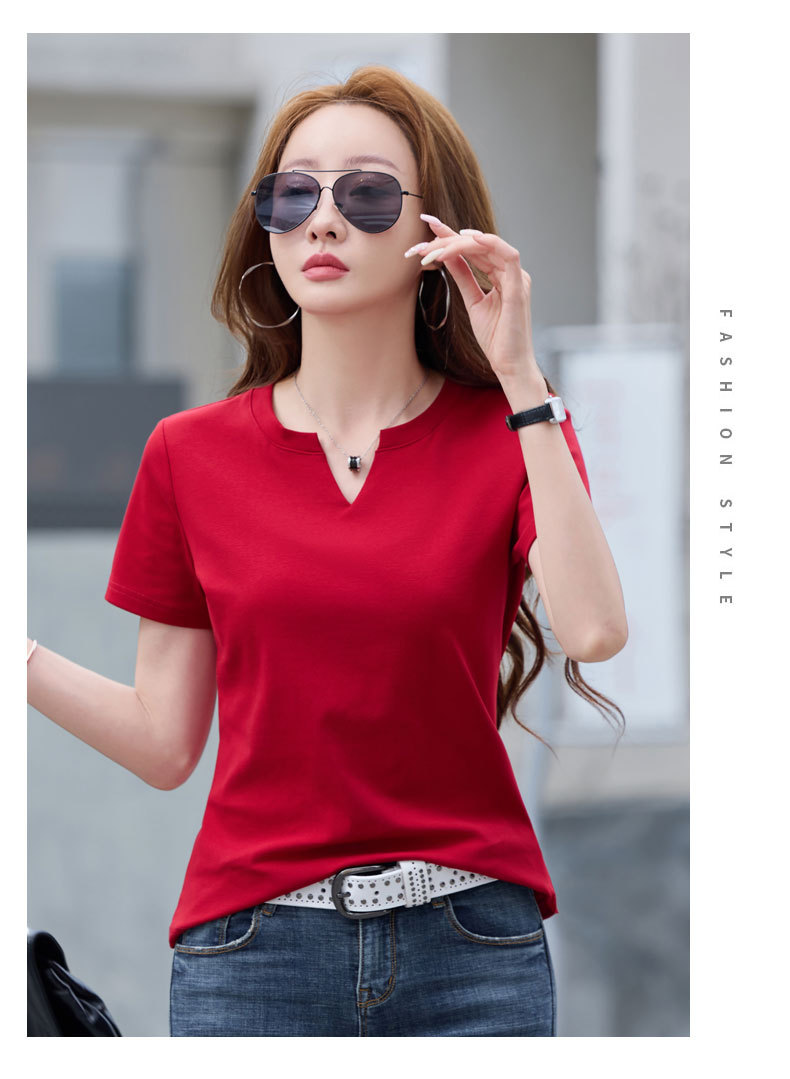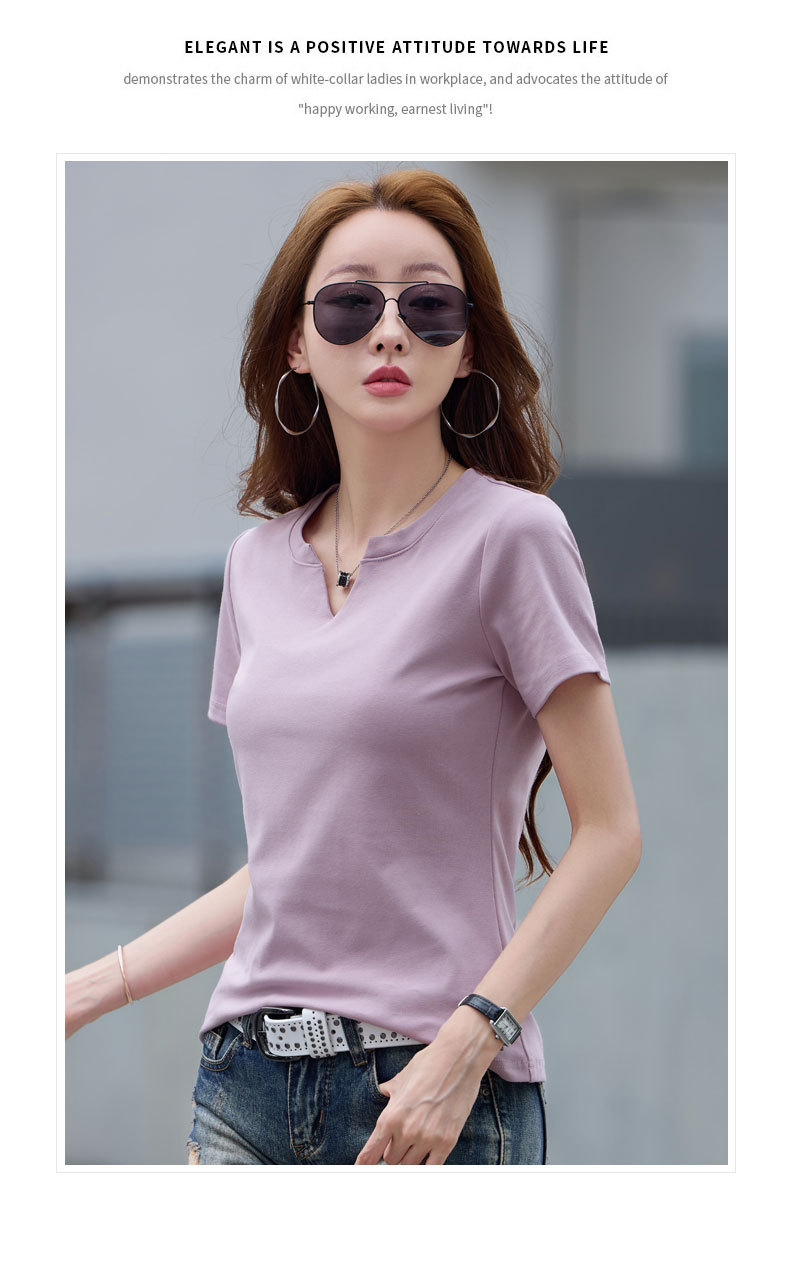 百媚生 棉质短袖小V领纯色T恤6621