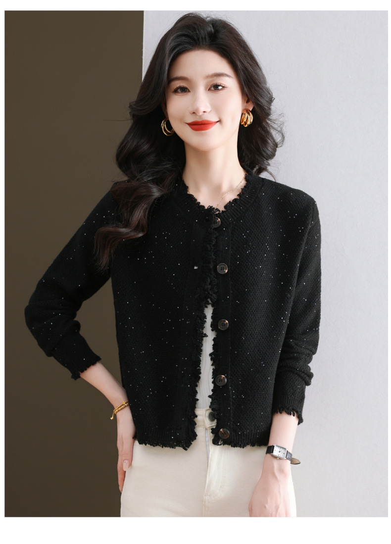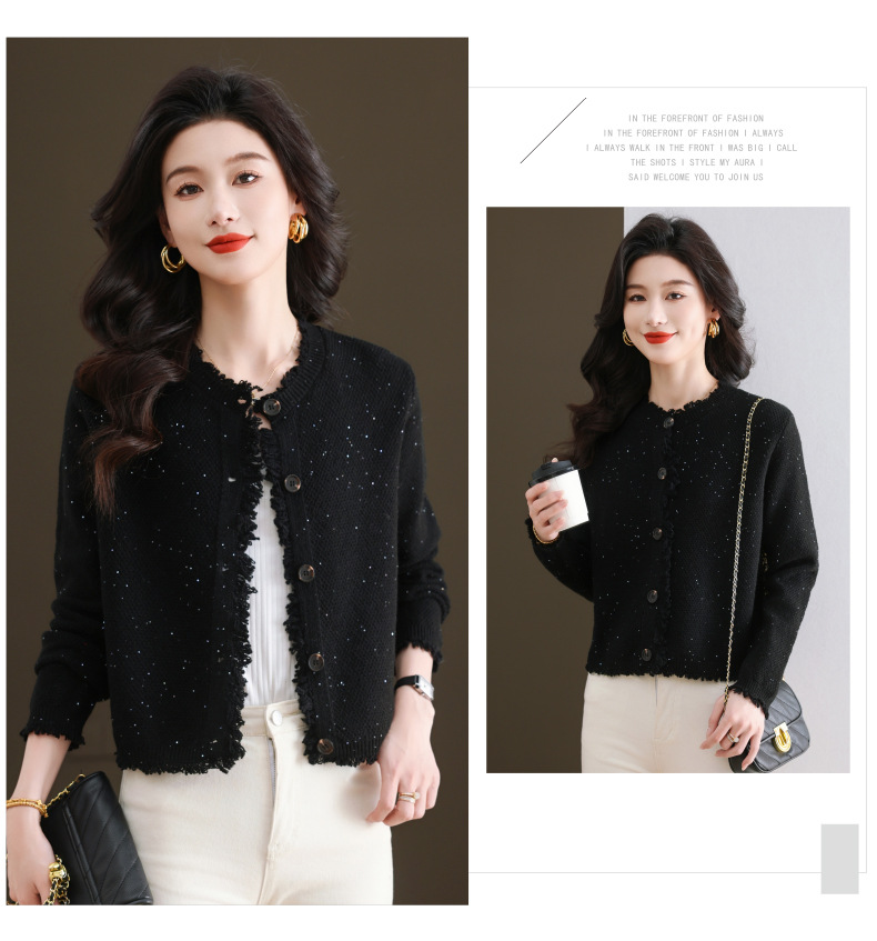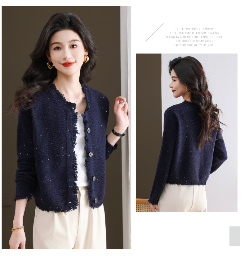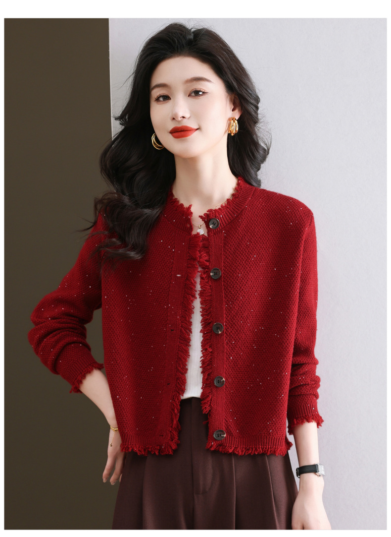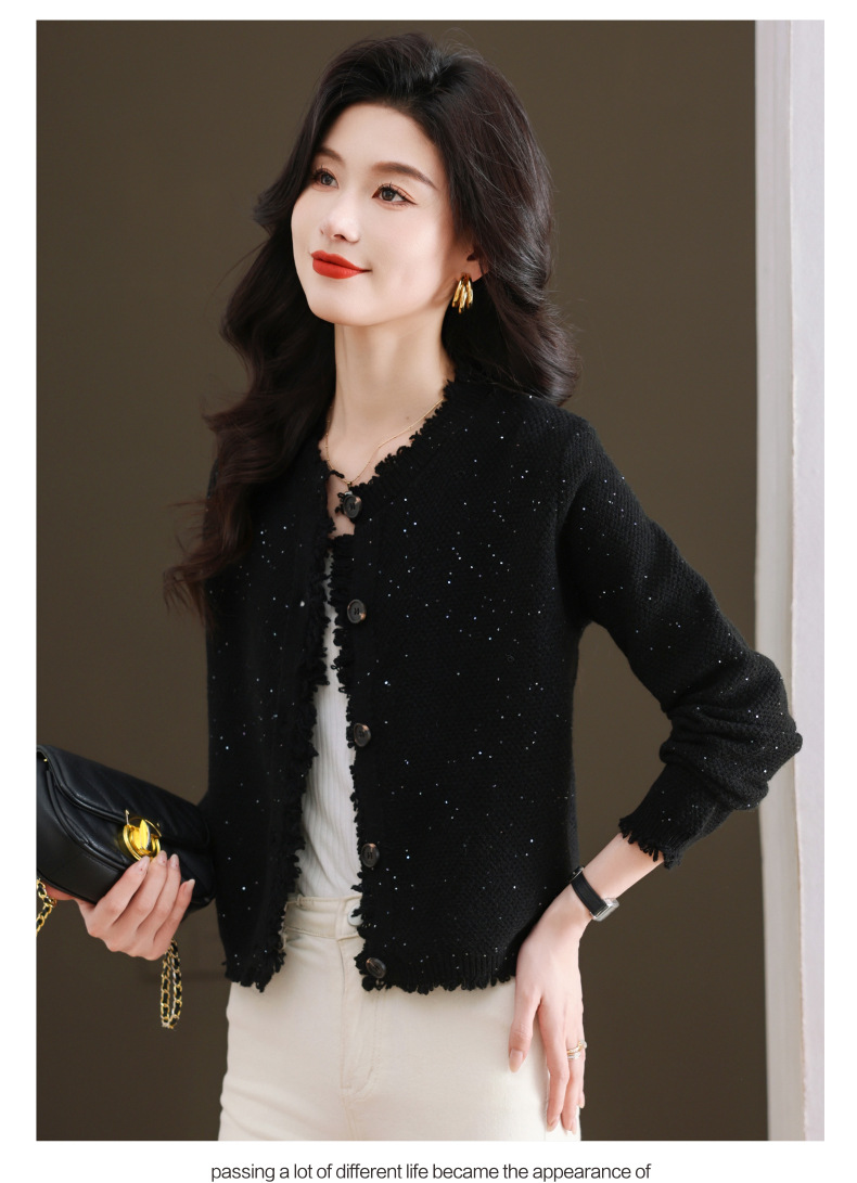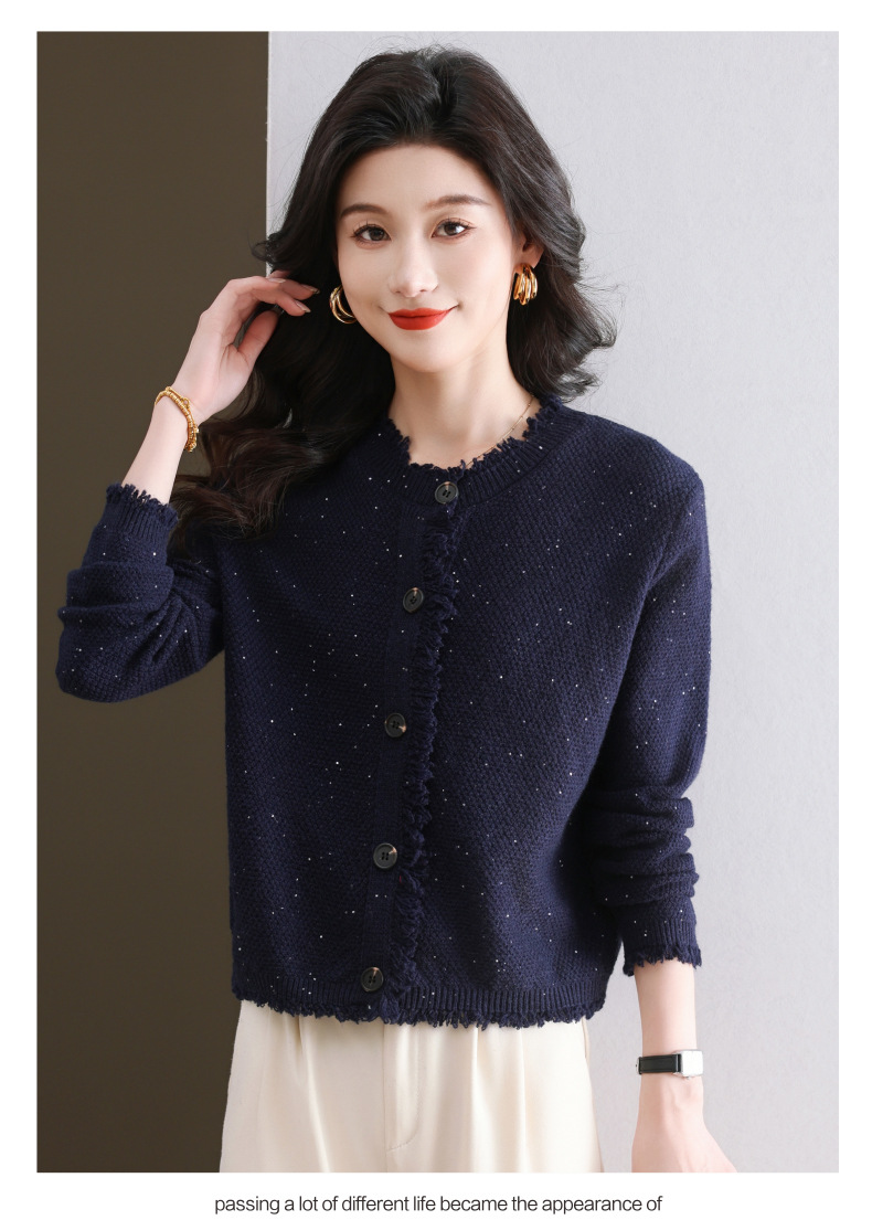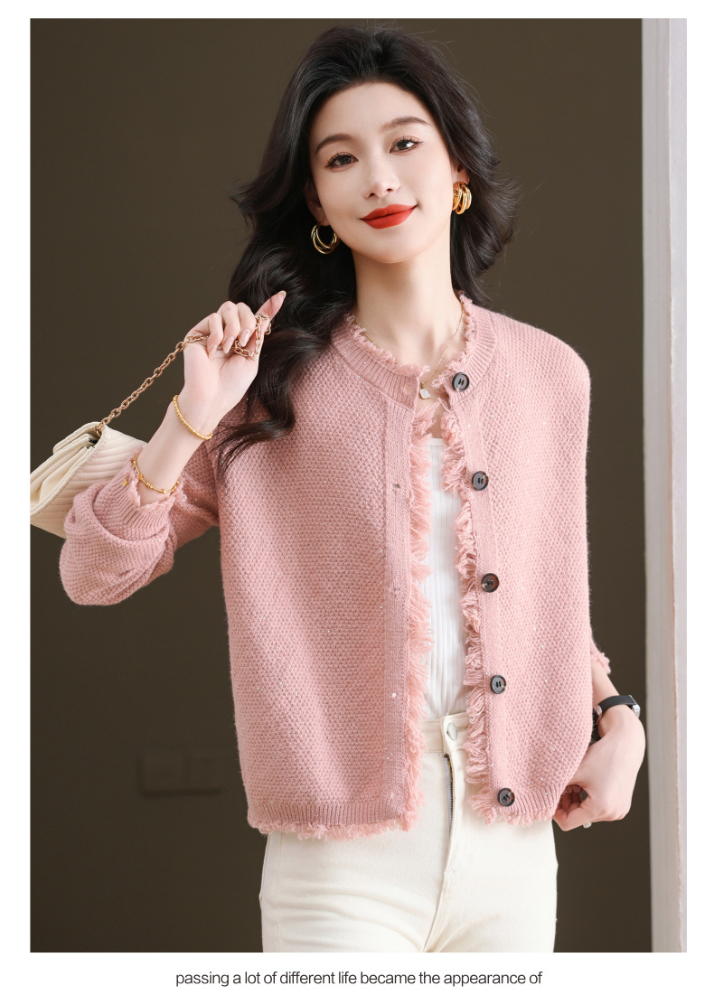 CC-103-66303春秋季小个子圆领外套女士2025新款洋气流苏针织亮片短款毛衣开衫