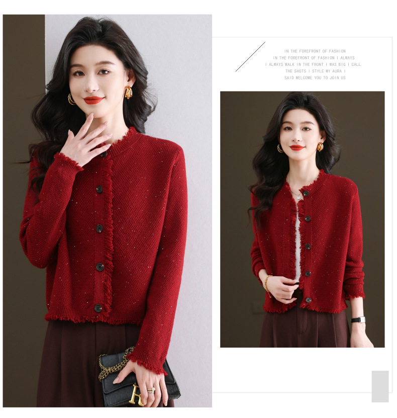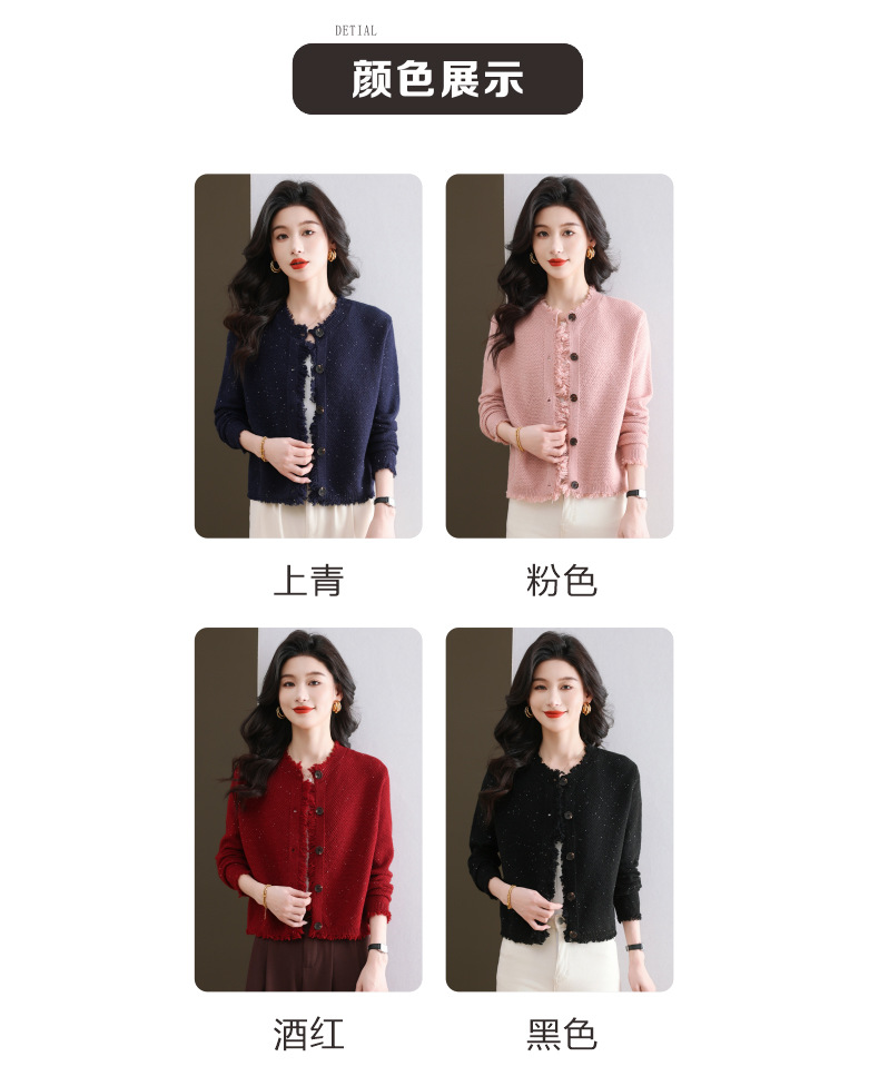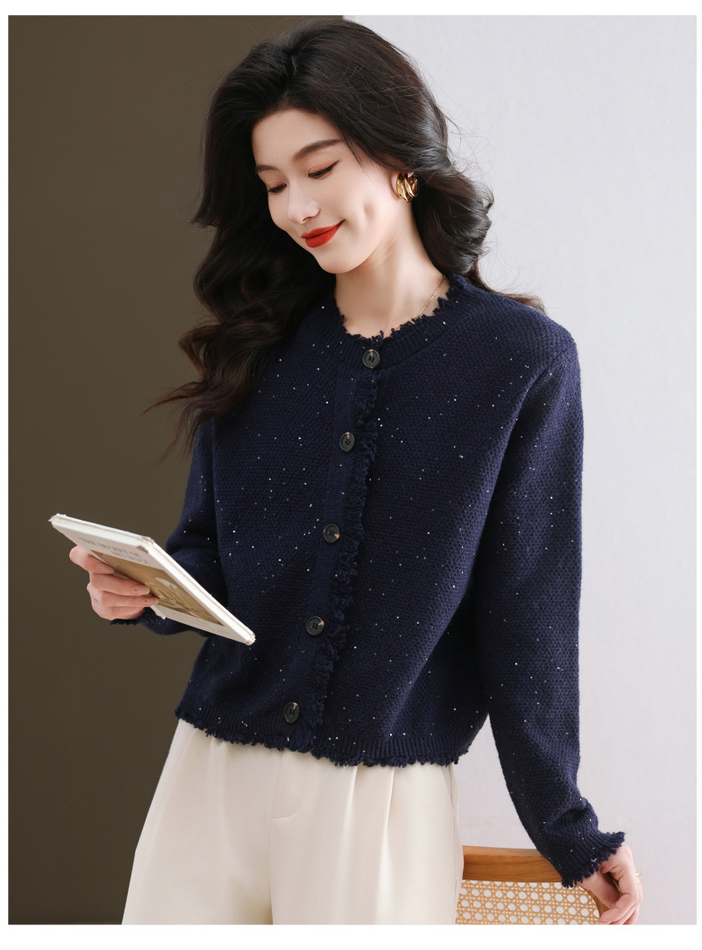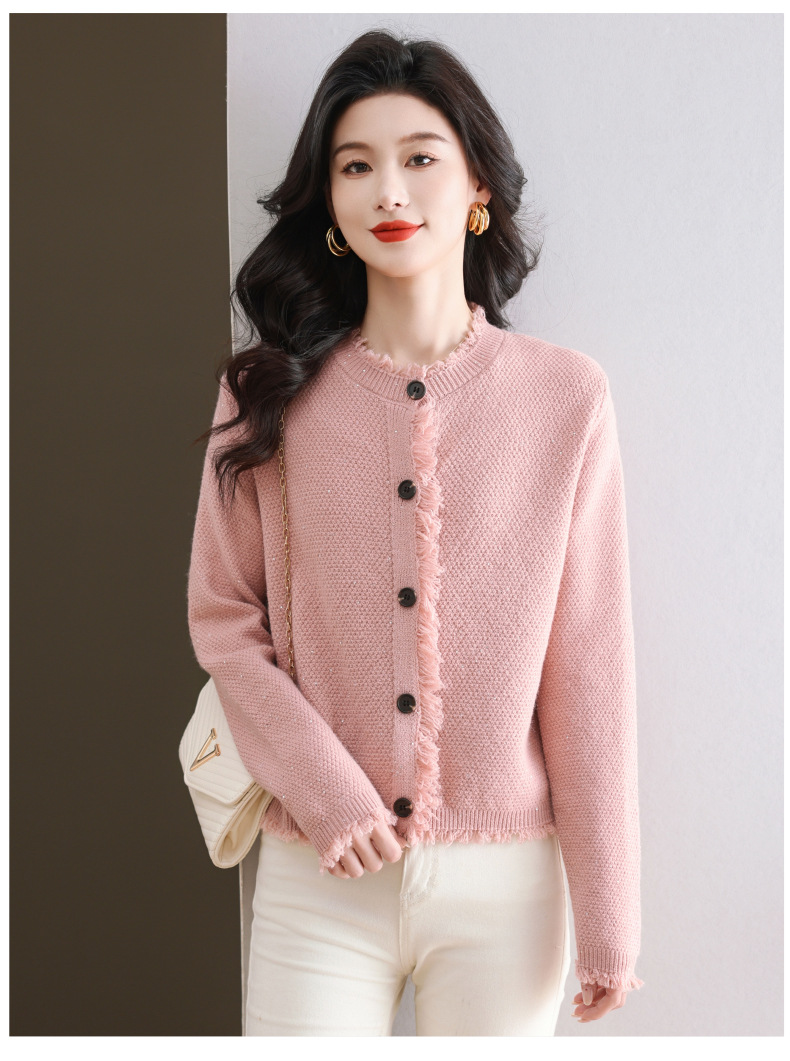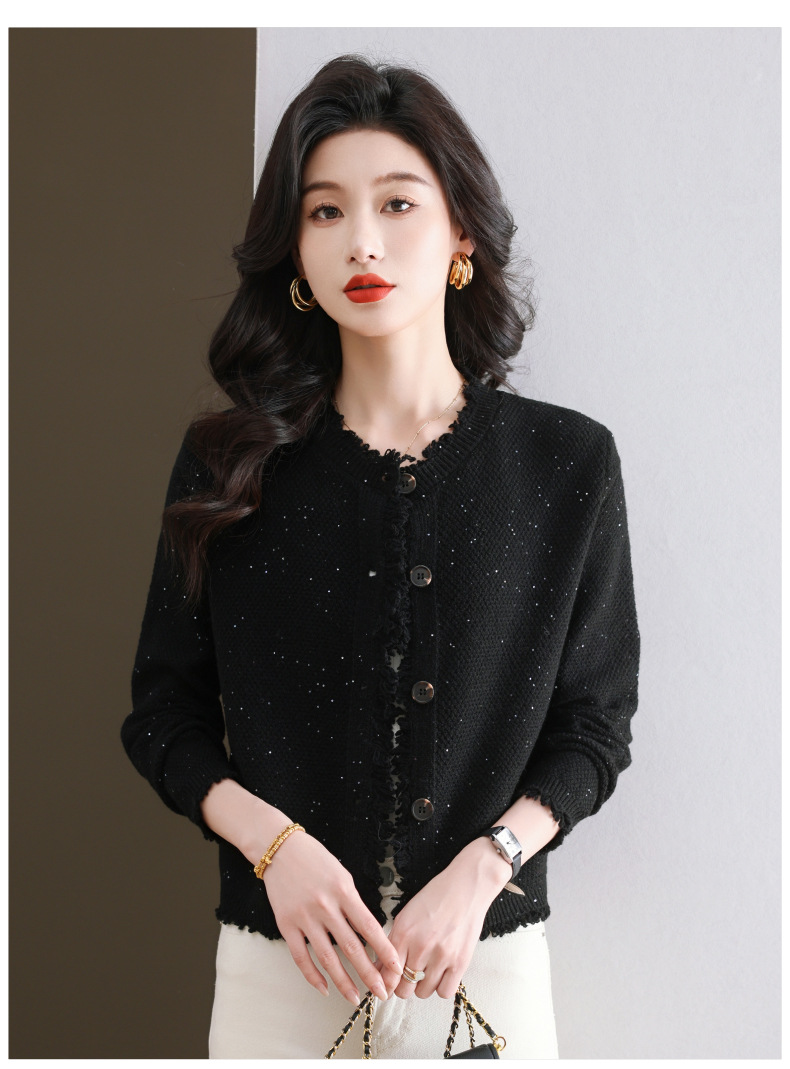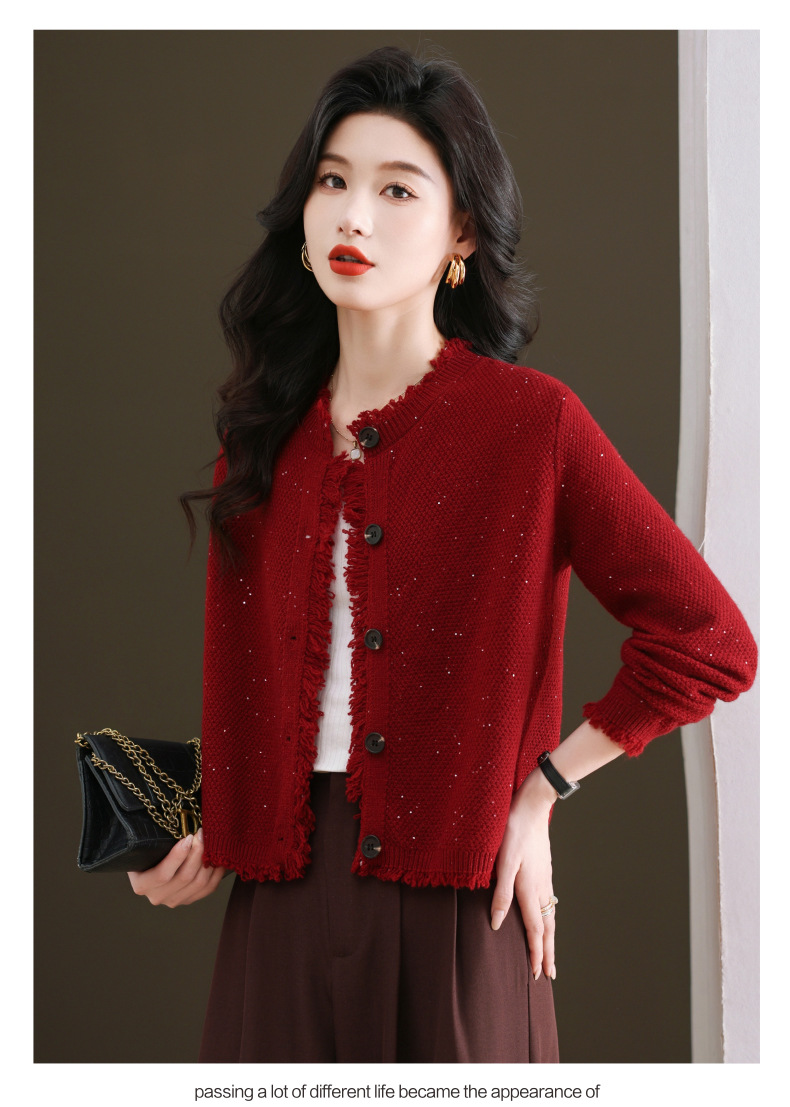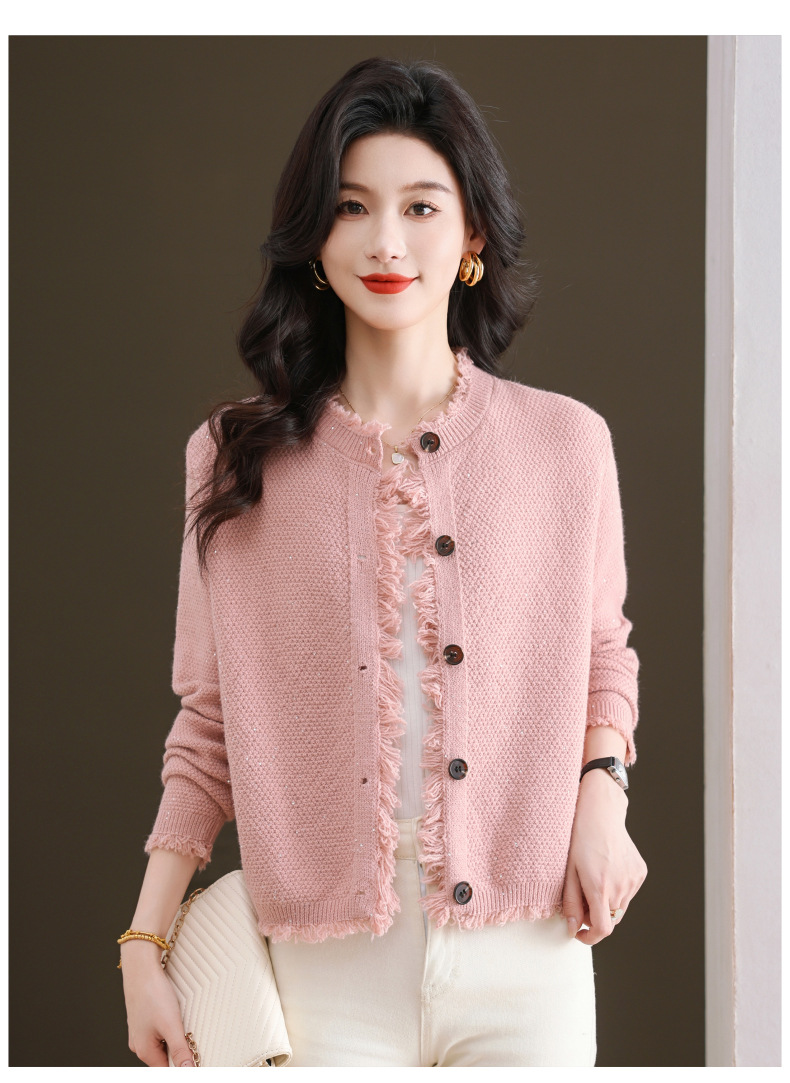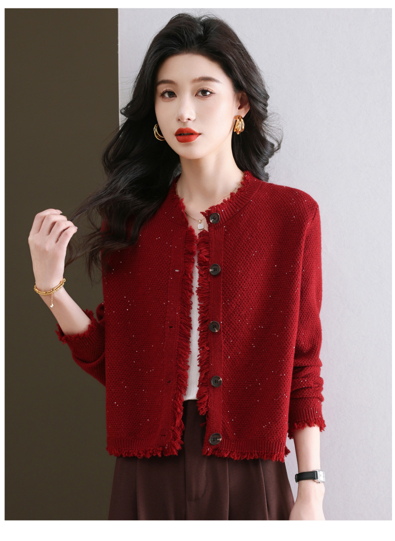 CC-103-66303春秋季小个子圆领外套女士2025新款洋气流苏针织亮片短款毛衣开衫
