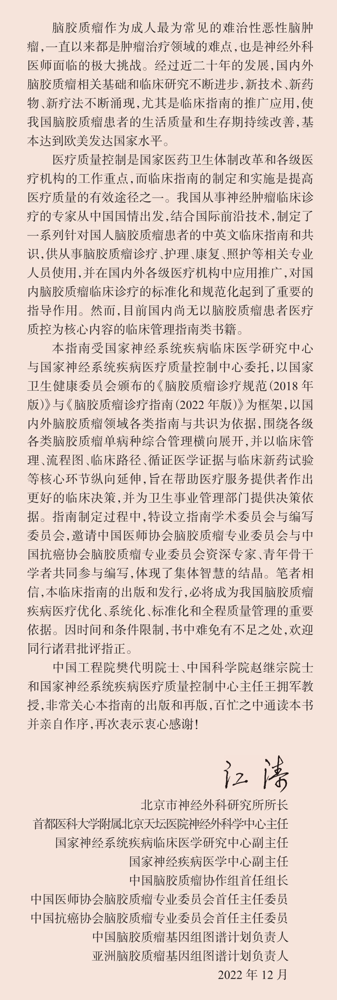 本指南受国家神经系统疾病临床医学研究中心与国家神经系统疾病医疗质量控制中心委托,以国家卫生健康委员会颁布的《脑胶质瘤诊疗规范(2018年版)》与《脑胶质瘤诊疗指南(2022 年版)》为框架,以国内外脑胶质瘤领域各类指南与共识为依据,围绕各级各类脑胶质瘤单病种综合管理横向展开,并以临床管理、流程图、临床路径、循证医学证据与临床新药试验等核心环节纵向延伸,旨在帮助医疗服务提供者作出更好的临床决策,并为卫生事业管理部门提供决策依据。指南制定过程中,特设立指南学术委员会与编写委员会,邀请中国医师协会脑胶质瘤专业委员会与中国抗癌协会脑胶质瘤专业委员会资深专家、青年骨干学者共同参与编写,体现了集体智慧的结晶。