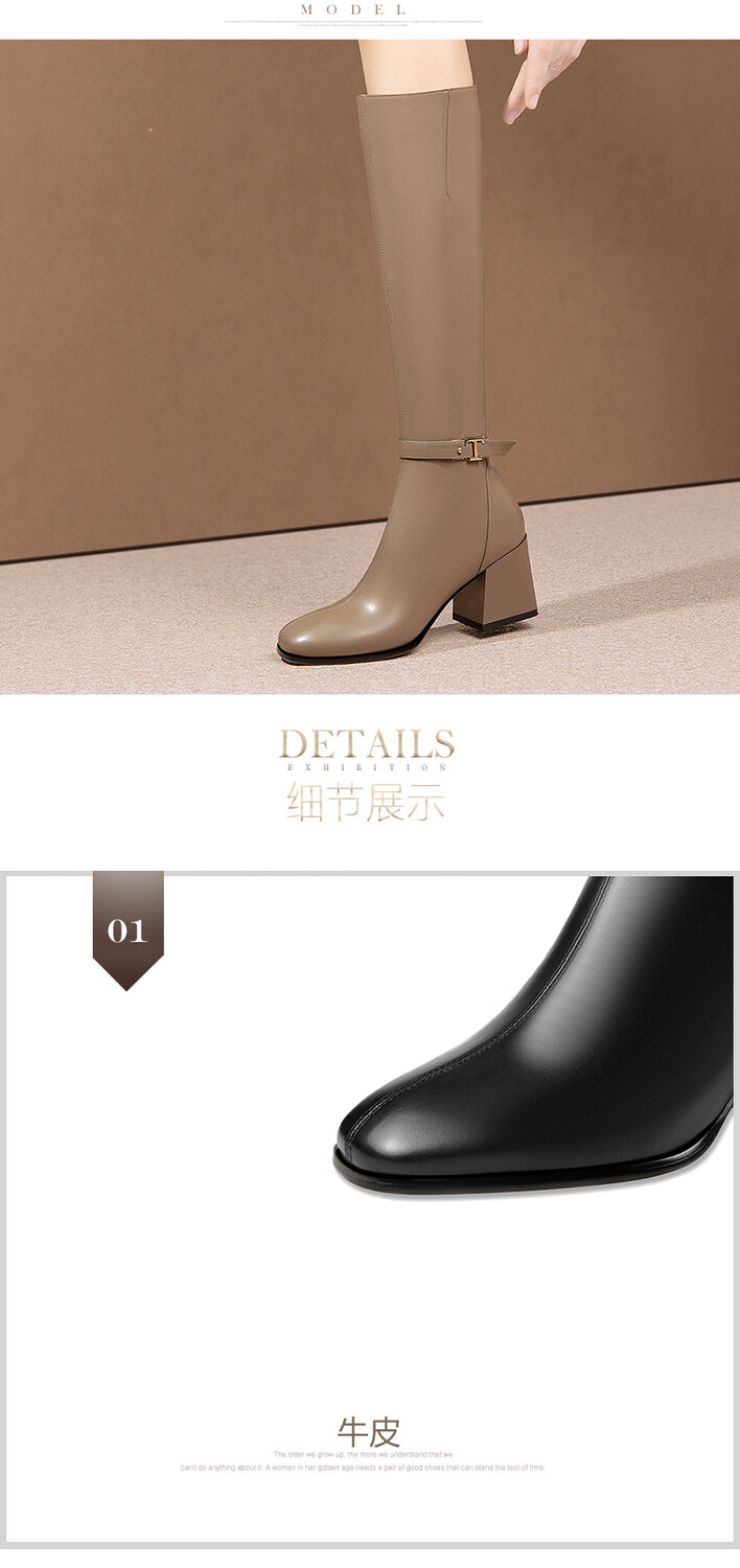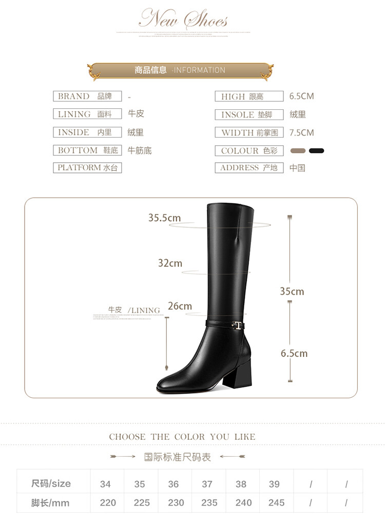 【商品尺码】:33-43(大小定制不退换)【筒高】:35cm(15寸)【跟 高】:6.5cm(烤漆跟)【鞋面材质】: 牛皮(牛贴皮)【垫脚-里皮】:保暖绒里