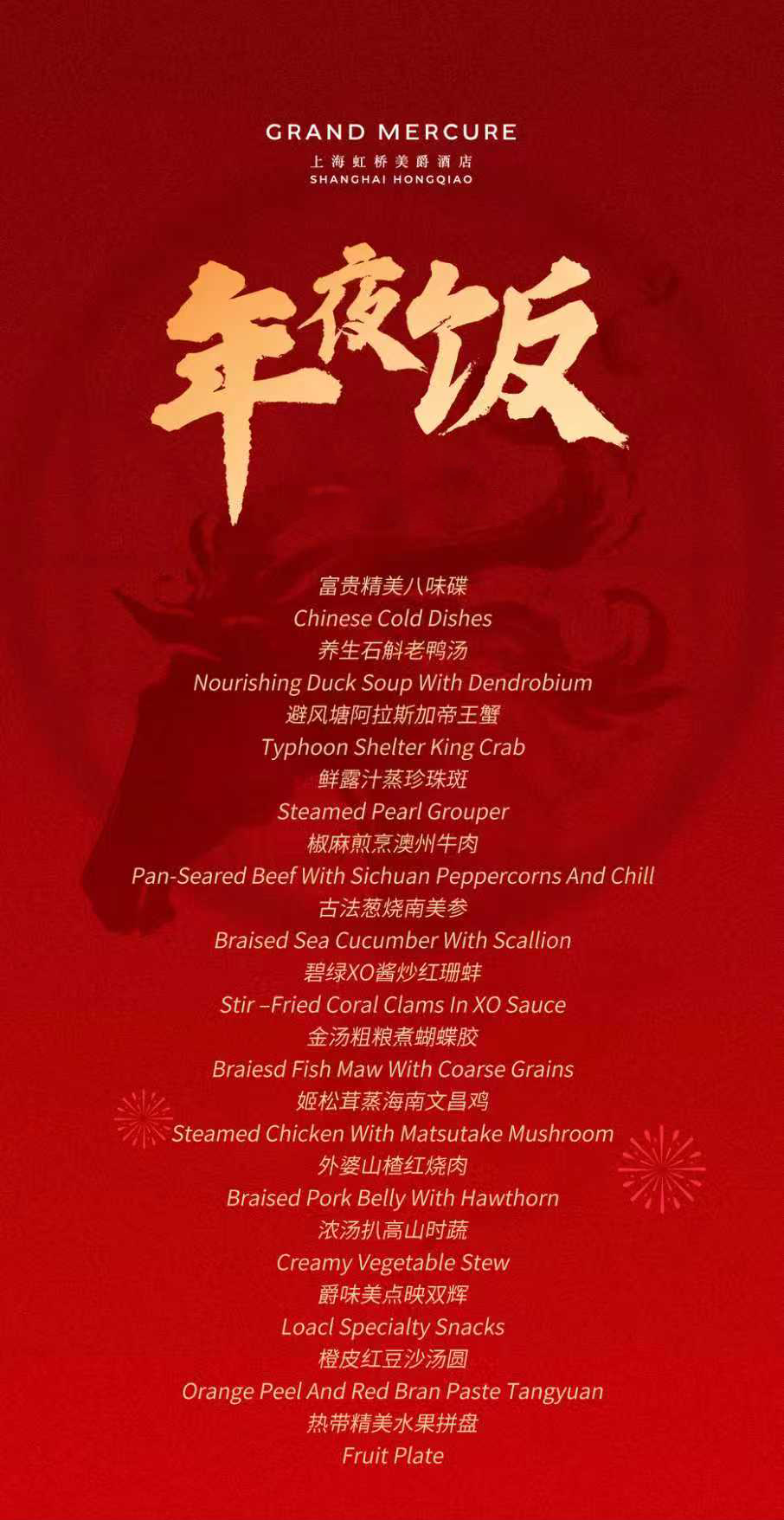 ★沪上年夜饭★ ¥5499起/套,住虹桥古北【上海虹桥雅高美爵酒店】,享1晚4间高级房+早餐+10人年夜饭!雅高旗下品牌酒店,周边吃喝玩乐丰富~2026年2月16日专享