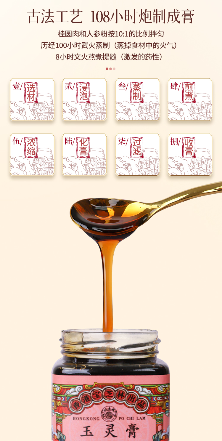 【品名】香港宝芝林玉灵膏 【品牌】关德兴 【规格】300g*4罐 【保质期】12个月 【储存方法】避开阳光直射,置阴凉干燥处,开封后需冷藏 【禁忌人群】孕妇、未满岁婴儿、糖尿病患者不宜饮用,对本品原料过敏者禁服 【建议食用量】每天2次,每次1勺(约10-20g)用热水冲调搅拌均匀饮用。或者直接食用(冷藏后食用口感更佳) 【产地】安徽亳州 【发货地】安徽亳州 【发货快递】韵达 【不发货区域】新疆、西藏、港澳台地区不发 【补邮费地区】青海、内蒙古、甘肃、宁夏+15元/单 【发货时效】48小时,节假日顺延 |
