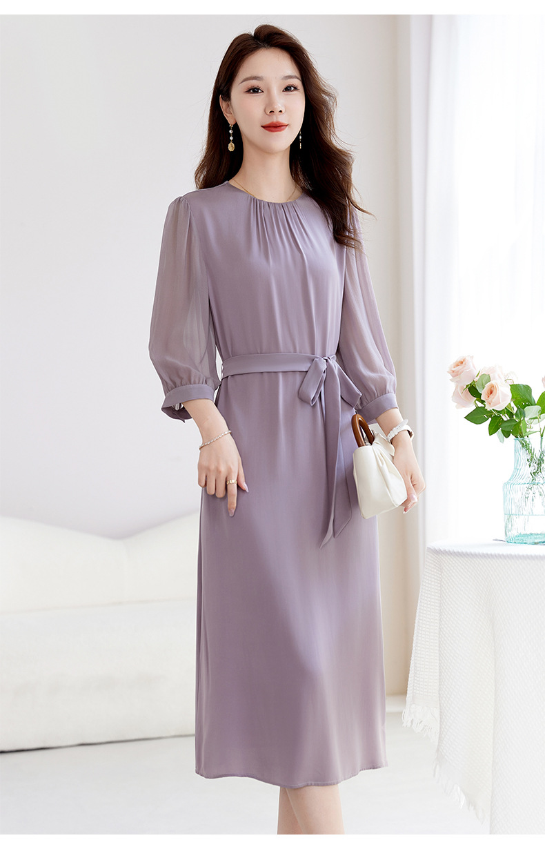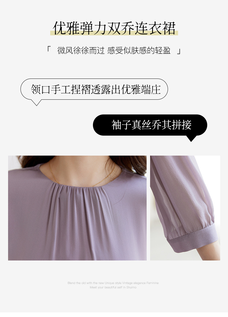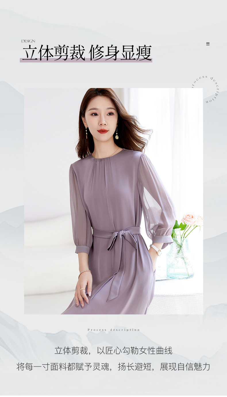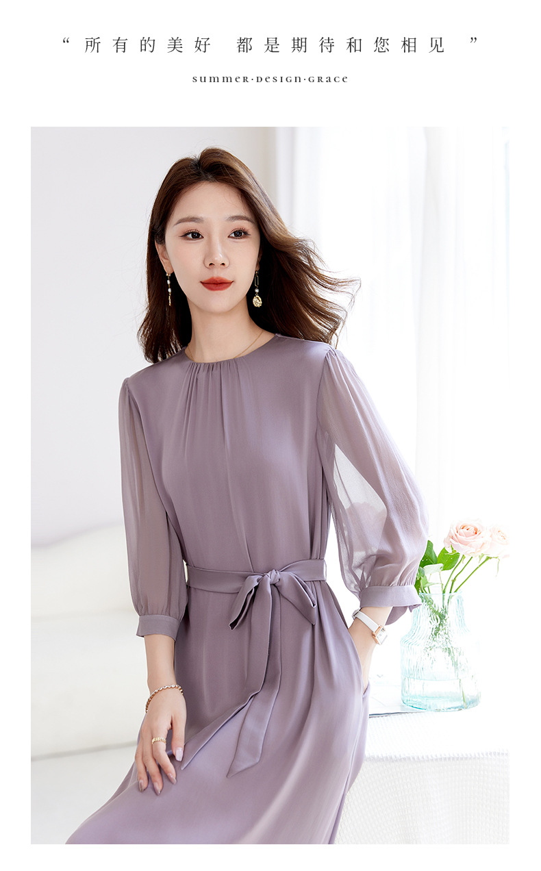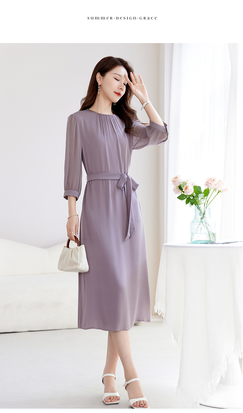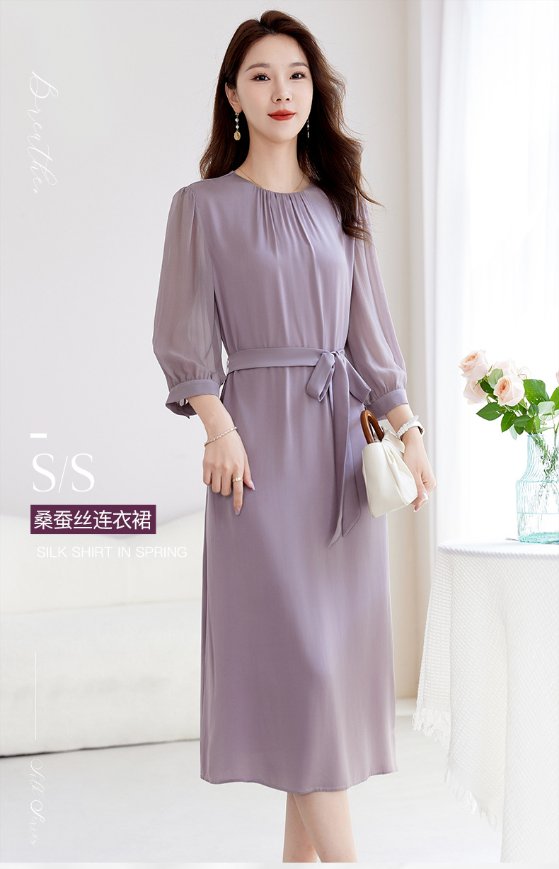 QS-82599200【桑蚕丝】素雅纯色真丝弹力双乔中长裙收腰夏桑蚕丝连衣裙女9200
