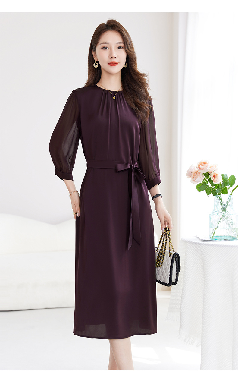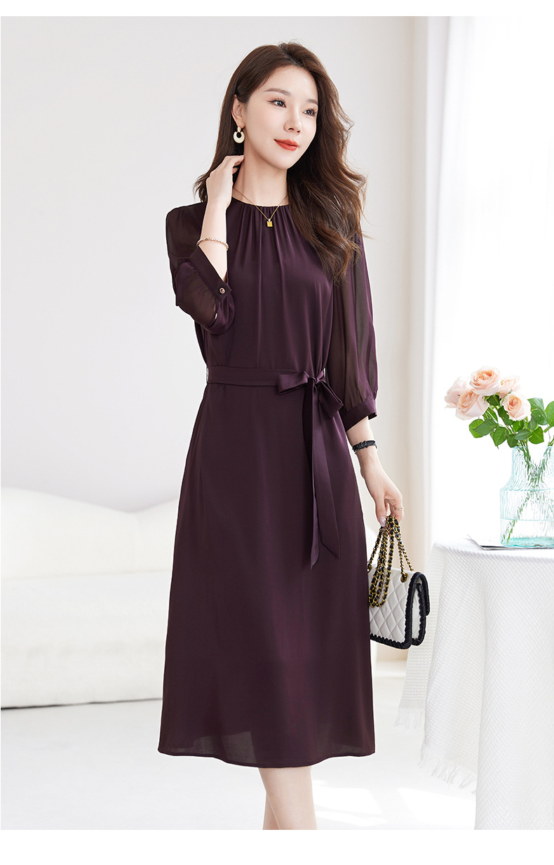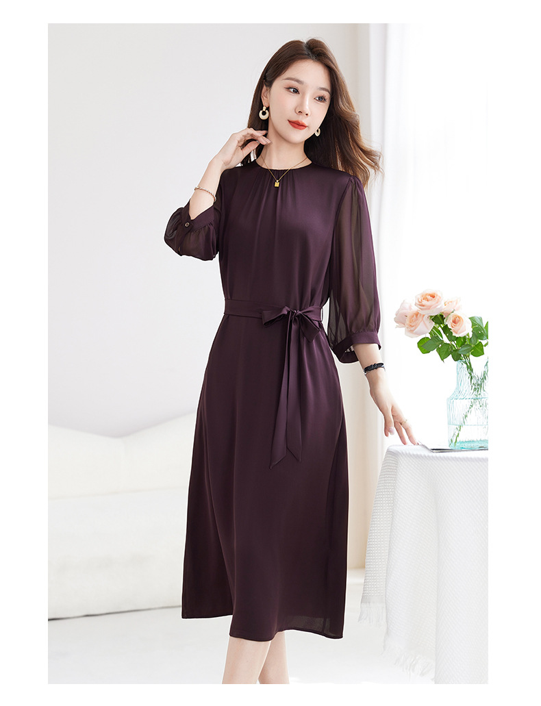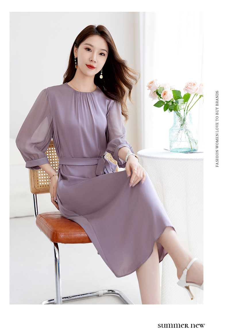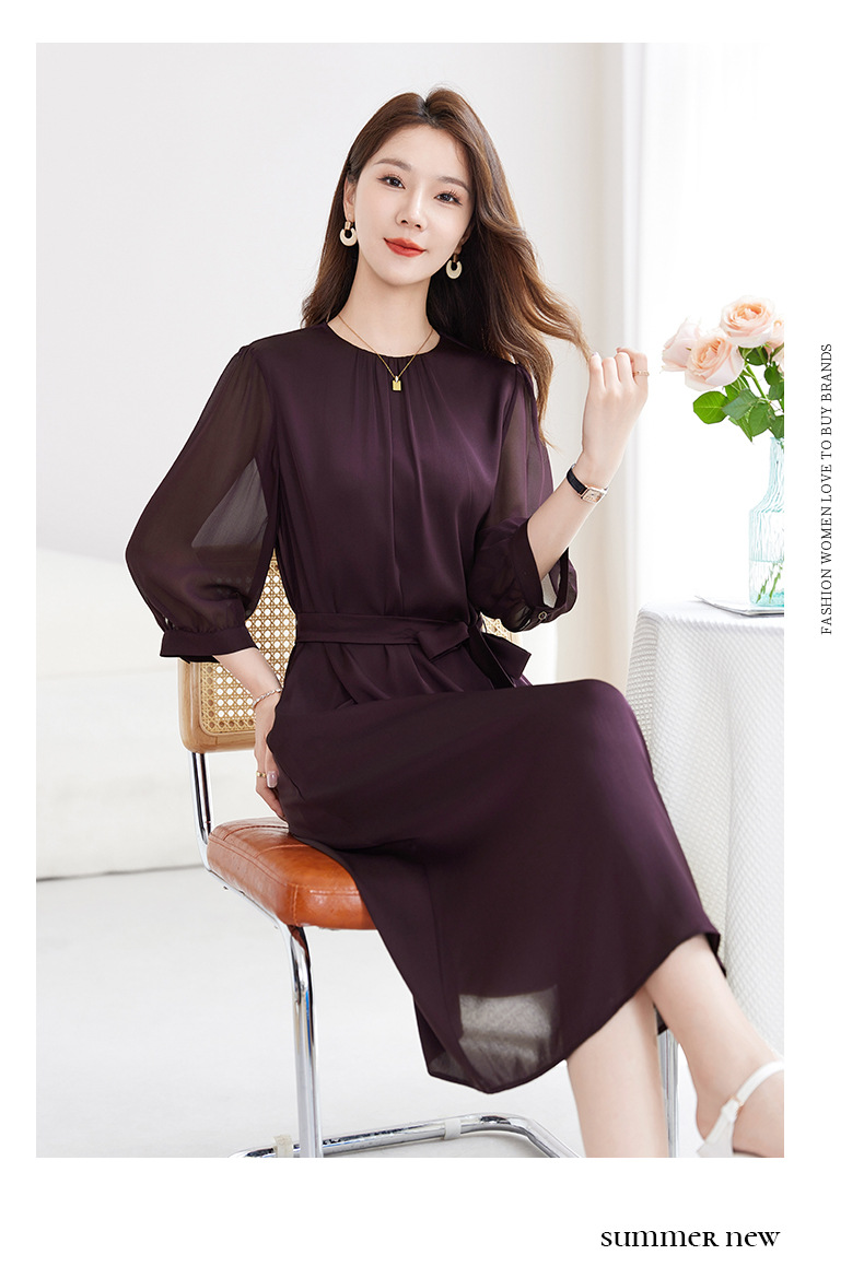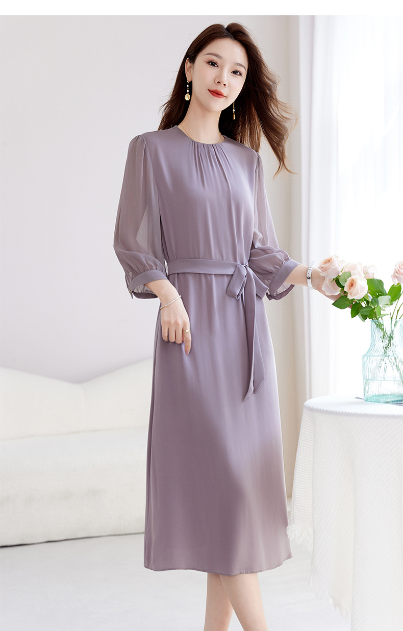 QS-82599200【桑蚕丝】素雅纯色真丝弹力双乔中长裙收腰夏桑蚕丝连衣裙女9200