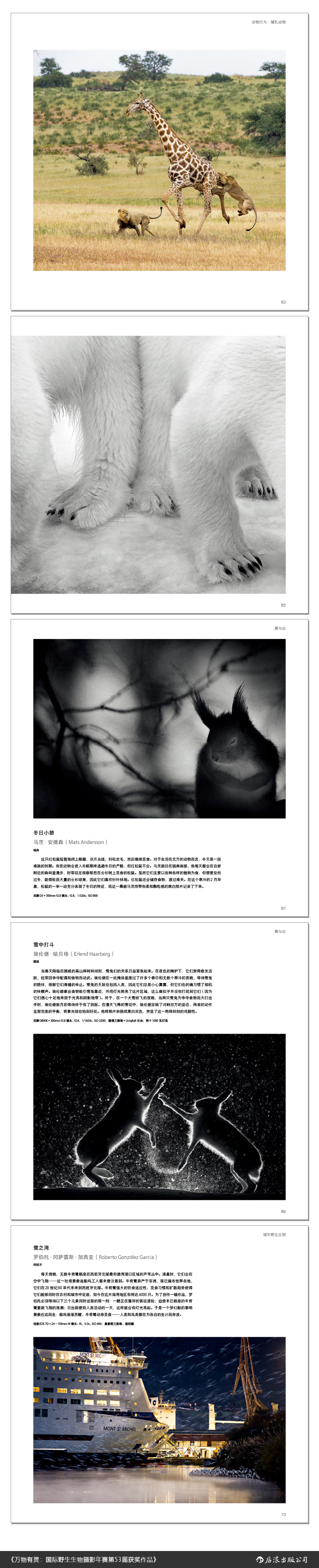 这些作品的主题包罗万象,既有动物行为与肖像,也有珍稀植物以及引人入胜的自然风光,同时包括水下摄影、黑白摄影等特殊类别,为自然界的所有面貌谱写了一曲赞歌。每张照片均配有一段文字,记述了摄影师令人难忘的拍摄经历以及照片背后蕴含的意义——鲜为人知的野生生物生活方式、诸多物种的脆弱以及它们面临的威胁。这一系列作品不仅歌颂了地球上的生命与自然之美,也呼吁人类减轻对自然界的施压。