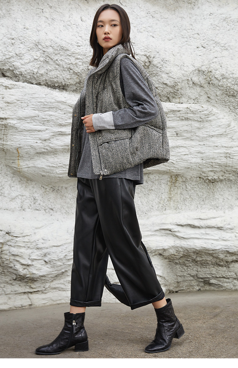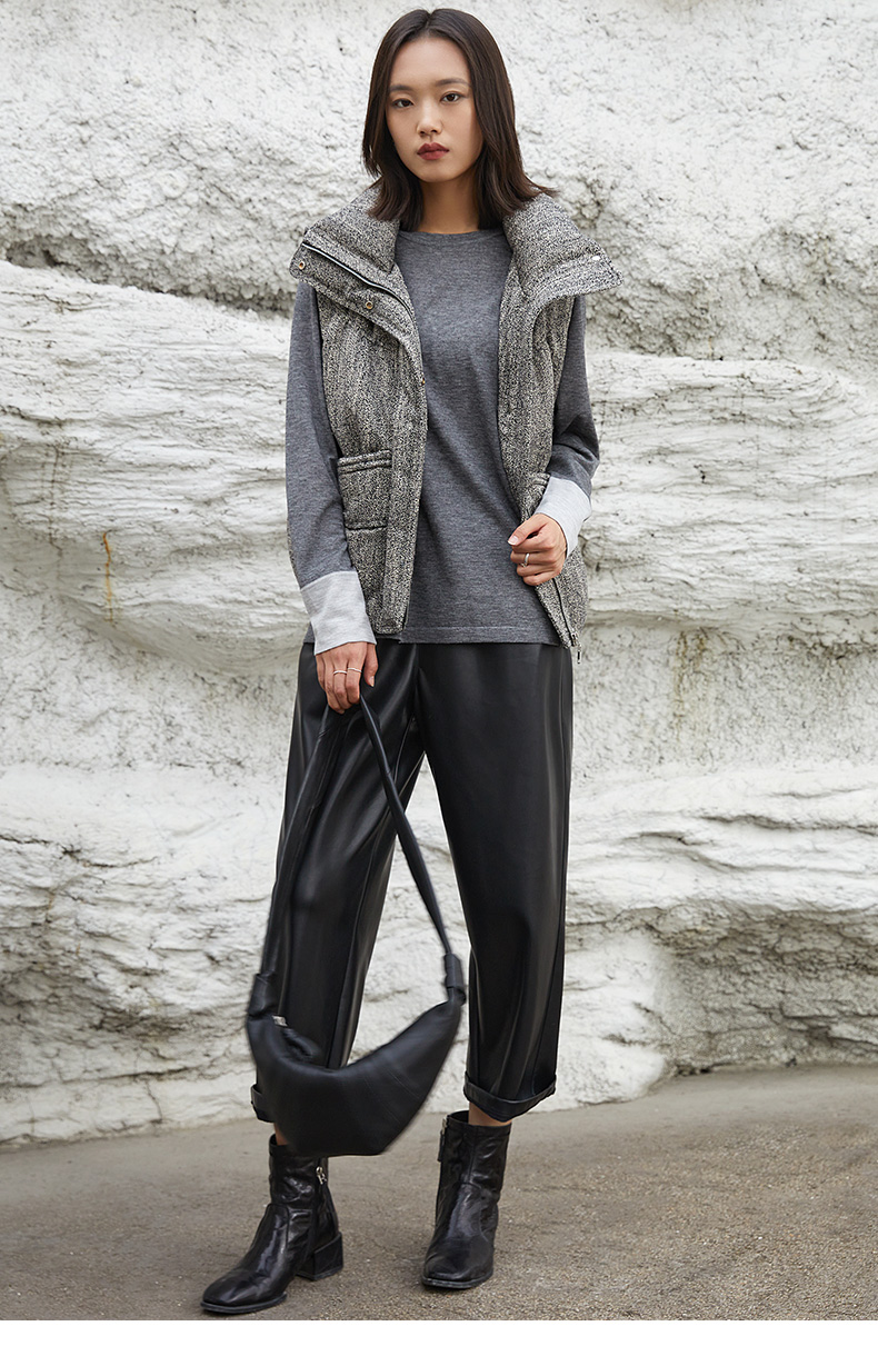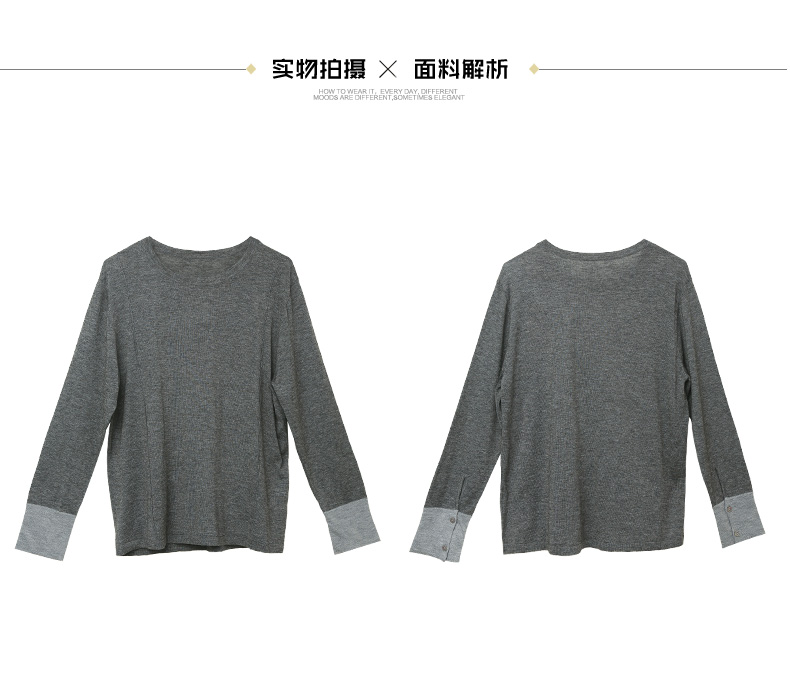 秋冬季新款灰色圆领长袖 T 恤女撞色袖口设计感小众宽松显瘦内搭上衣