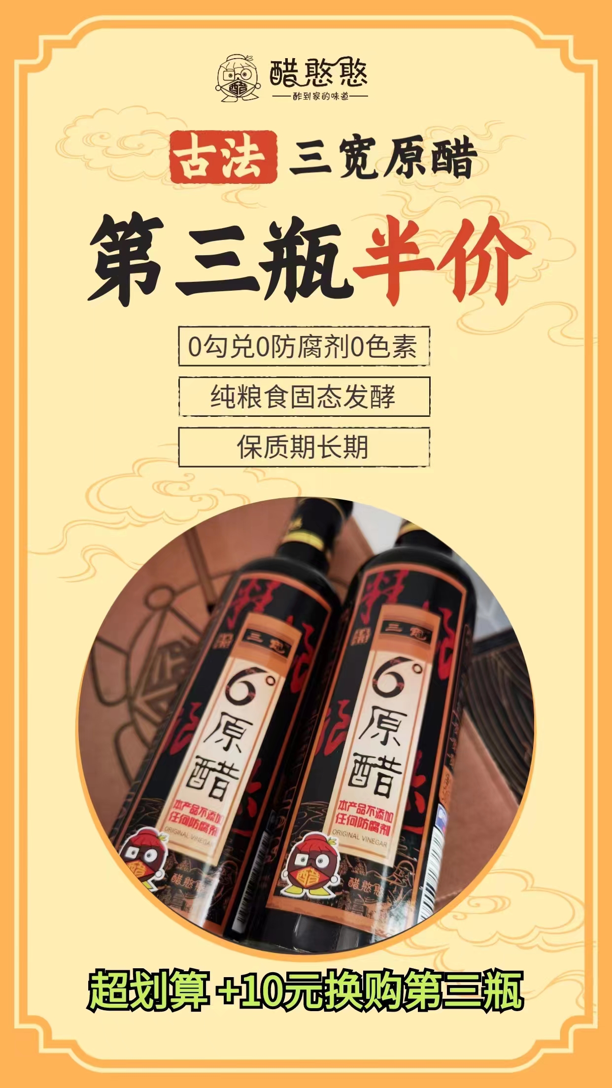 3瓶装特价!地道山西醋【三宽6°原醋】传统手工粮食酿造 绵、酸、香、甜、醇 味道正宗 0添加 更健康