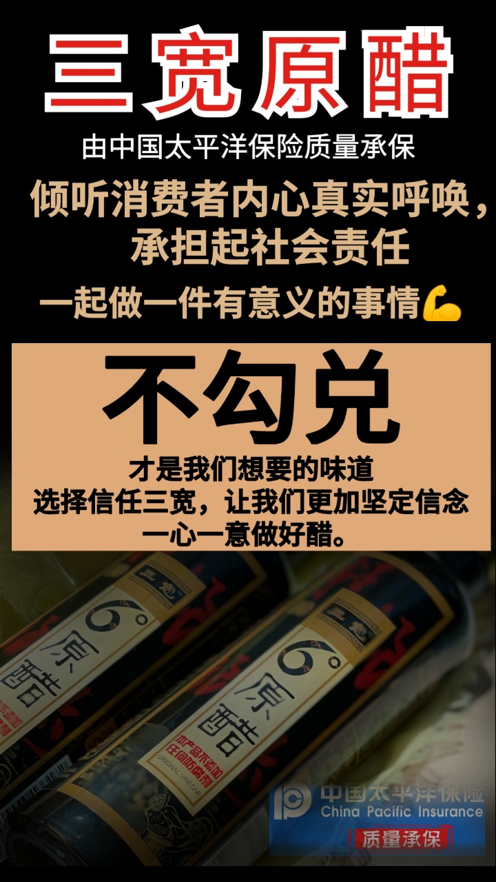 倾听消费者内心真实呼唤,承担起社会责任,不勾兑,才是我们想要的味道,选择信任三宽,让我们更加坚定信念:一心一意做好醋。