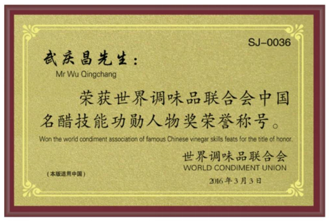 ❹酿造师被授予“世界调味品联合会中国名醋技能功勋人物”荣誉称号