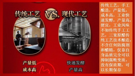 古法制醋,手工酿造,产量低,成本高,咱们三宽醋是头道醋,味纯,品质高。